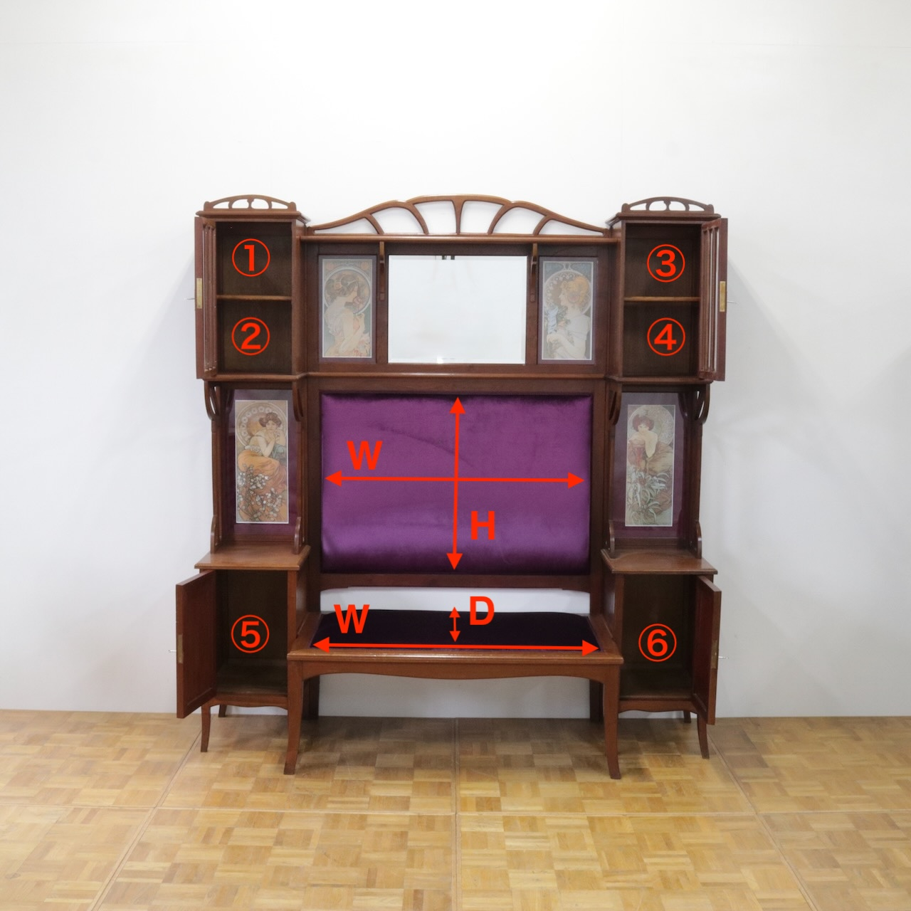 ベンチとキャビネットが一体となった珍しい造りです。アール・ヌーヴォーらしい優雅な曲線パーツがアクセントになった美しい佇まい。エントランスに華やかな個性を与えてくれるデザインです。