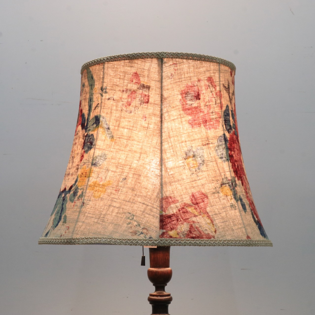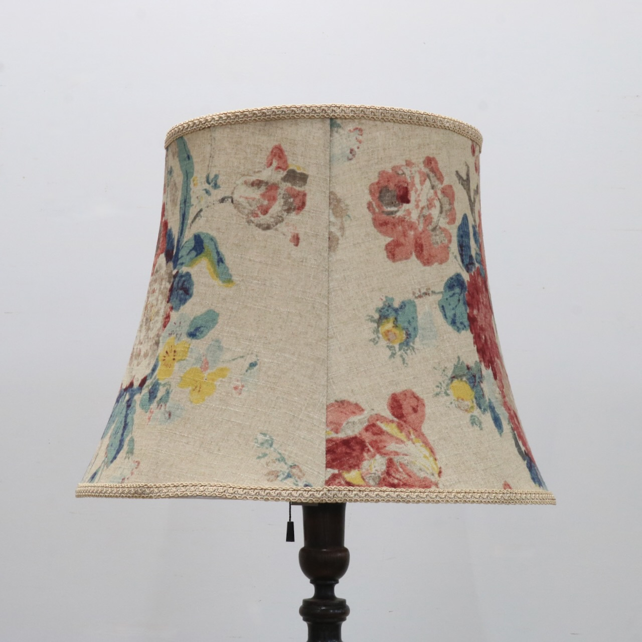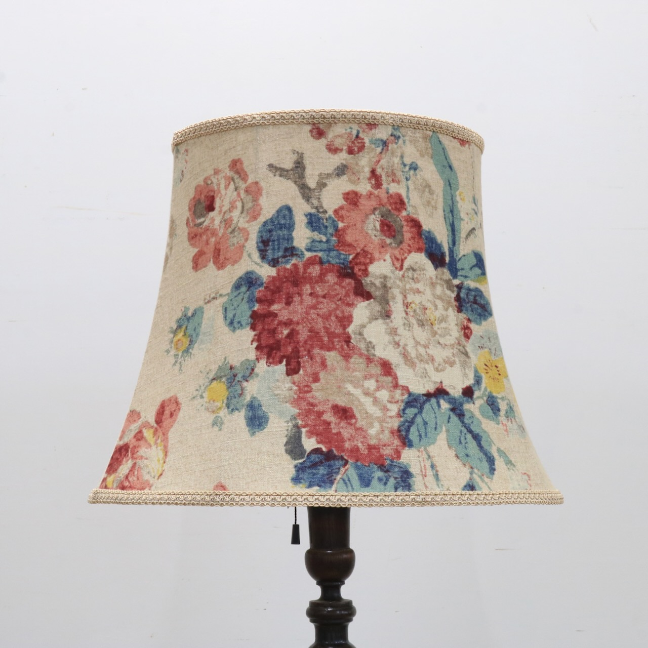 アンティーク感のある生成色の地に、水彩画のようなタッチで描かれた花が印象的なファブリックを用い製作したランプシェードです。