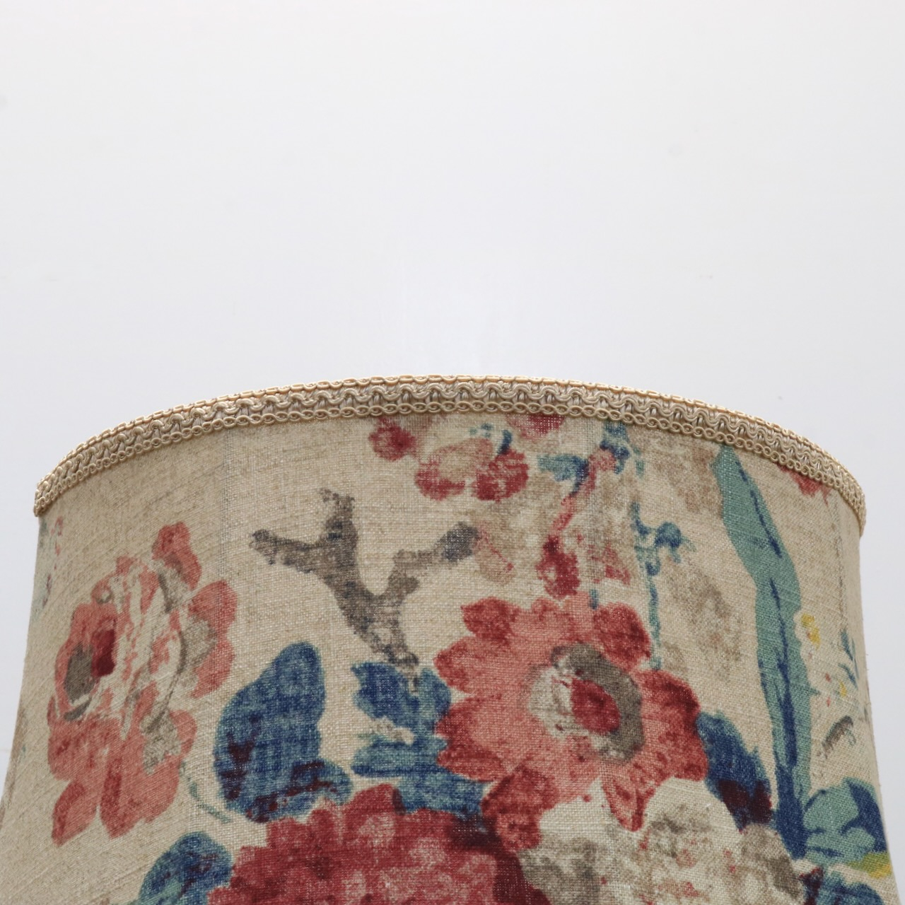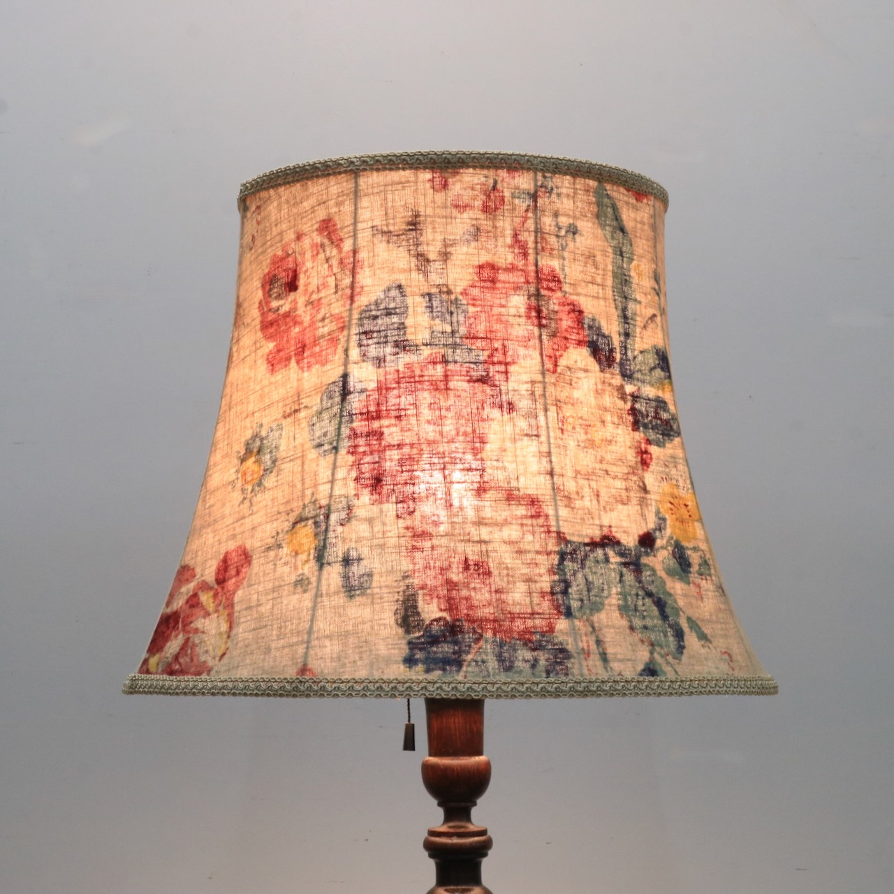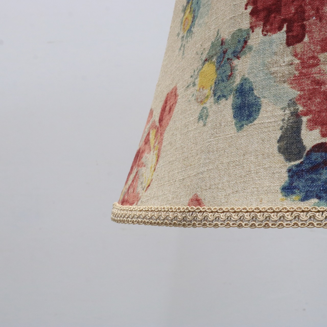 アンティーク感のある生成色の地に、水彩画のようなタッチで描かれた花が印象的なファブリックを用い製作したランプシェードです。