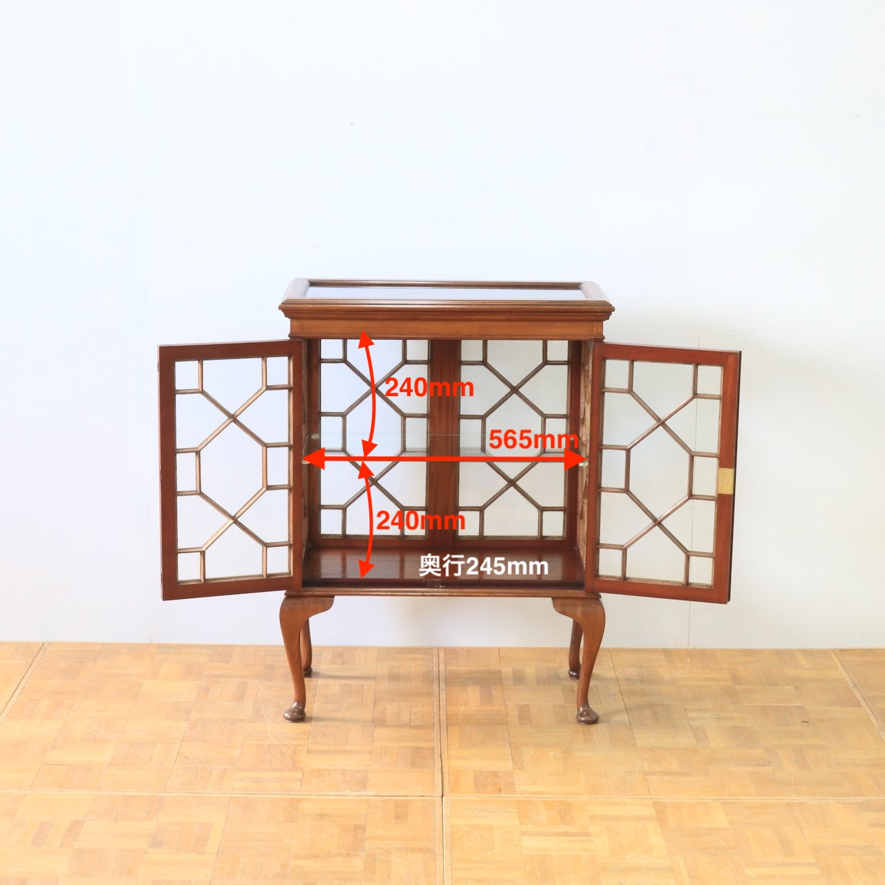 メインのキャビネット部分は四方がガラスなので中が明るく、また壁につけて置かなくても美しく飾ることができます。