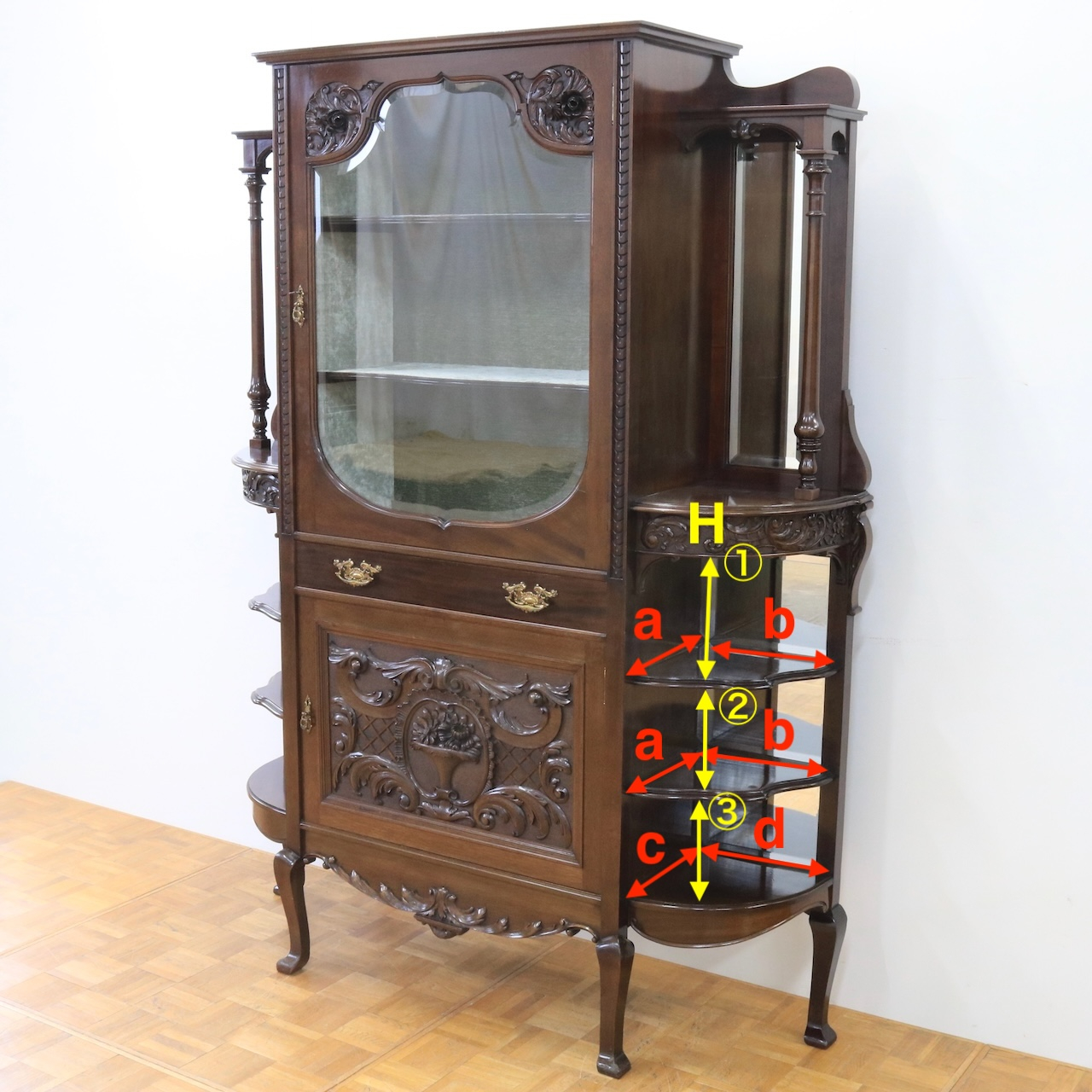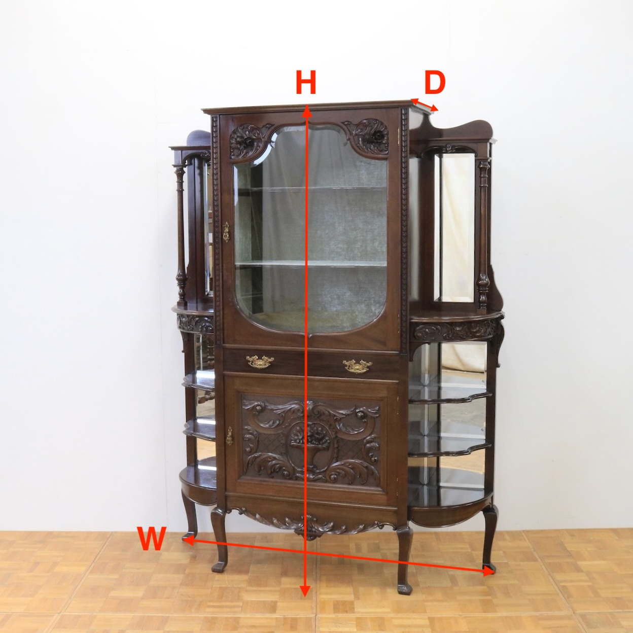 1910年代、マホガニーのパーラーキャビネット。各所に贅沢に施された彫刻に目を見張ります。リビングのメインに相応しい華やかな佇まい。扉収納とオープン棚の組み合わせで、飾り方のバリエーションも豊かです。