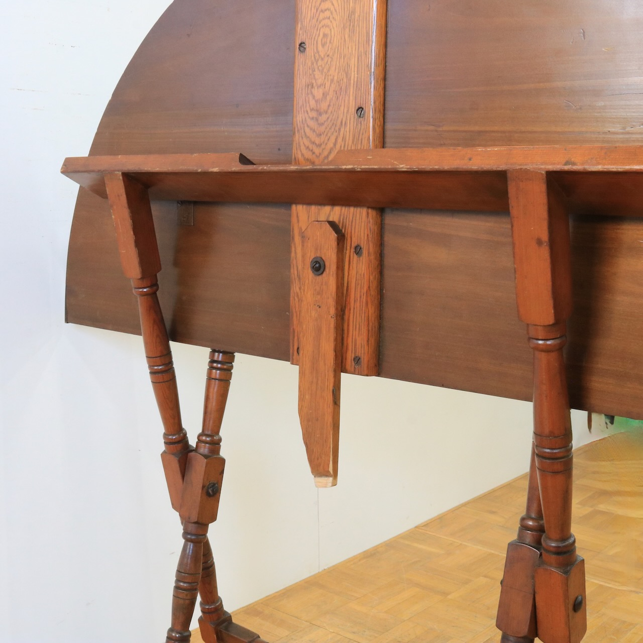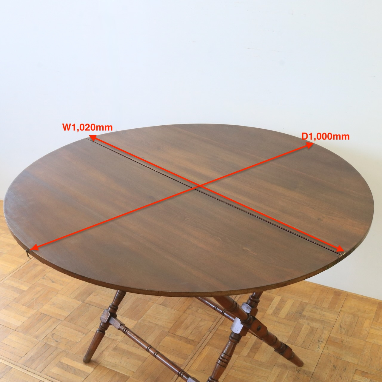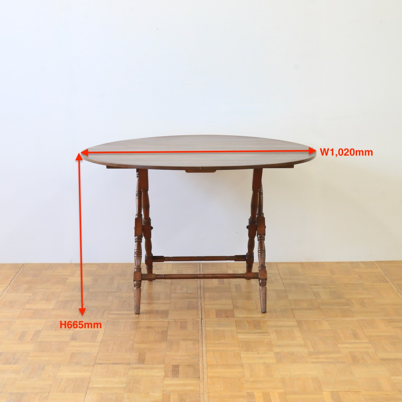 配送料の目安 ▶︎1890年代、マホガニー材のアンティークフォールディングテーブル。丸いシンプルなティーテーブルですが、使わないときにはパタンと半分に折ってしまっておける優れもの。ヴィクトリアンらしい挽物加工のアクセントが入った脚も印象的です。