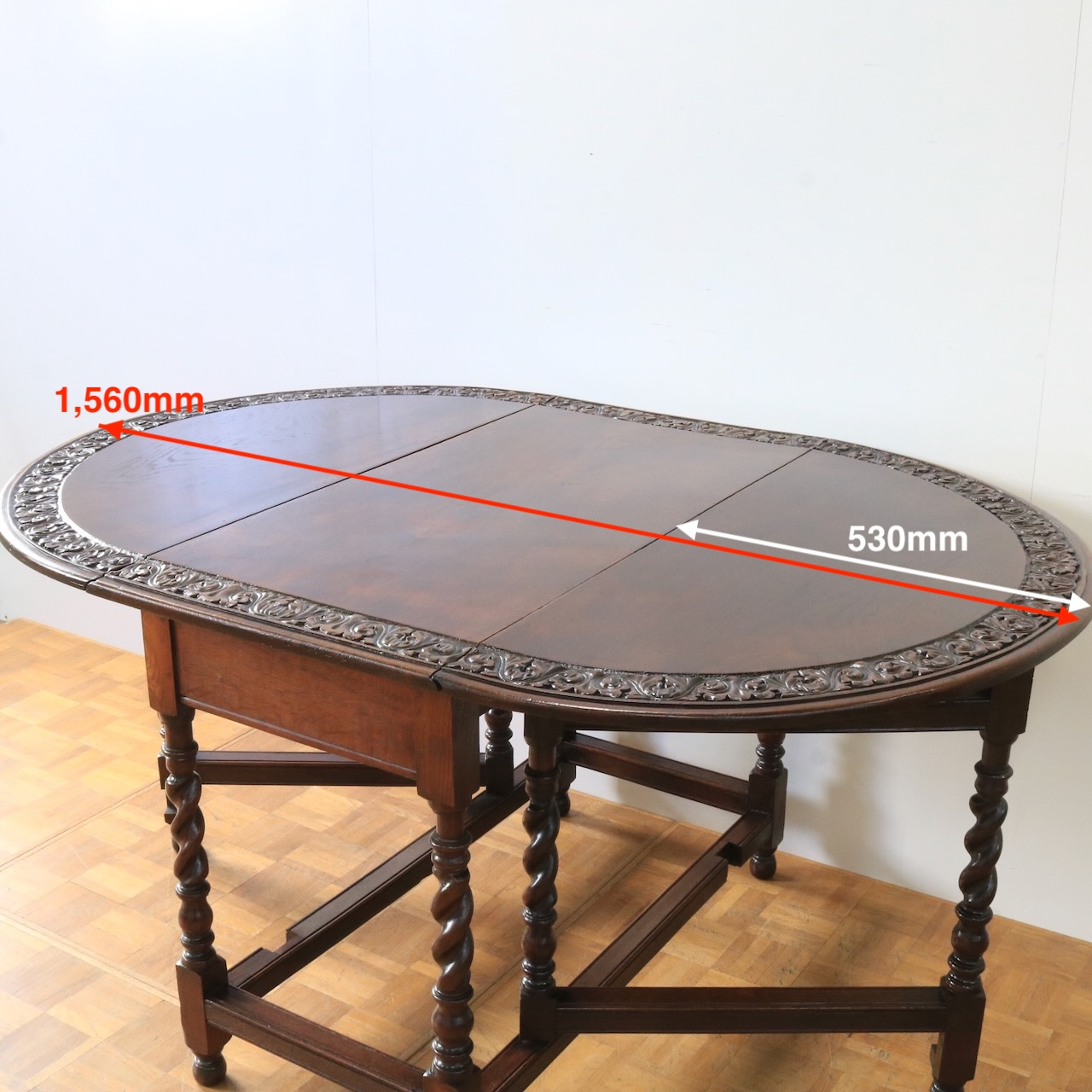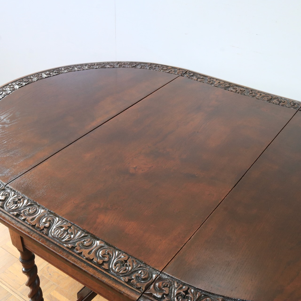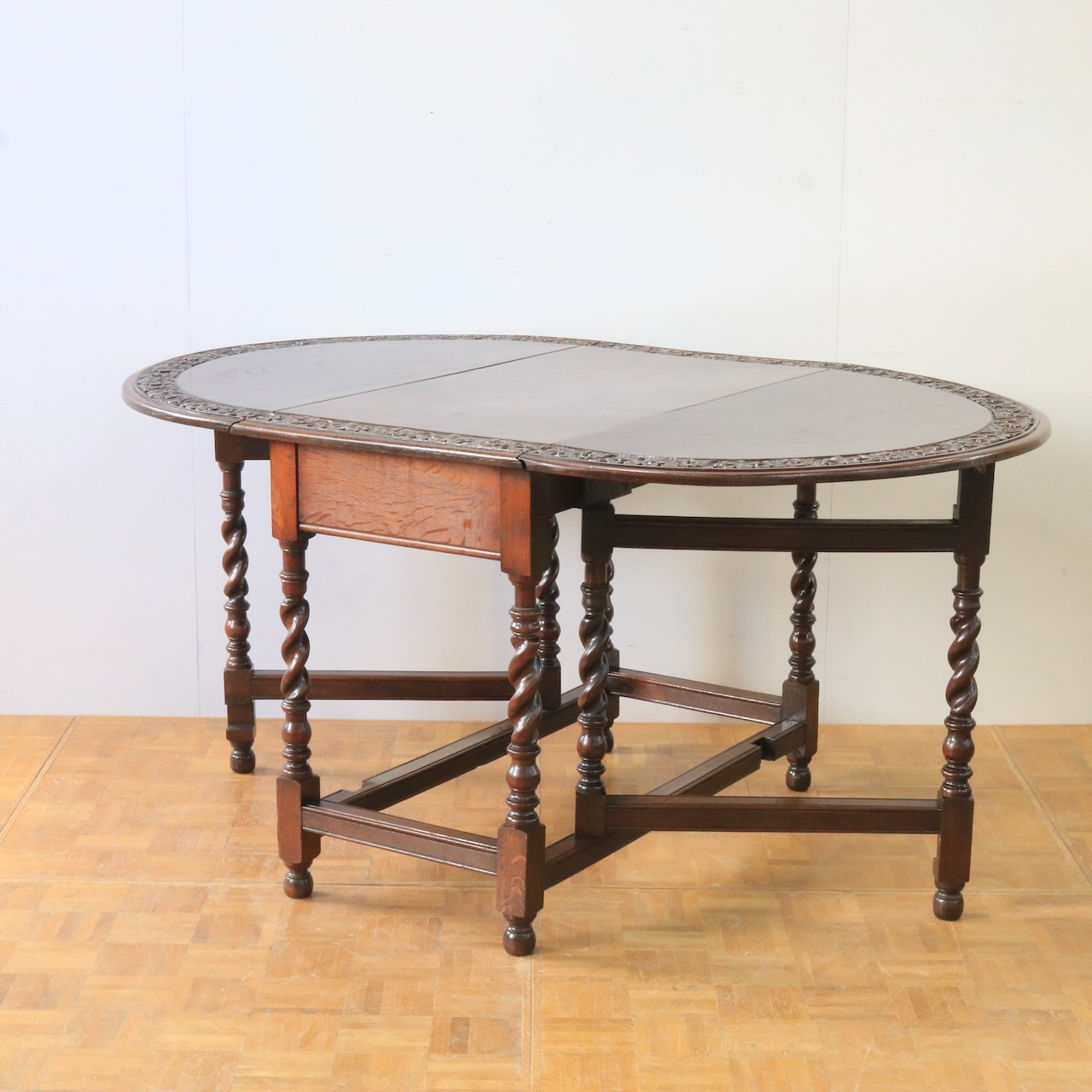 フチの植物紋様の彫刻がオーク材らしい重厚感を引き立たせ、アンティークならではの深い存在感があります。