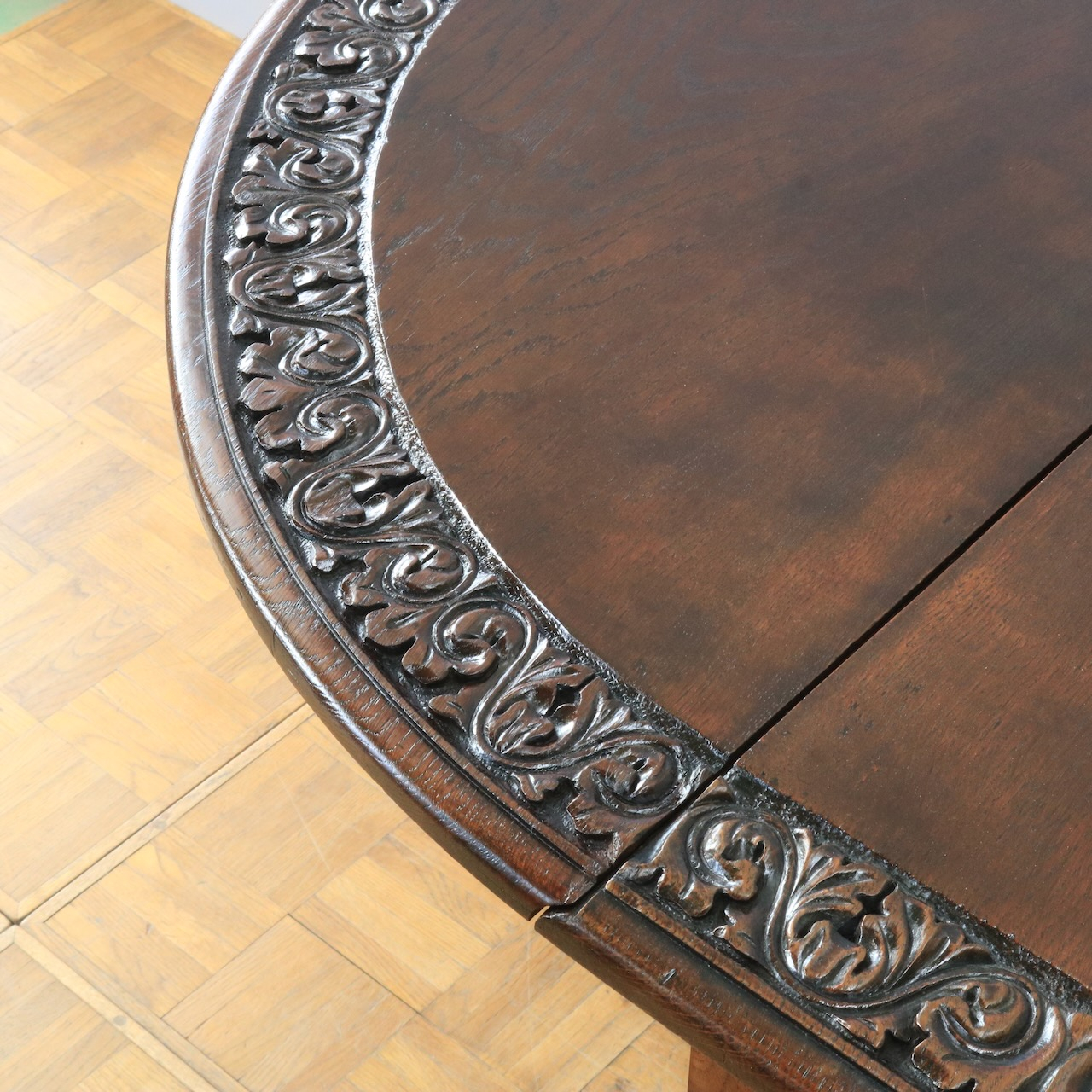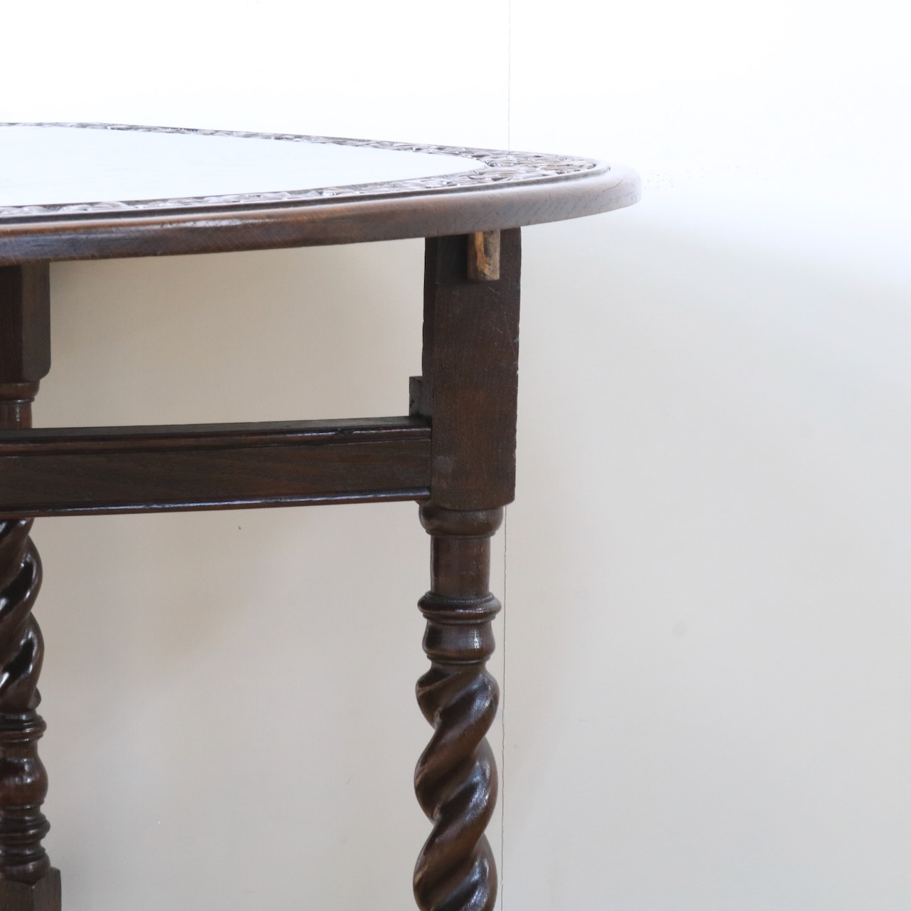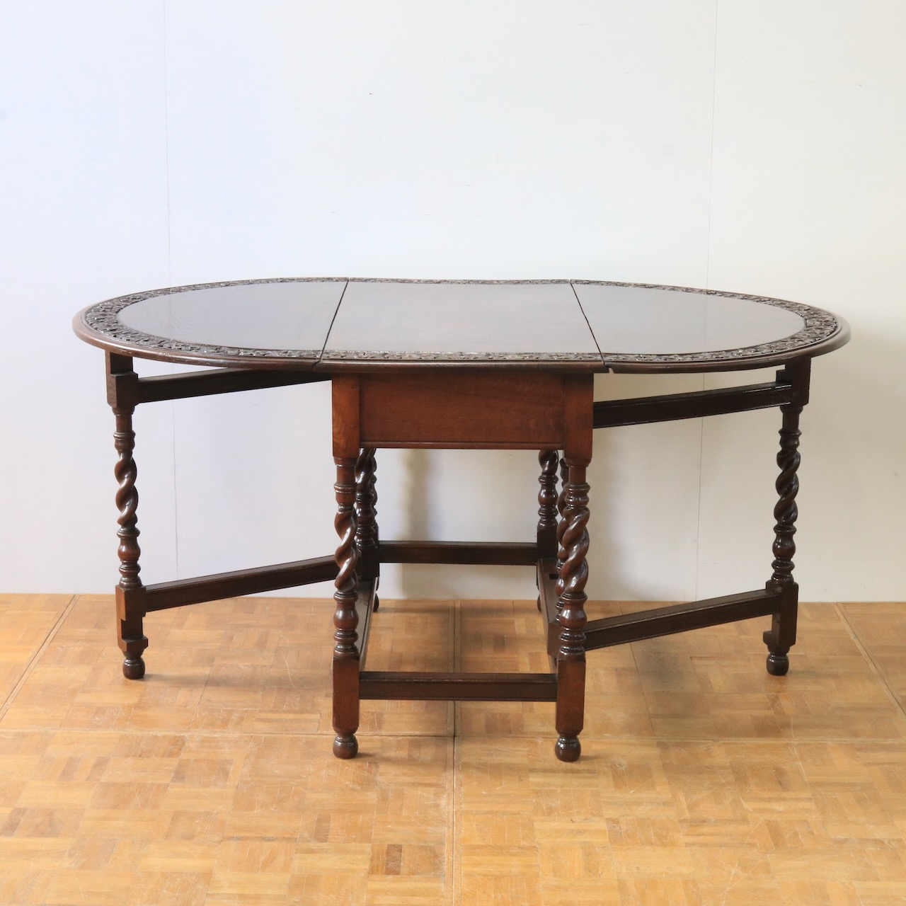 フチの植物紋様の彫刻がオーク材らしい重厚感を引き立たせ、アンティークならではの深い存在感があります。