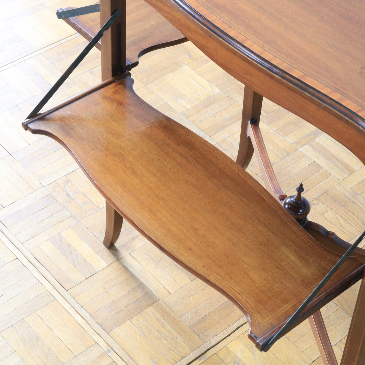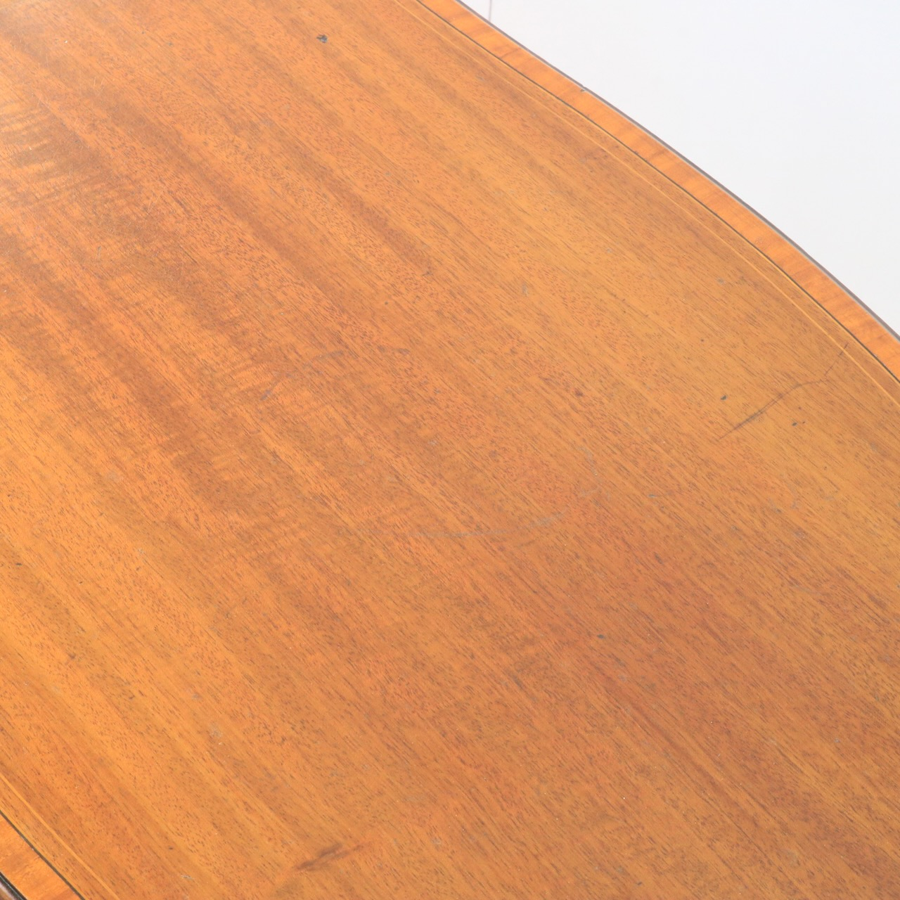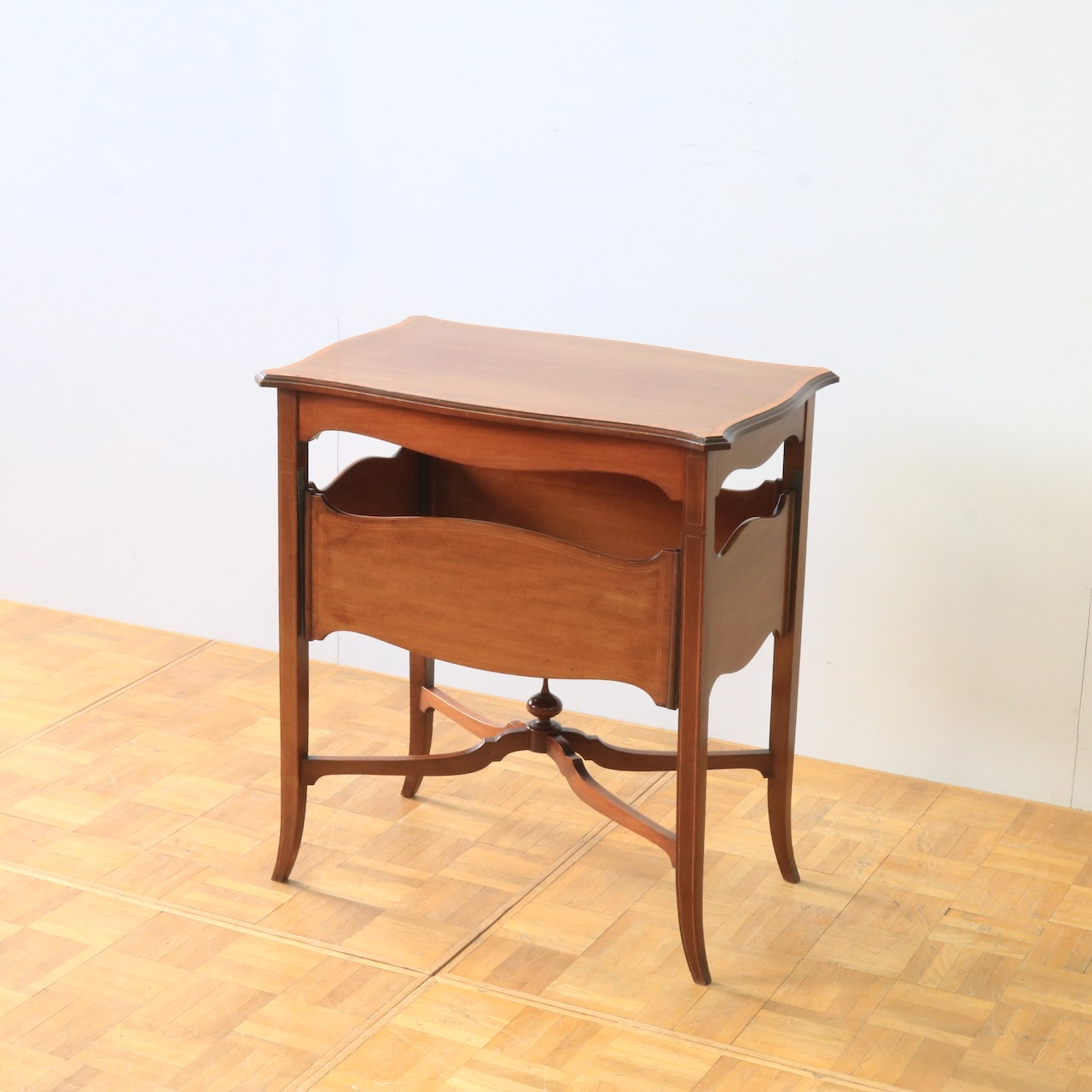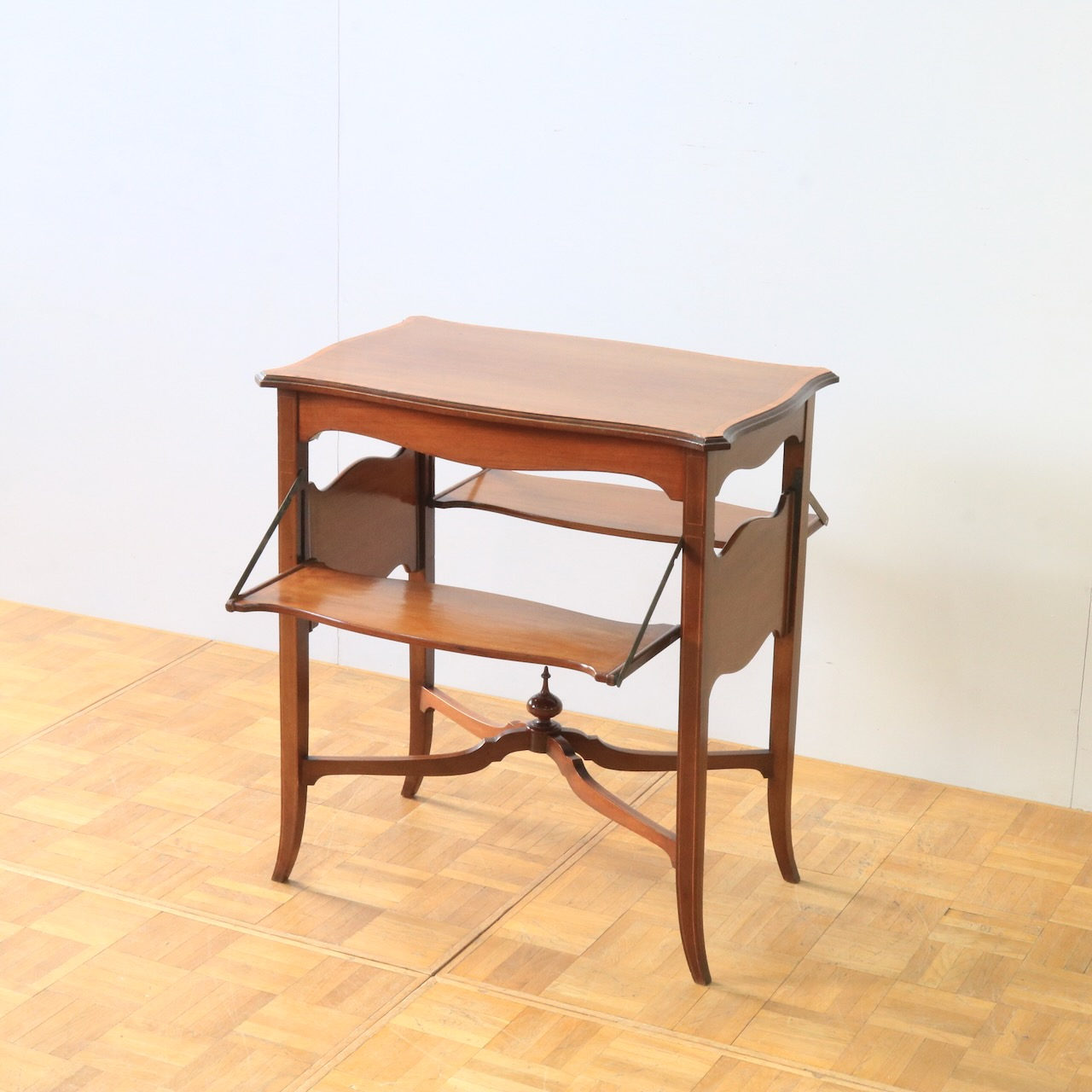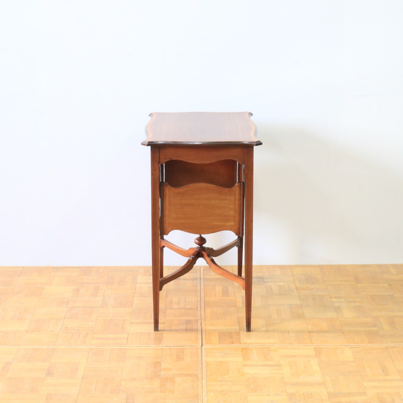 天板はマホガニーらしい赤みがかった上品な風合い。緩やかな曲線を描く縁もアンティークらしい優美な佇まいです。