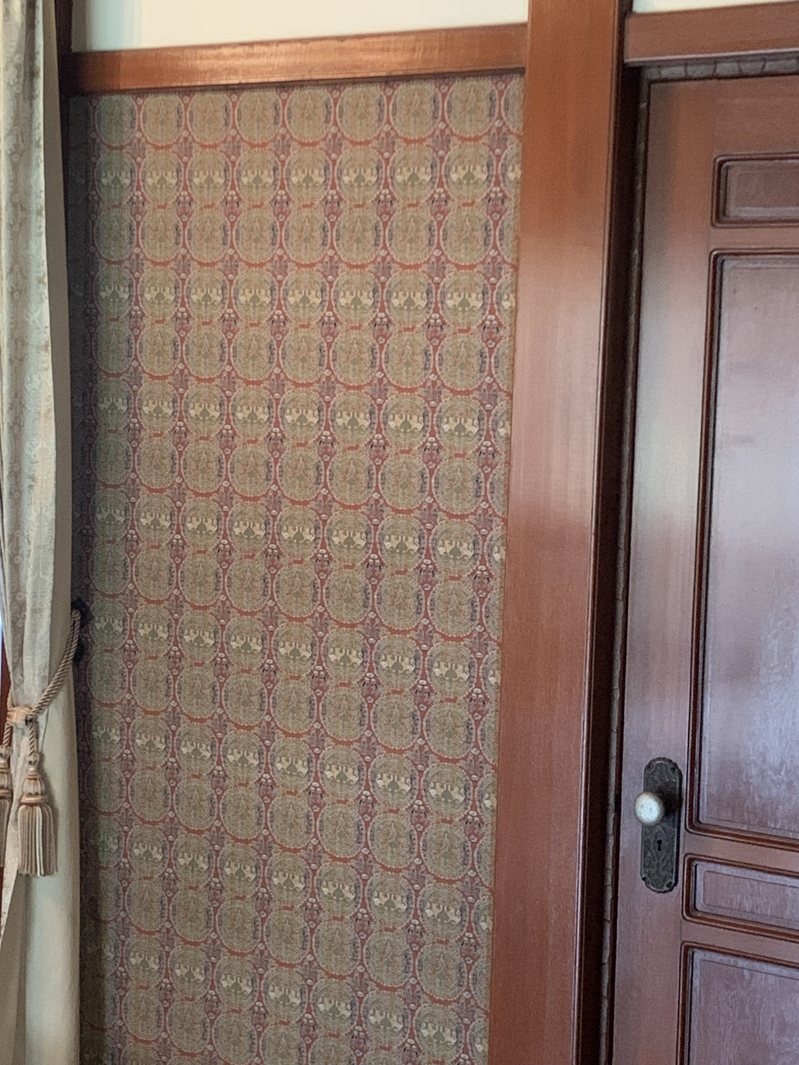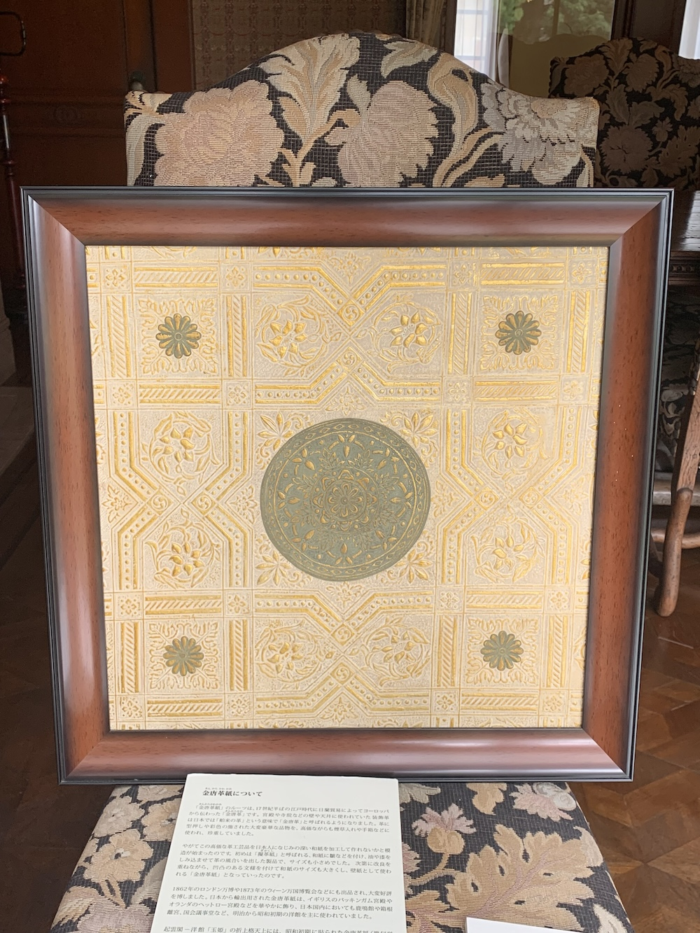 格子状の天井に使用されているのは「金唐革紙」という貴重な壁紙。金唐革紙はロンドンやウィーンの万博で出品され好評を博したそうで、日本から輸出された金唐革紙はバッキンガム宮殿などにも使用されているそうです。