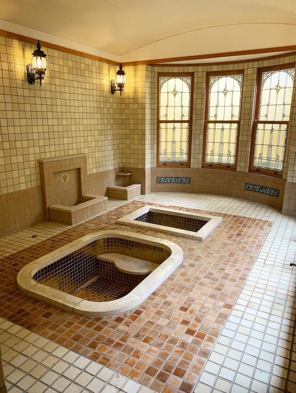 例えばチューダー様式を基とした「玉渓の間」のチーク材を手作業で掘った壁や柱、「金剛の間」にさり気なく施されたスペード・ハート・ダイヤ・クローバー模様の螺鈿細工、ローマ風風呂などなど。