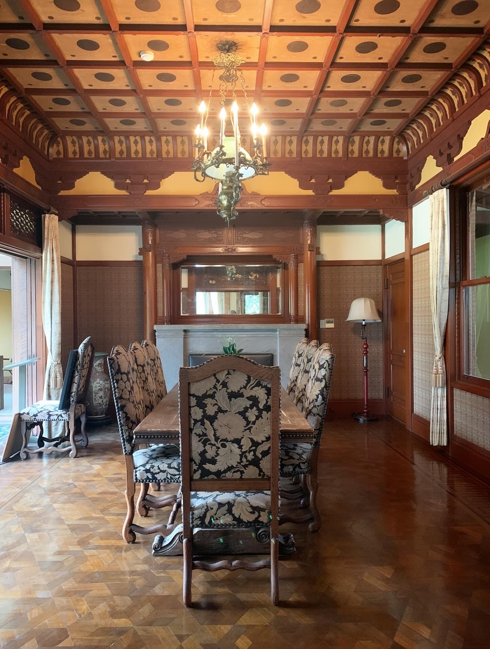 暖炉のある洋室ですが、神社仏閣に見られる「折上格天上」という建築様式や壁紙に西陣織が使用されたりと和の設も感じられます。更にそこに当時流行していた中国の装飾が加わり、小さな空間に和洋中が見事に調和した固有の空間が広がります。