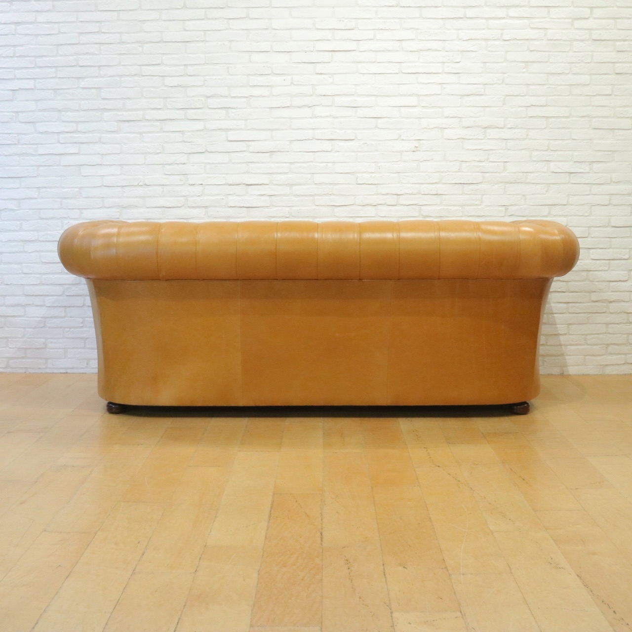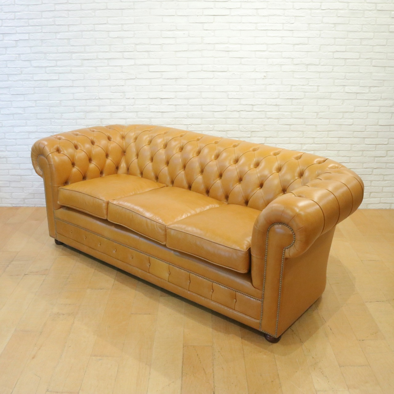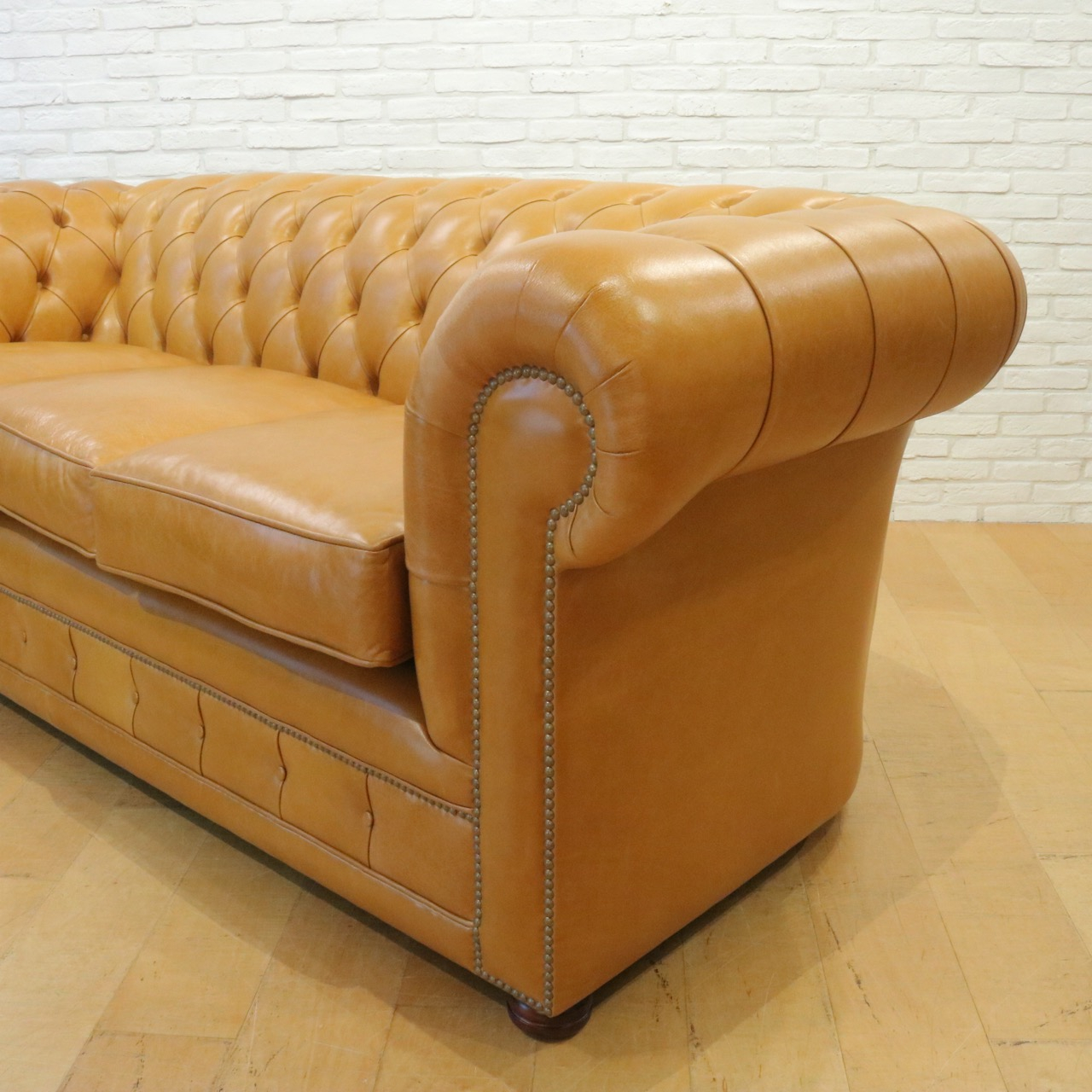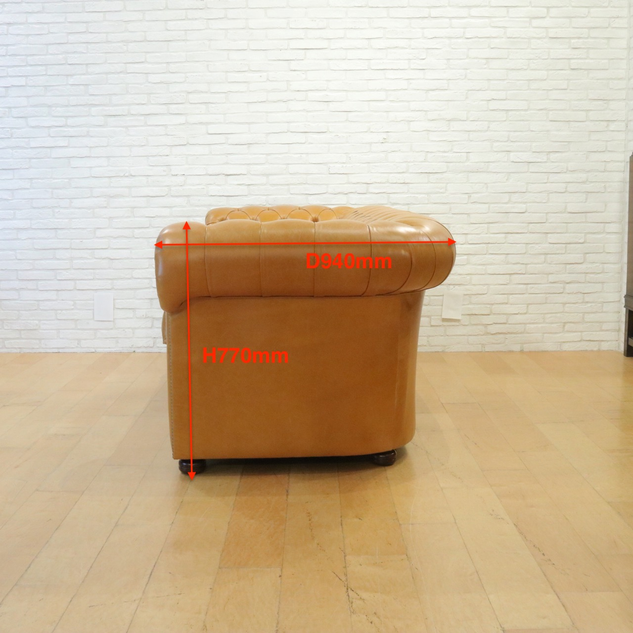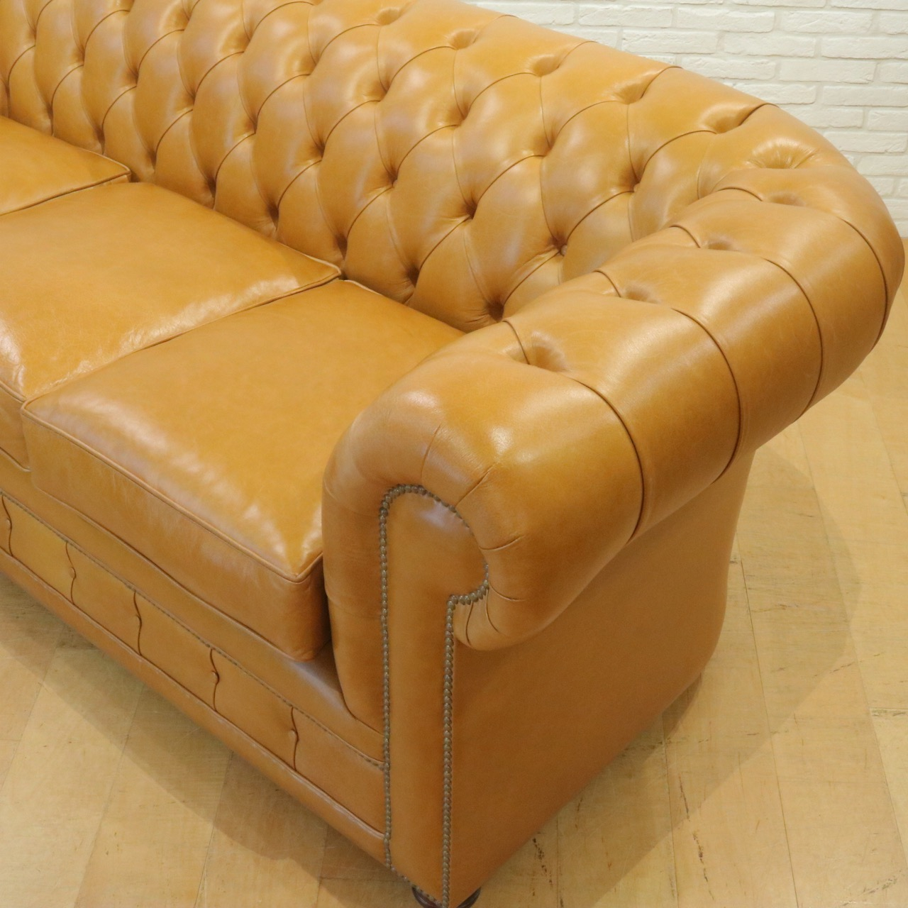イギリス発祥のチェスターフィールドソファー。総革張りの鋲飾りが付いたボタン留めのソファーはアンティーク愛好家のみならず、広く愛されているデザイン。重厚感のあるデザインながらも、キャメル色のレザーがお部屋を明る演出し、モダンなインテリアとの相性も良いです。