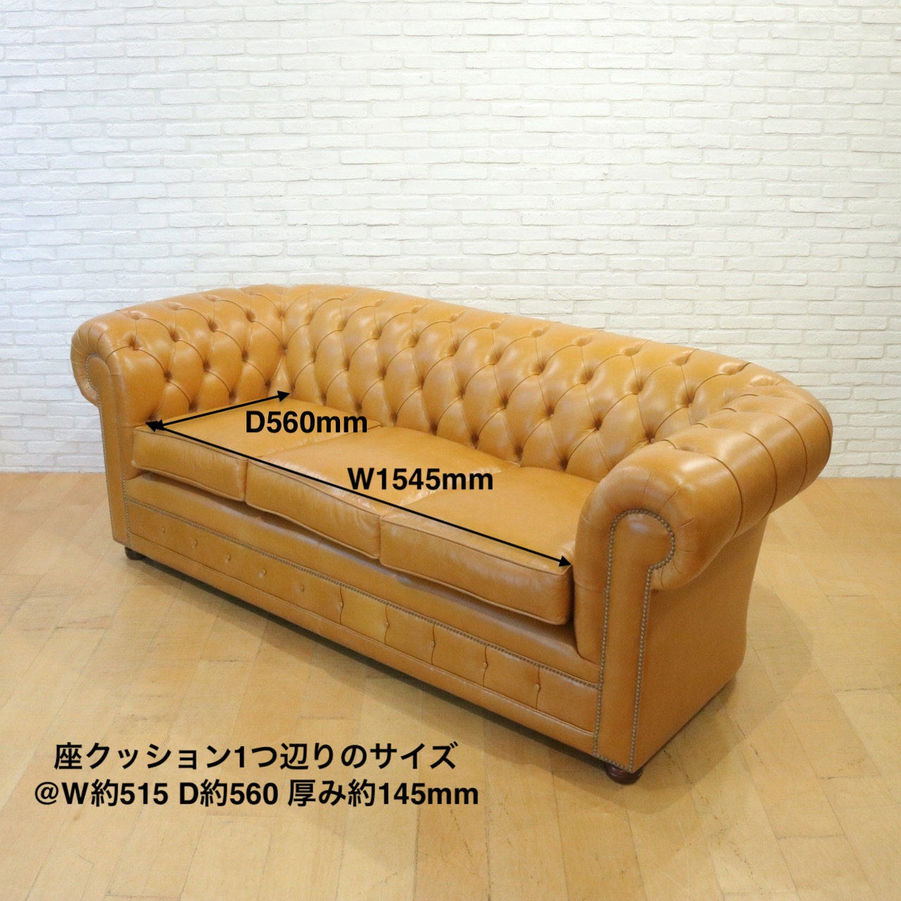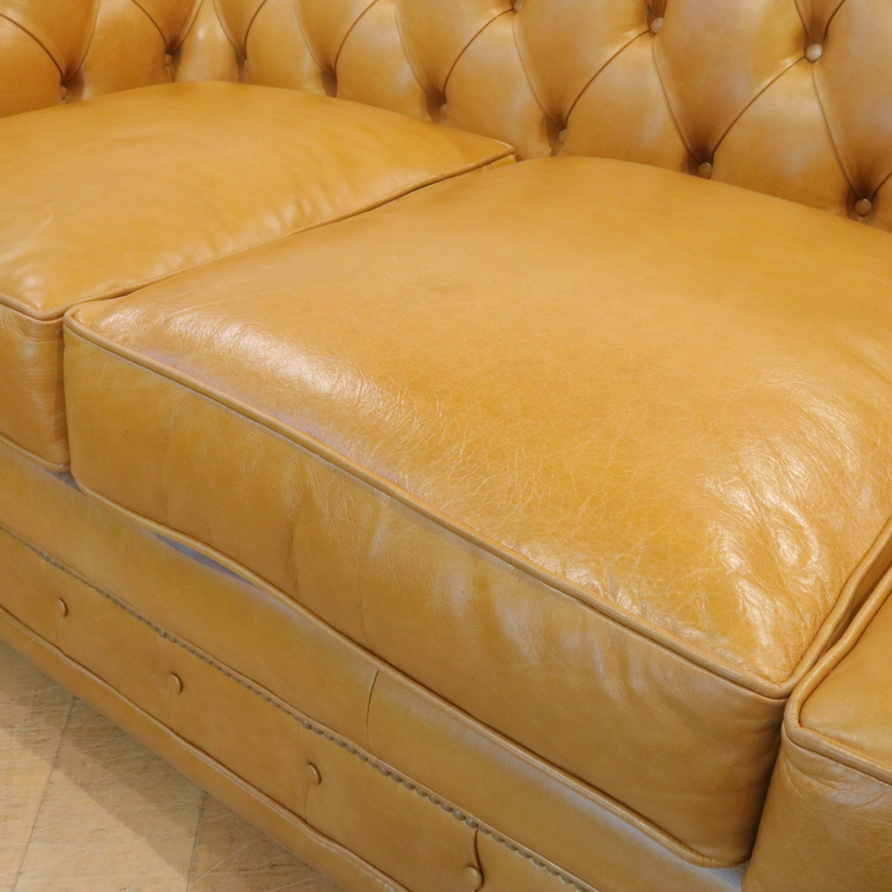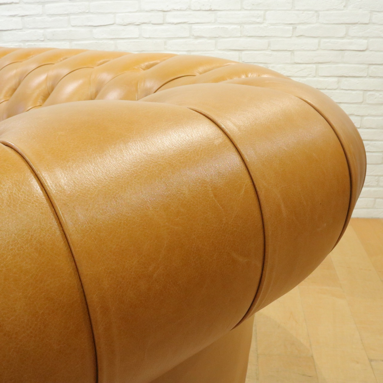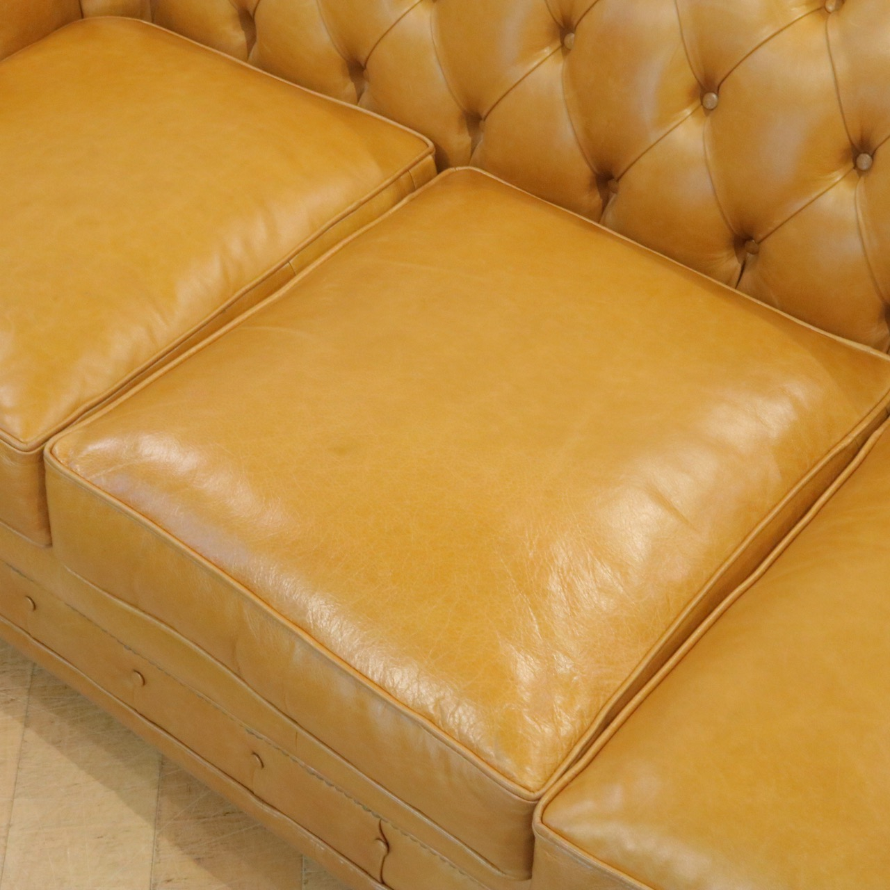 イギリス発祥のチェスターフィールドソファー。総革張りの鋲飾りが付いたボタン留めのソファーはアンティーク愛好家のみならず、広く愛されているデザイン。重厚感のあるデザインながらも、キャメル色のレザーがお部屋を明る演出し、モダンなインテリアとの相性も良いです。