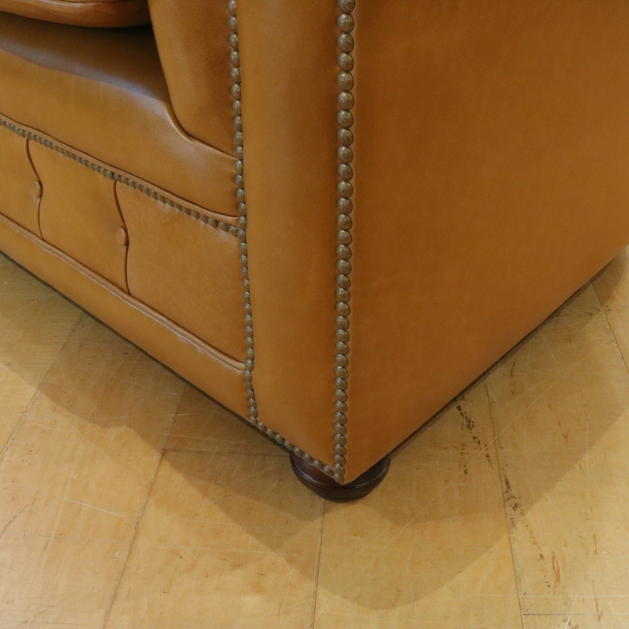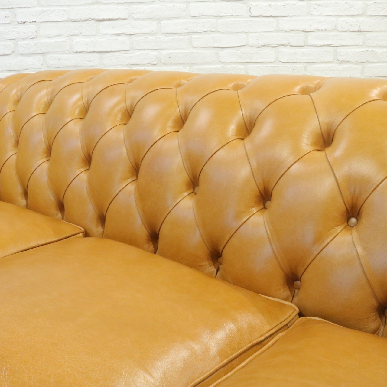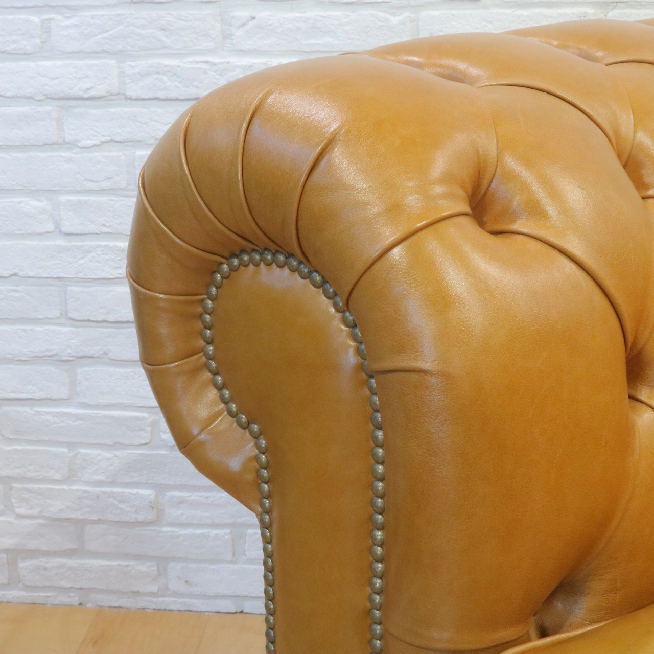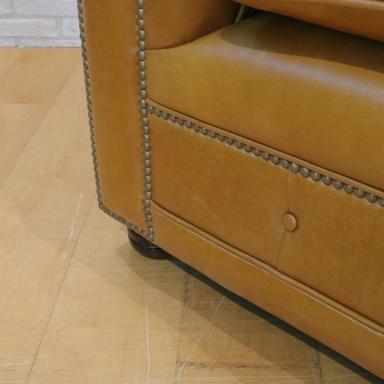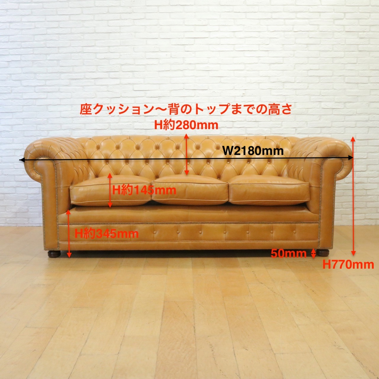 イギリス発祥のチェスターフィールドソファー。総革張りの鋲飾りが付いたボタン留めのソファーはアンティーク愛好家のみならず、広く愛されているデザイン。重厚感のあるデザインながらも、キャメル色のレザーがお部屋を明る演出し、モダンなインテリアとの相性も良いです。