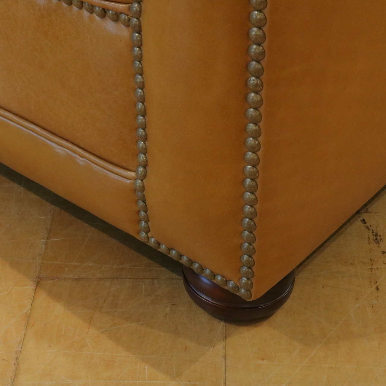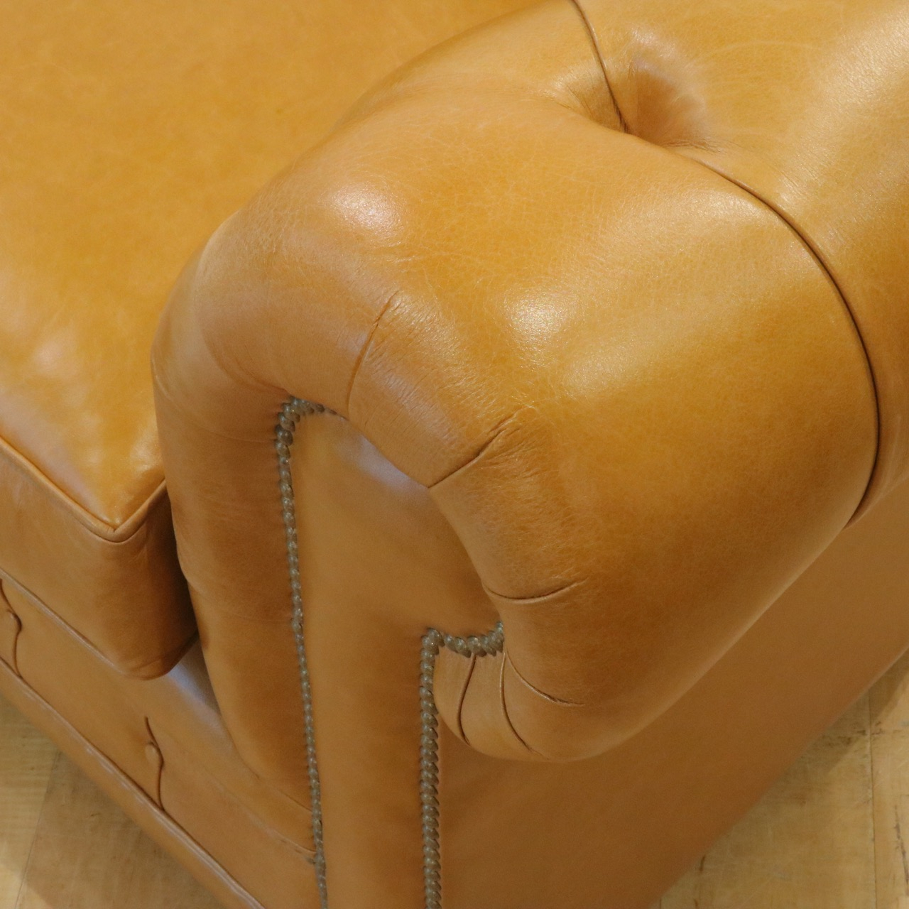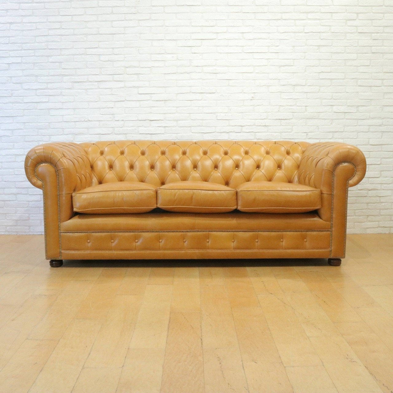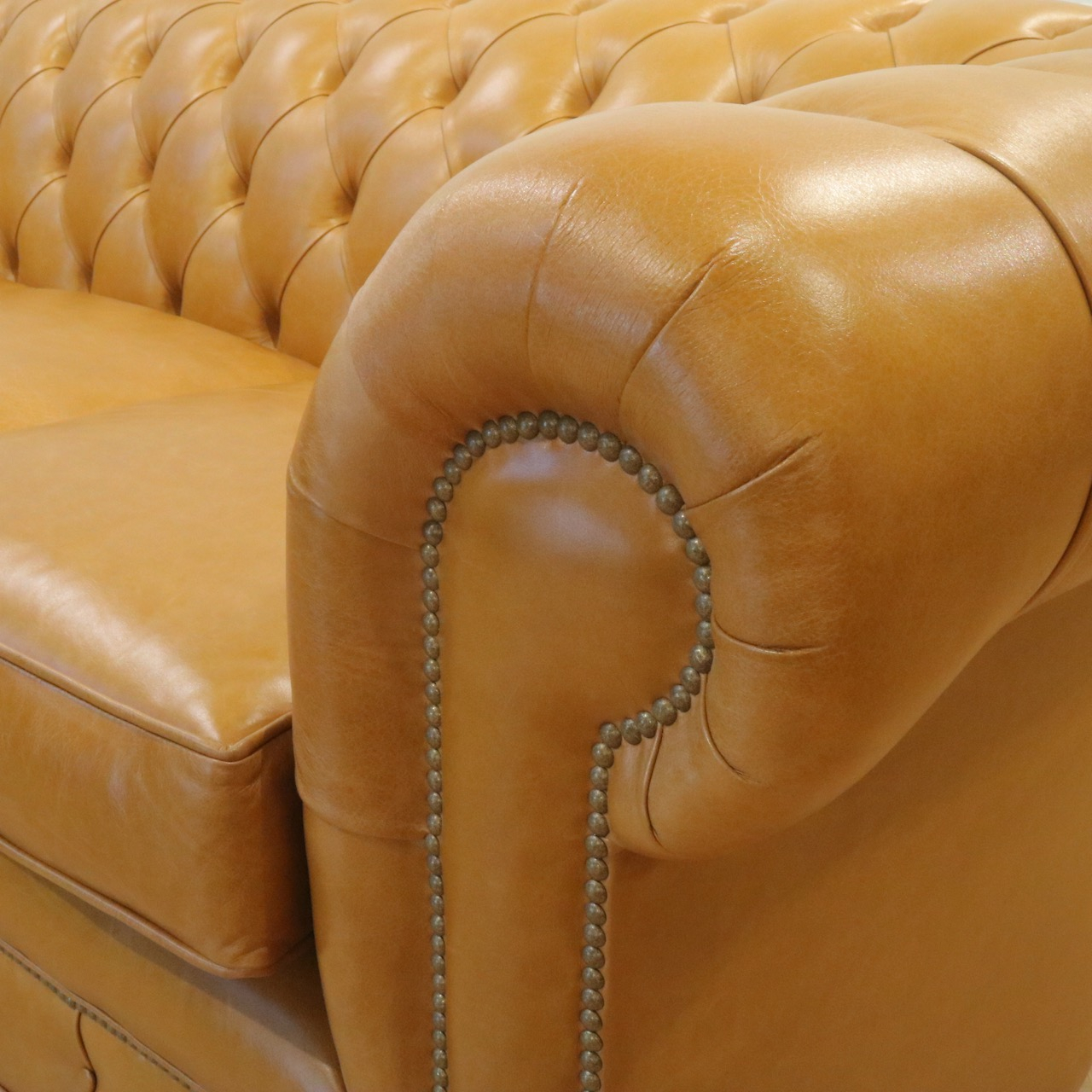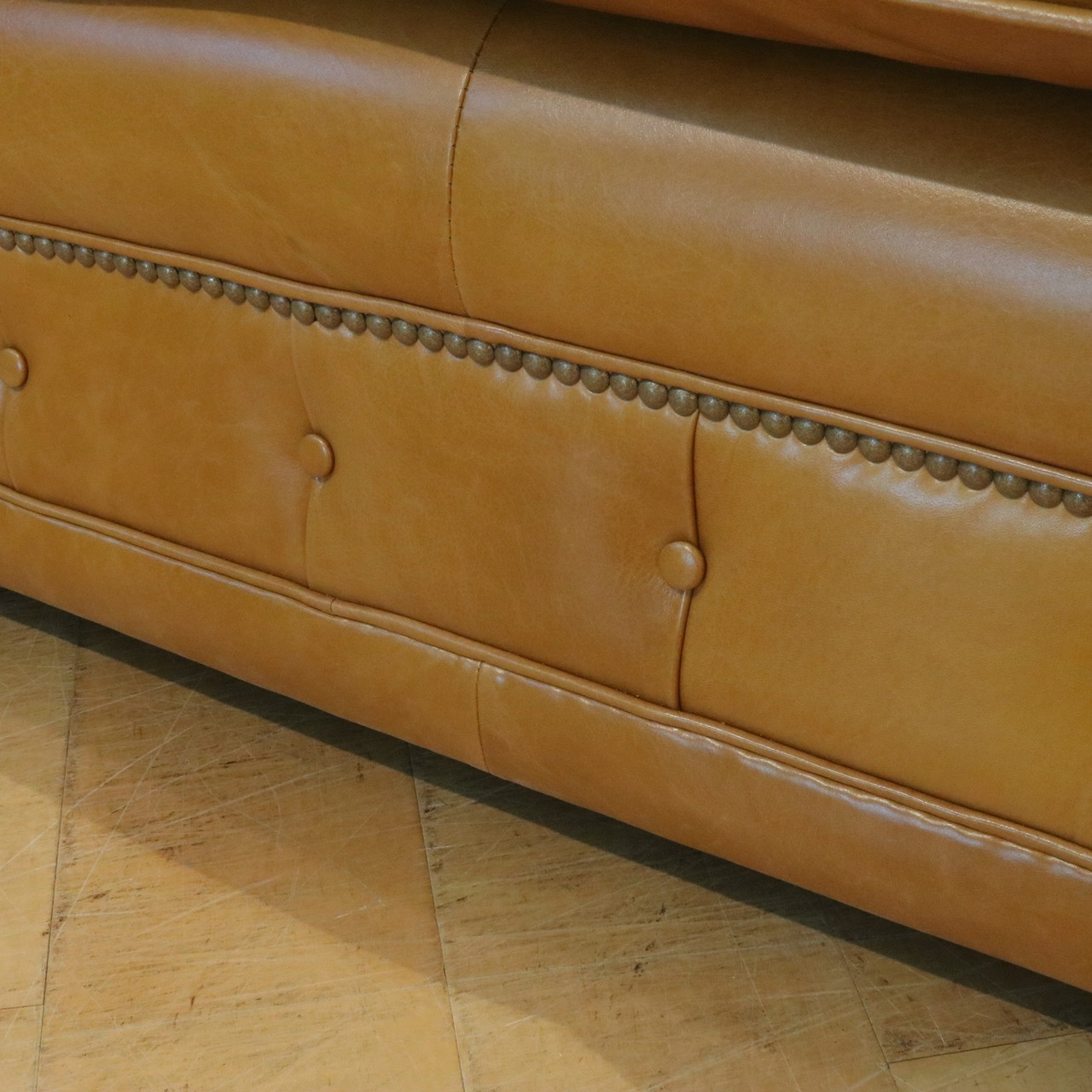 イギリス発祥のチェスターフィールドソファー。総革張りの鋲飾りが付いたボタン留めのソファーはアンティーク愛好家のみならず、広く愛されているデザイン。重厚感のあるデザインながらも、キャメル色のレザーがお部屋を明る演出し、モダンなインテリアとの相性も良いです。