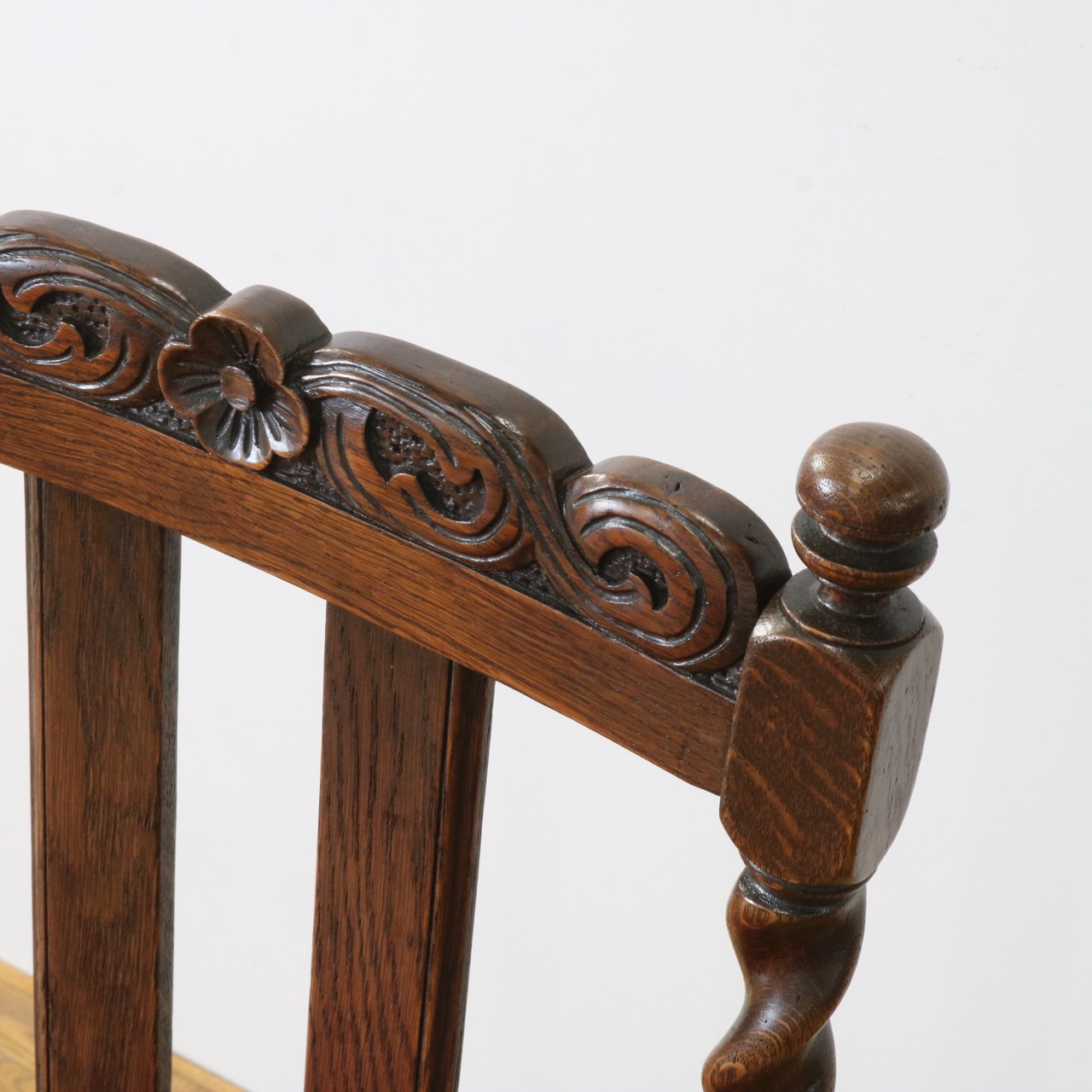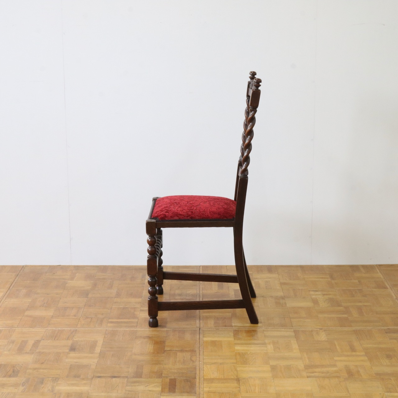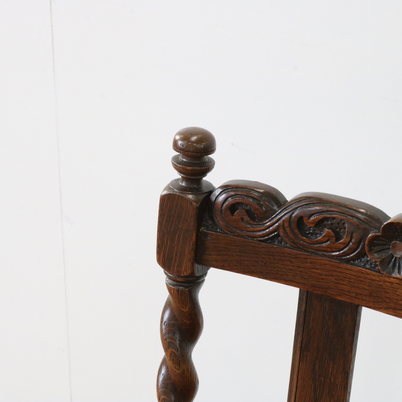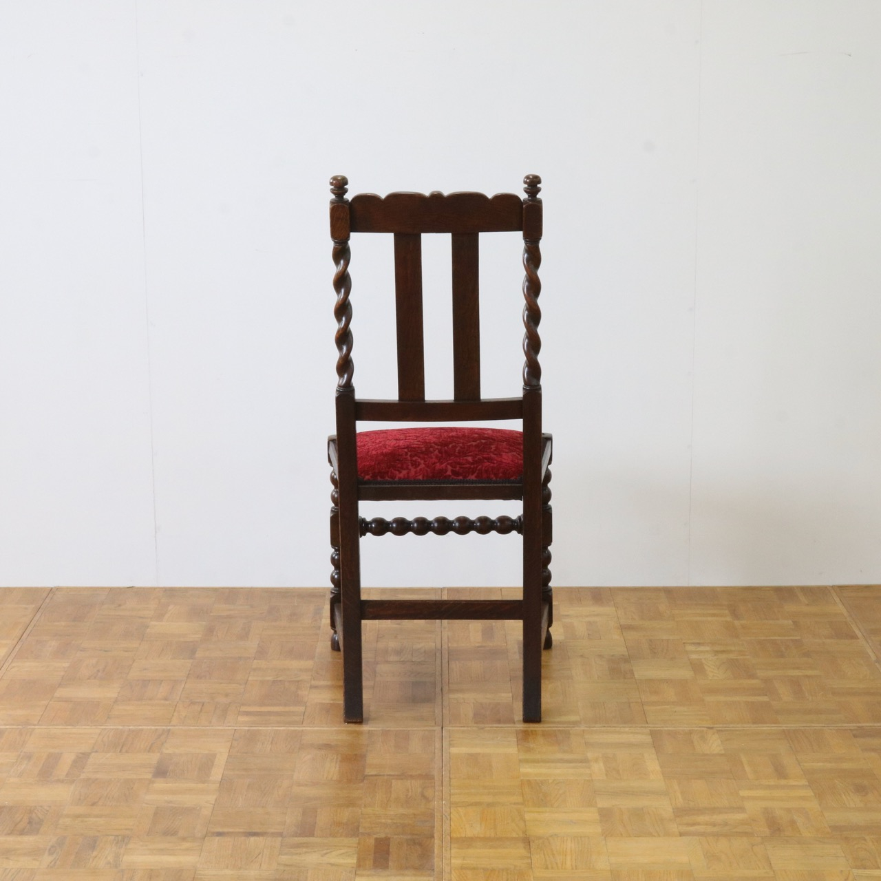配送料の目安 ▶︎1920年代のオークチェアー。ツイストが特徴的な背もたれ、お団子のようなボビンターニングのデザインがかわいらしさも感じさせる脚元のストレッチャーなど、アンティークらしい意匠にあふれたチェアーです。