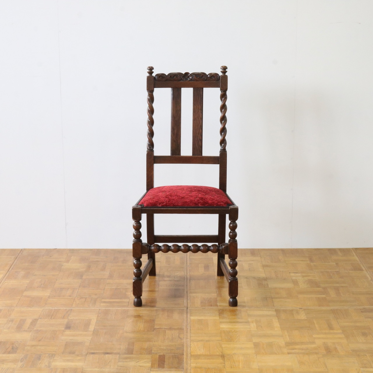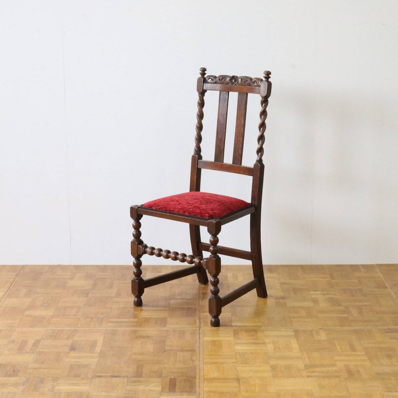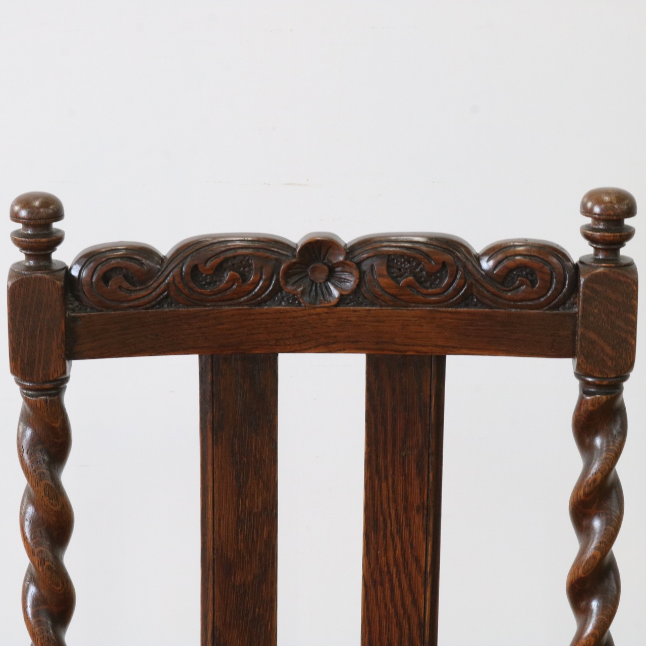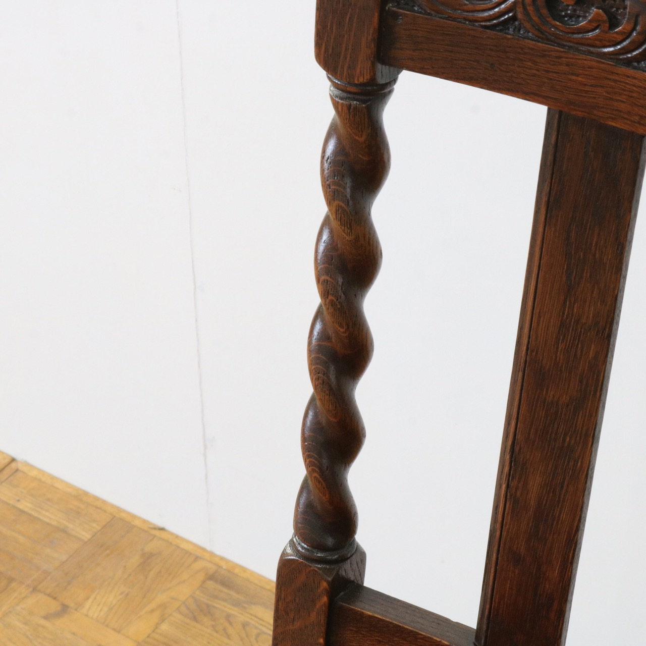 配送料の目安 ▶︎1920年代のオークチェアー。ツイストが特徴的な背もたれ、お団子のようなボビンターニングのデザインがかわいらしさも感じさせる脚元のストレッチャーなど、アンティークらしい意匠にあふれたチェアーです。