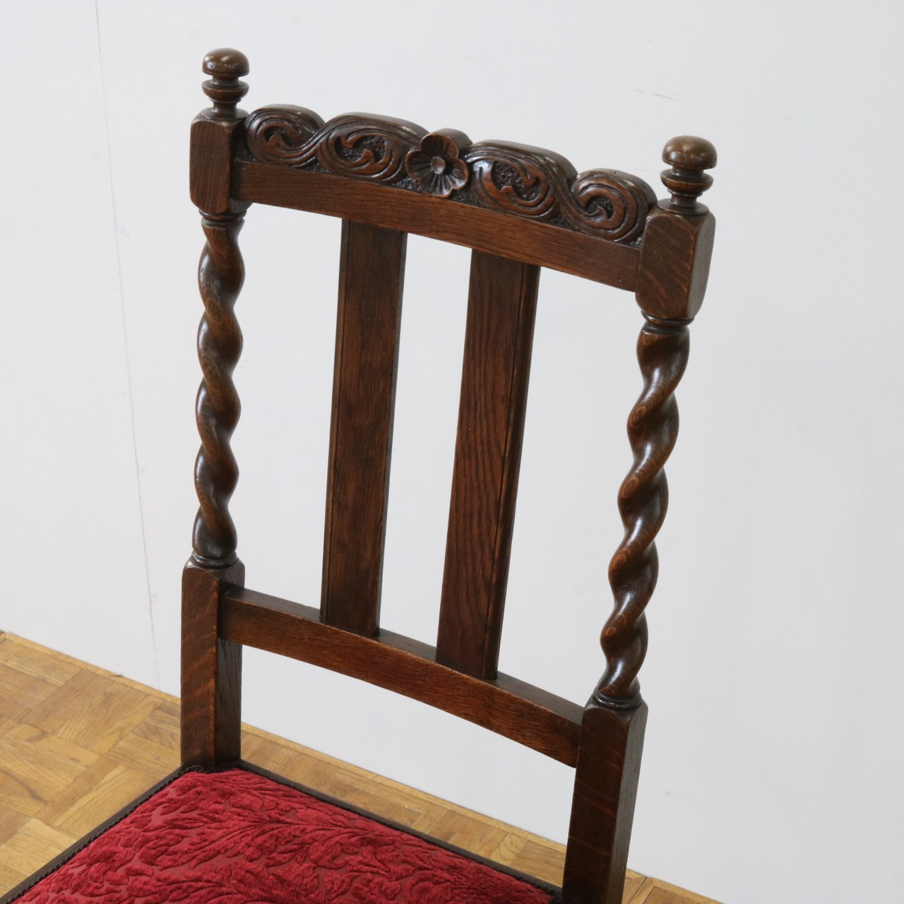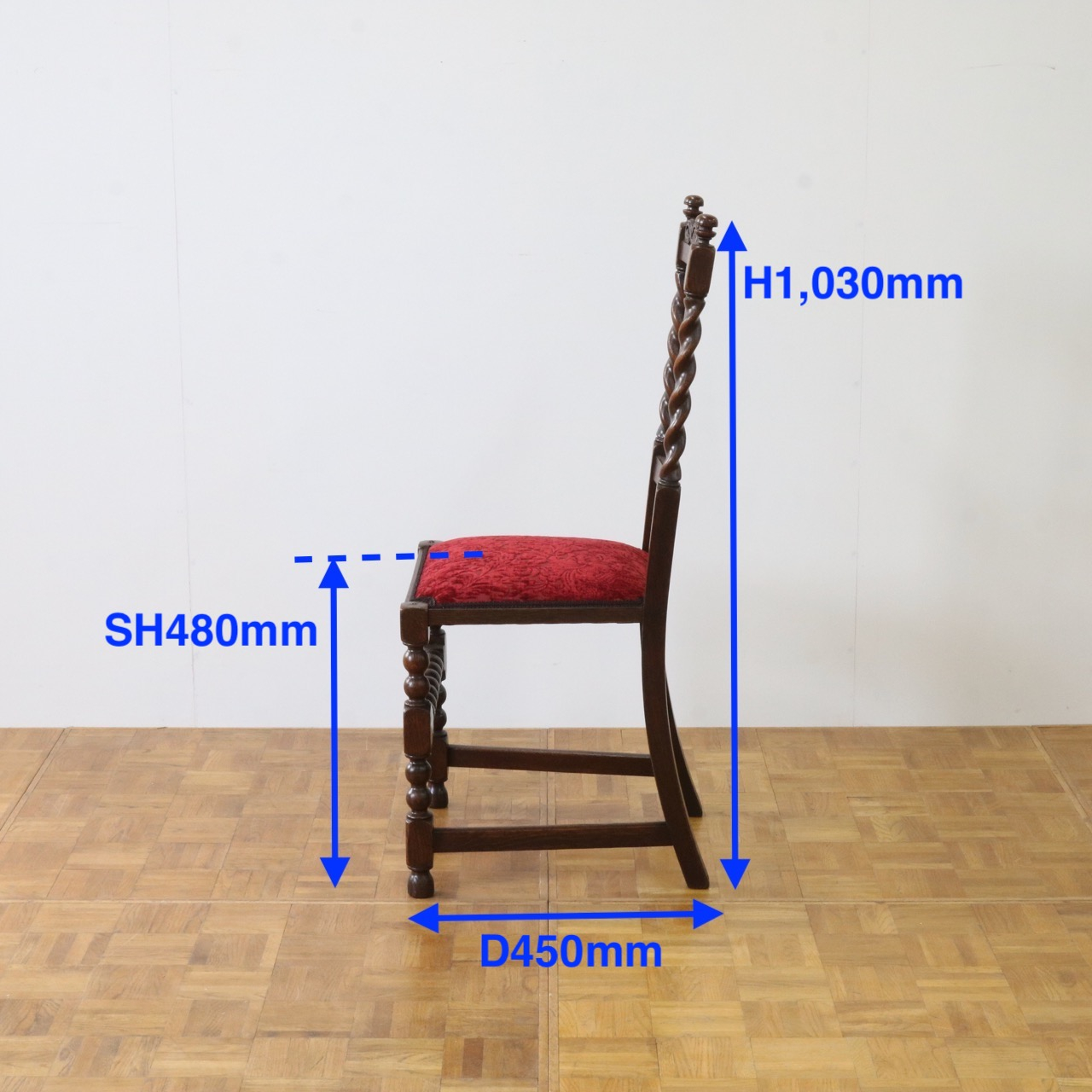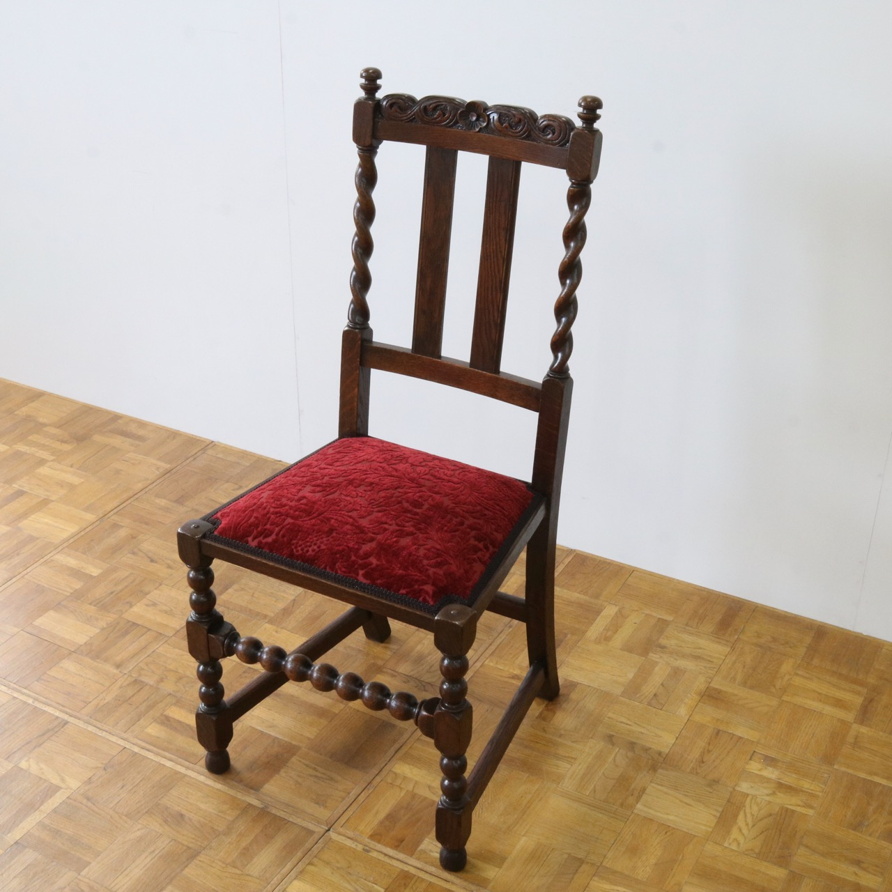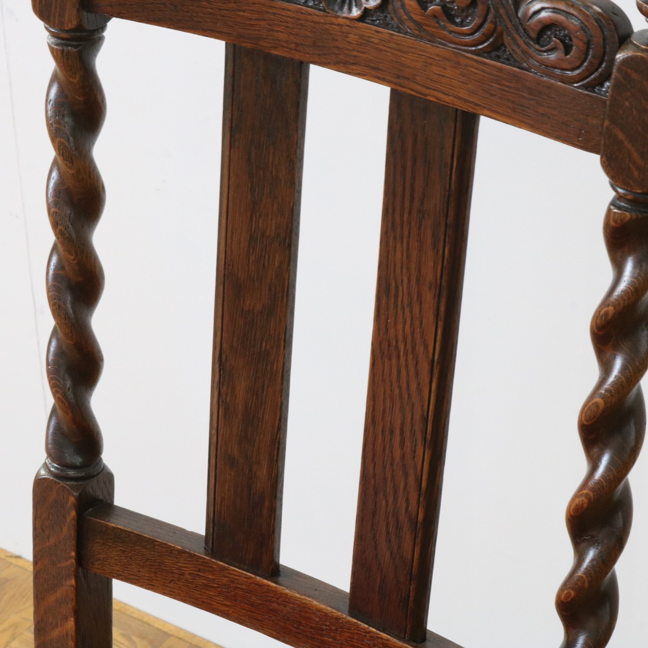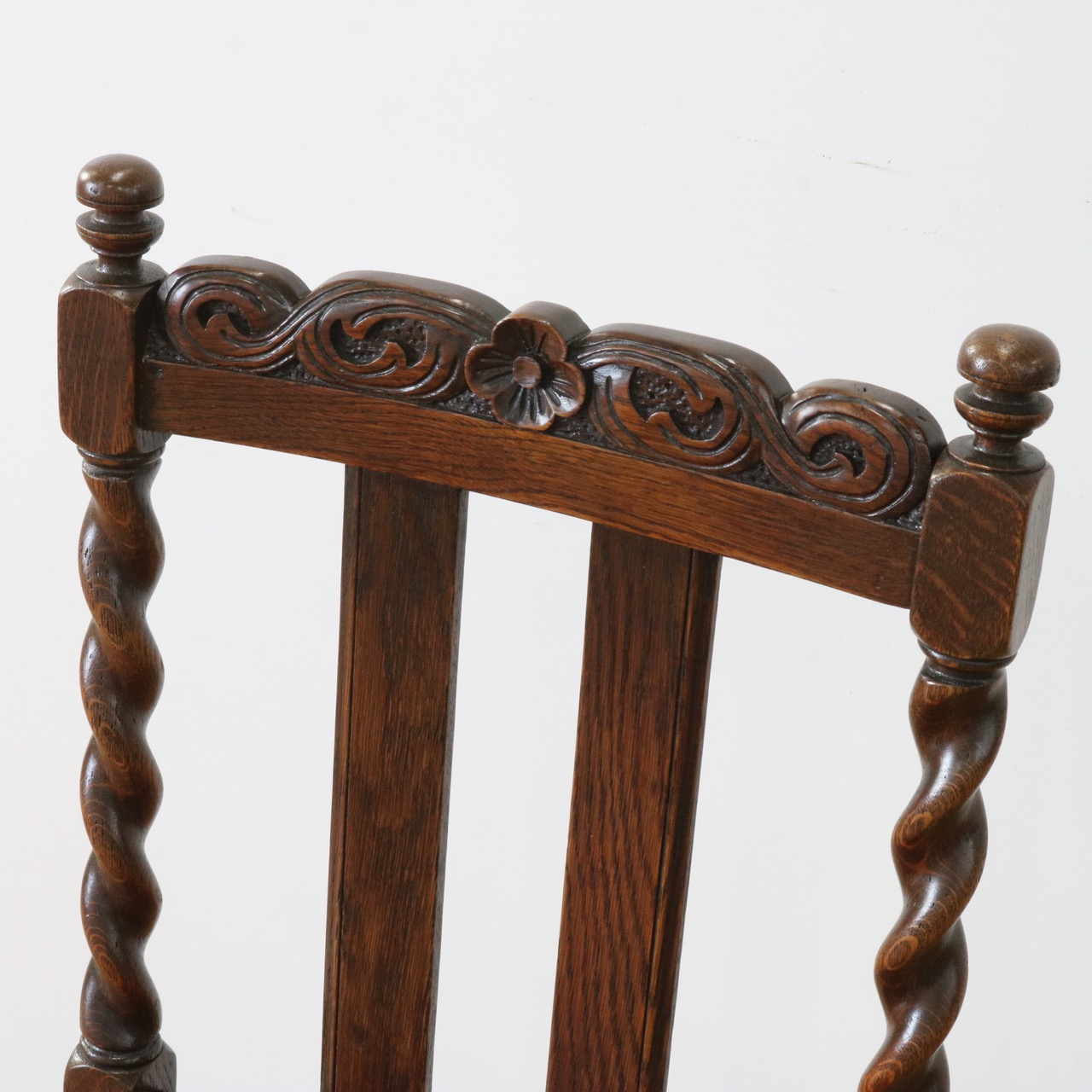 配送料の目安 ▶︎1920年代のオークチェアー。ツイストが特徴的な背もたれ、お団子のようなボビンターニングのデザインがかわいらしさも感じさせる脚元のストレッチャーなど、アンティークらしい意匠にあふれたチェアーです。