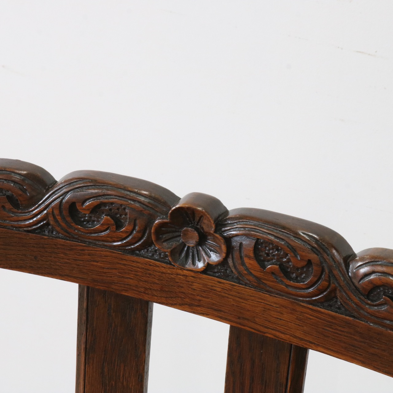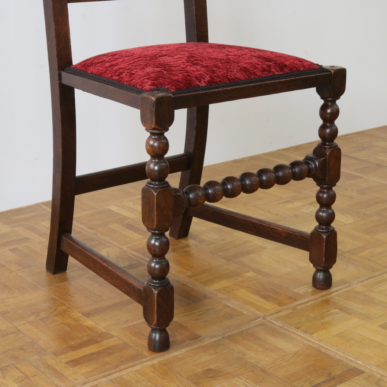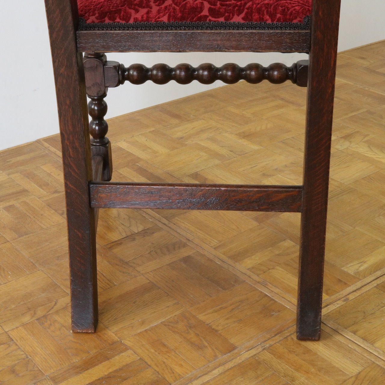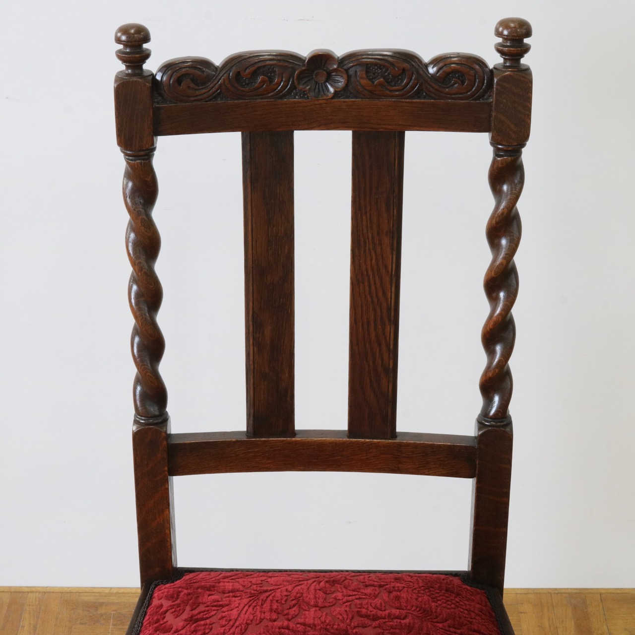 配送料の目安 ▶︎1920年代のオークチェアー。ツイストが特徴的な背もたれ、お団子のようなボビンターニングのデザインがかわいらしさも感じさせる脚元のストレッチャーなど、アンティークらしい意匠にあふれたチェアーです。