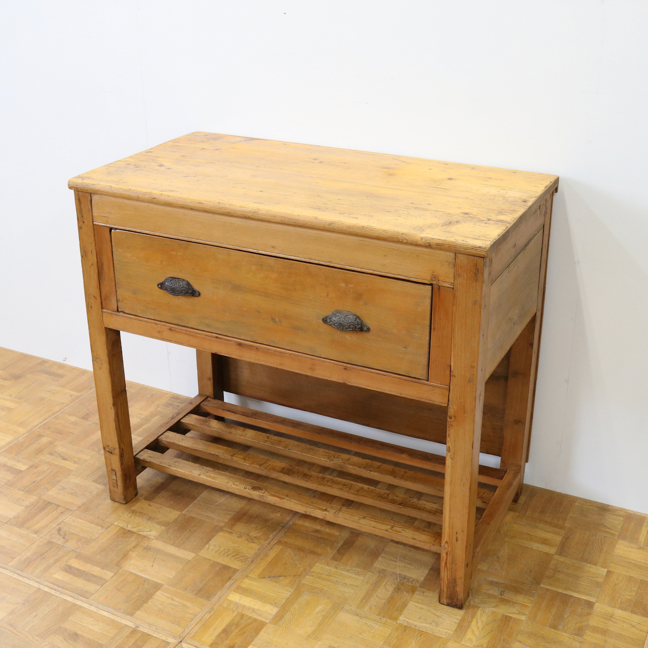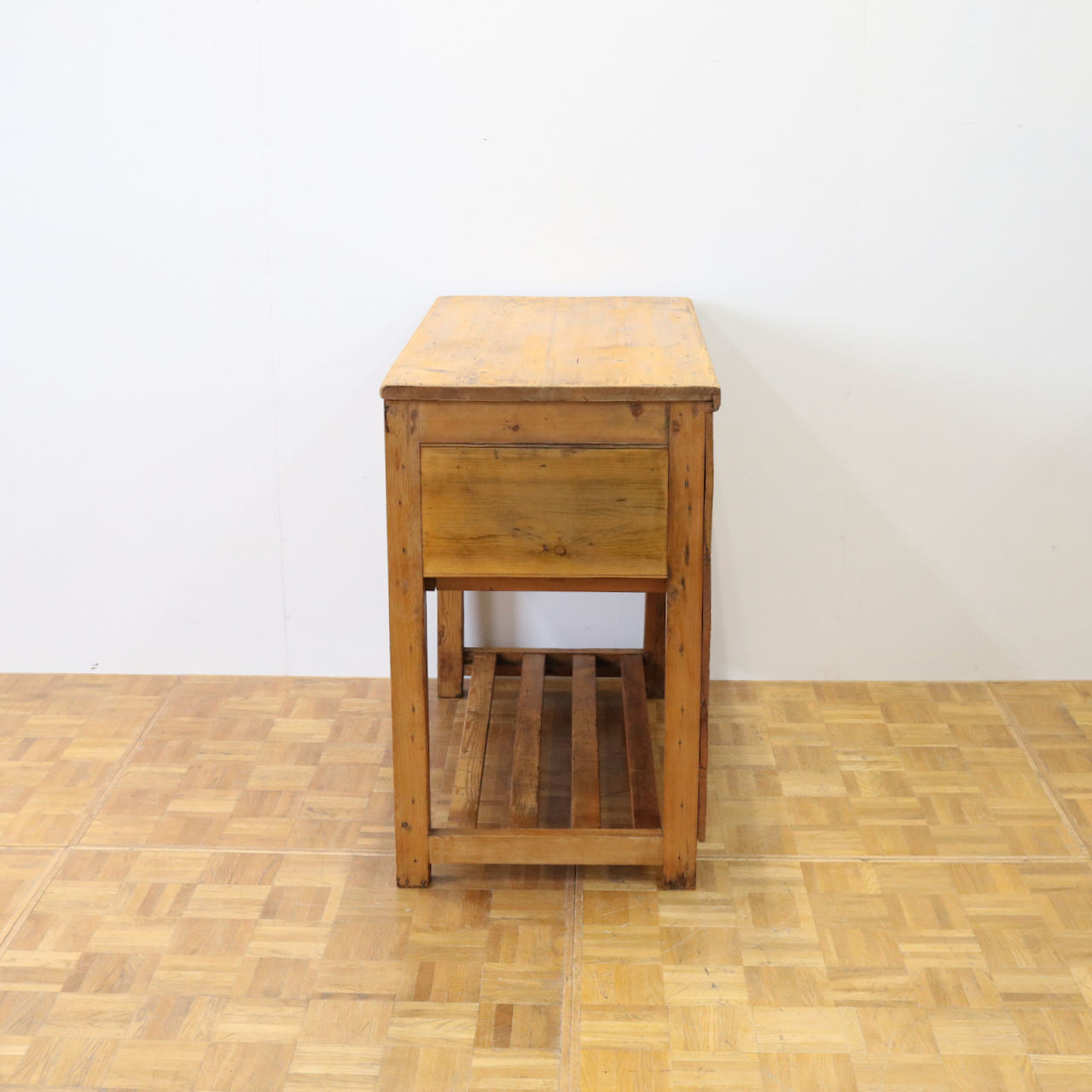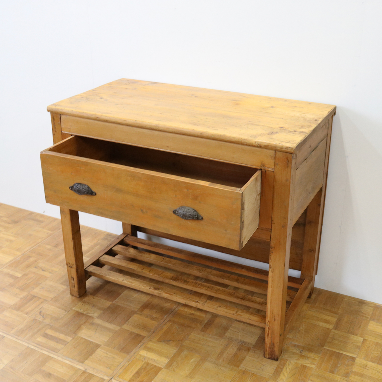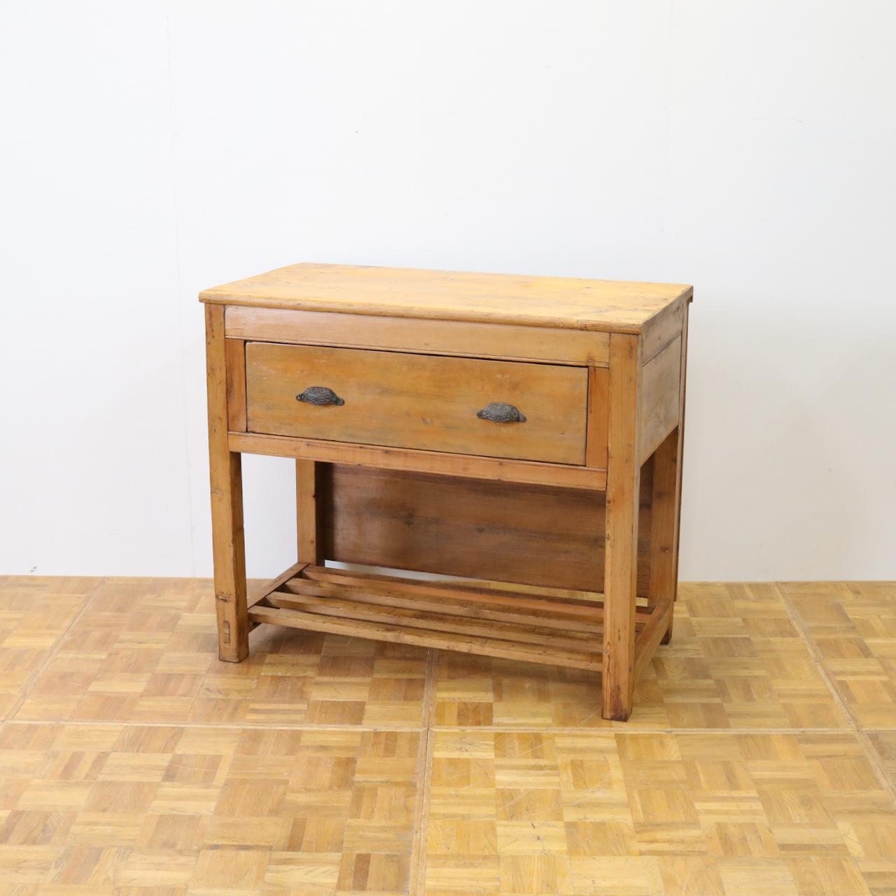 配送料の目安 ▶︎1930年代、パイン材のサイドテーブル。大きな引き出しが付いて、作業台としてもカジュアルに使えるテーブルです。