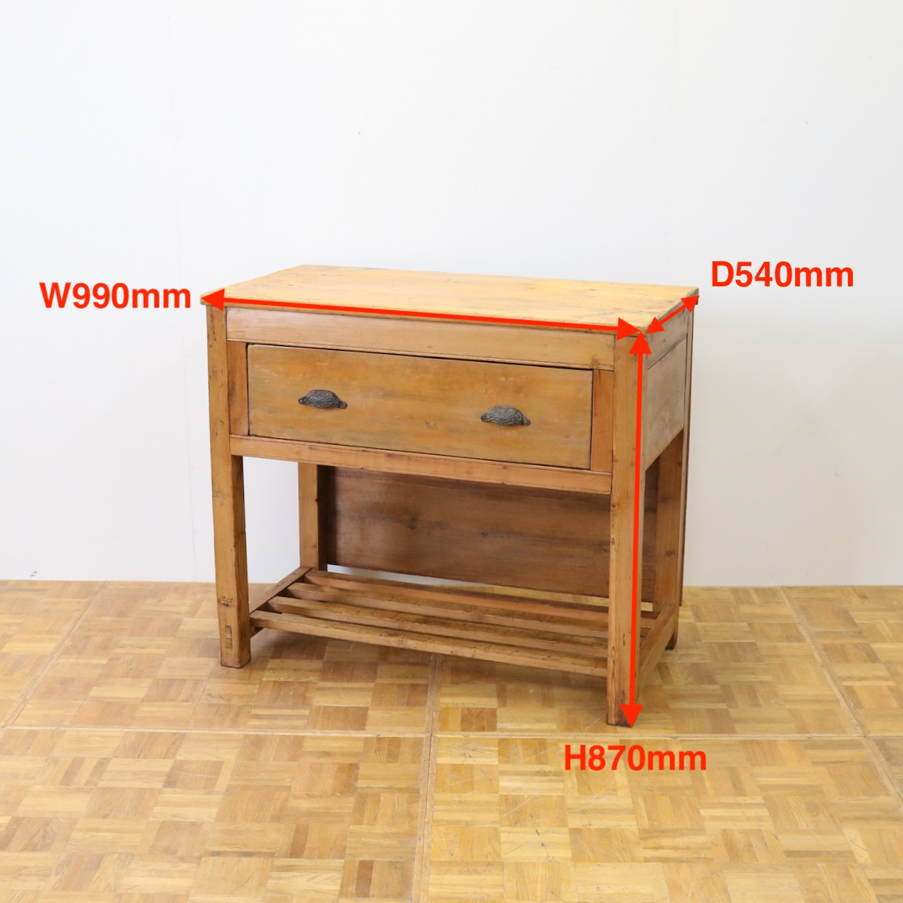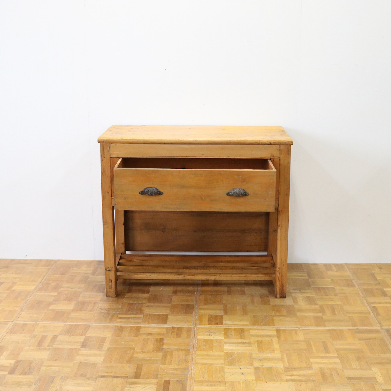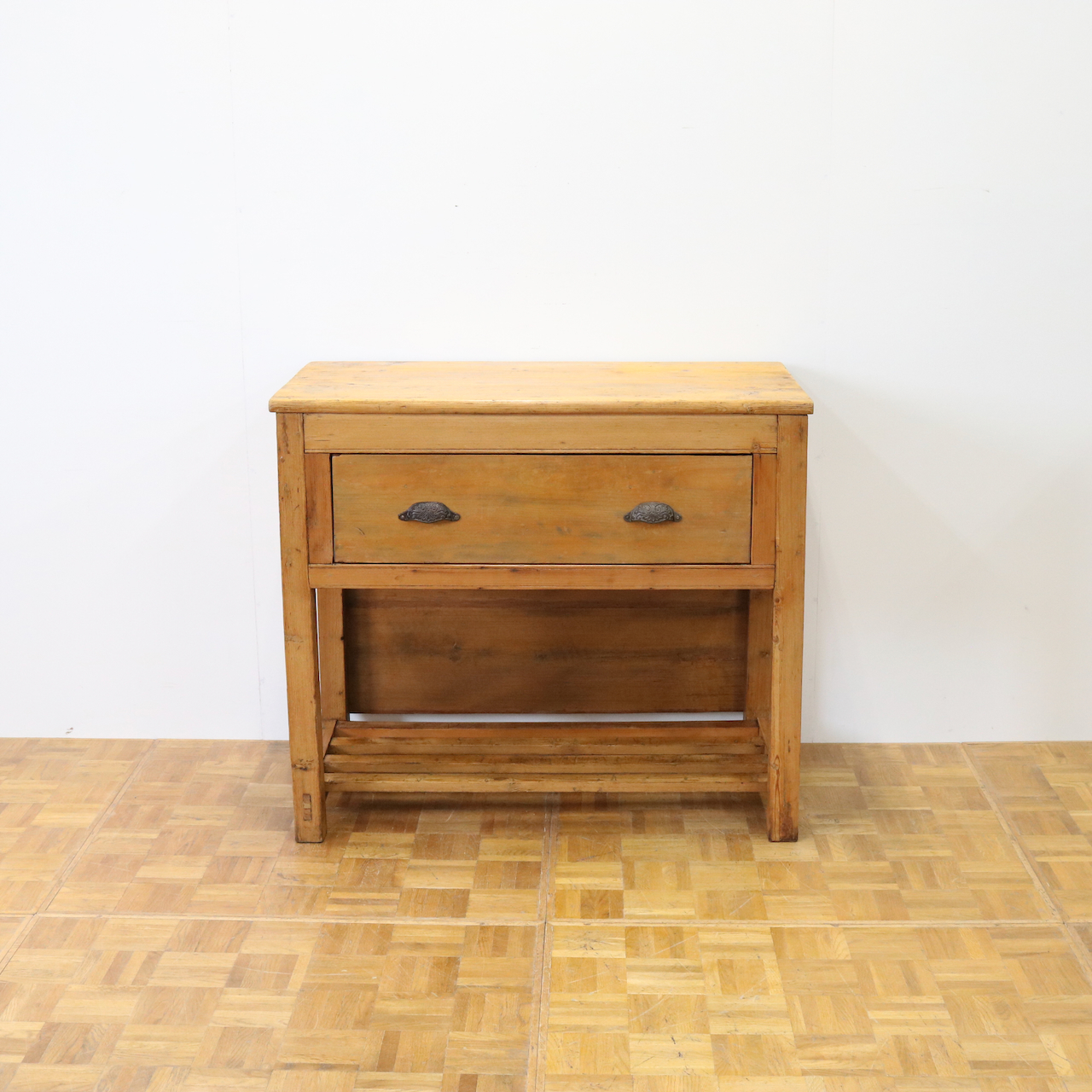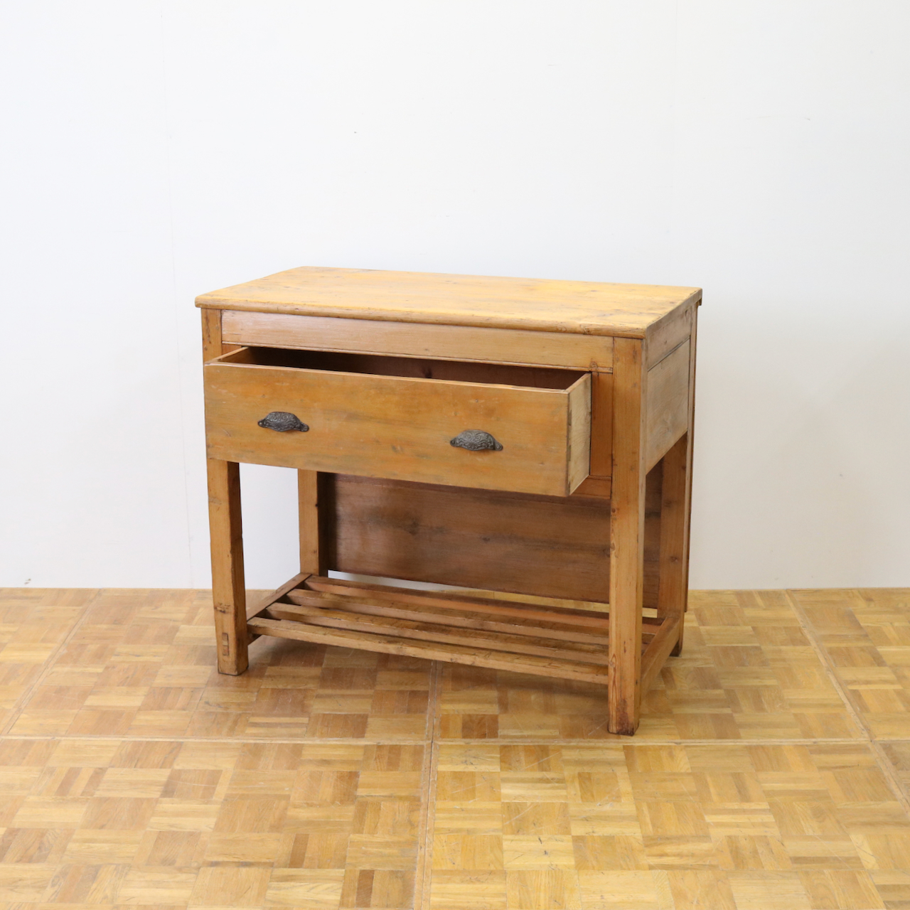 配送料の目安 ▶︎1930年代、パイン材のサイドテーブル。大きな引き出しが付いて、作業台としてもカジュアルに使えるテーブルです。