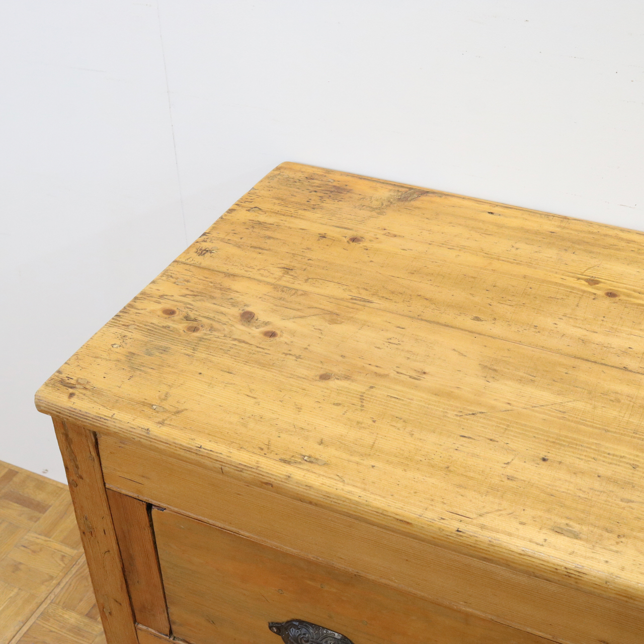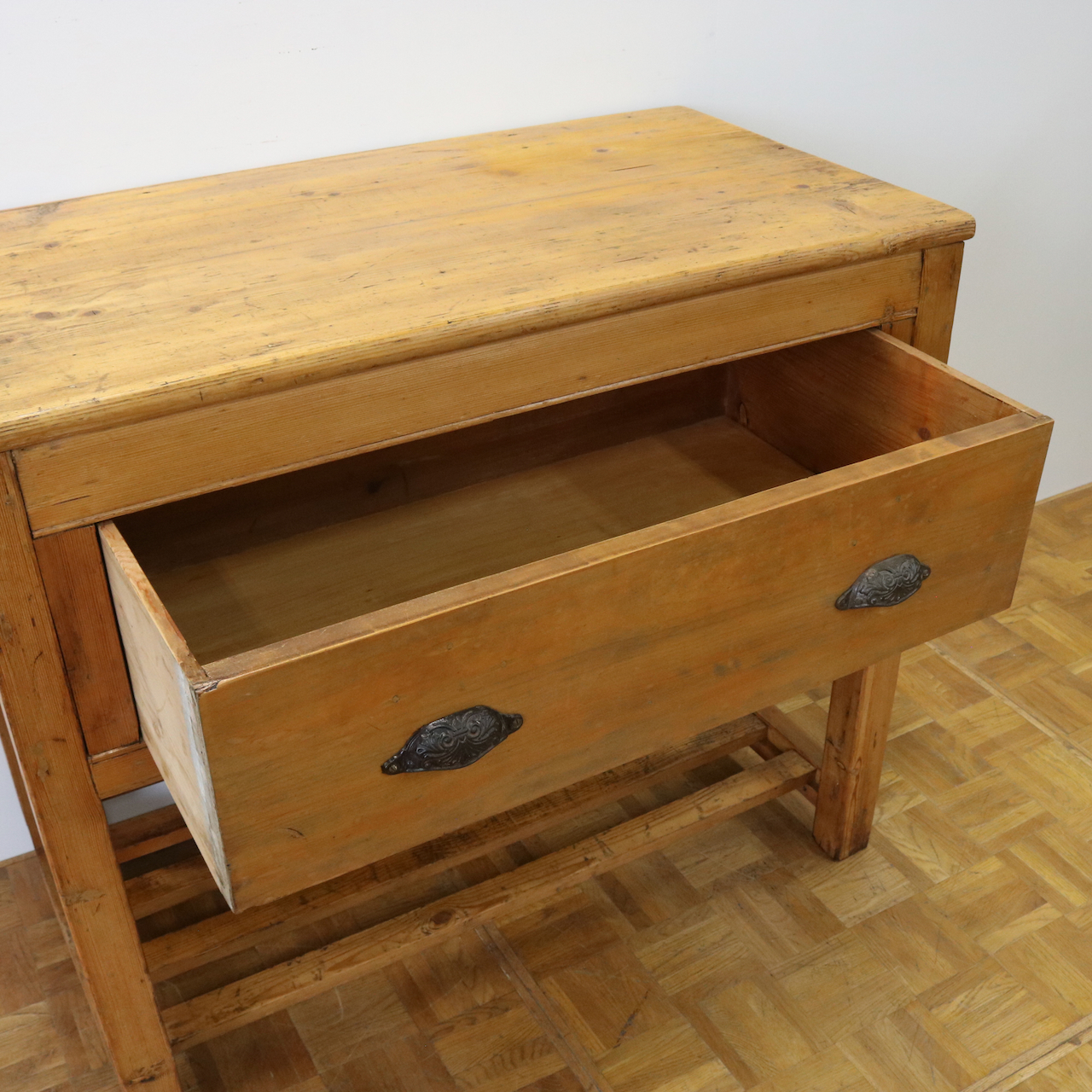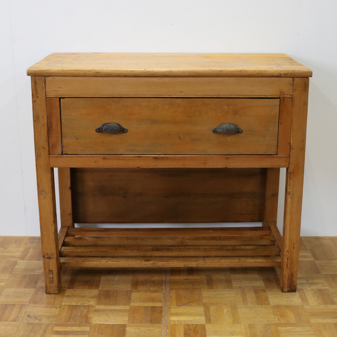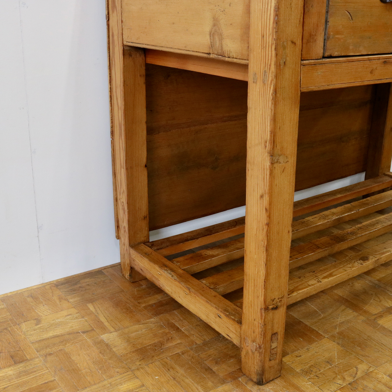配送料の目安 ▶︎1930年代、パイン材のサイドテーブル。大きな引き出しが付いて、作業台としてもカジュアルに使えるテーブルです。