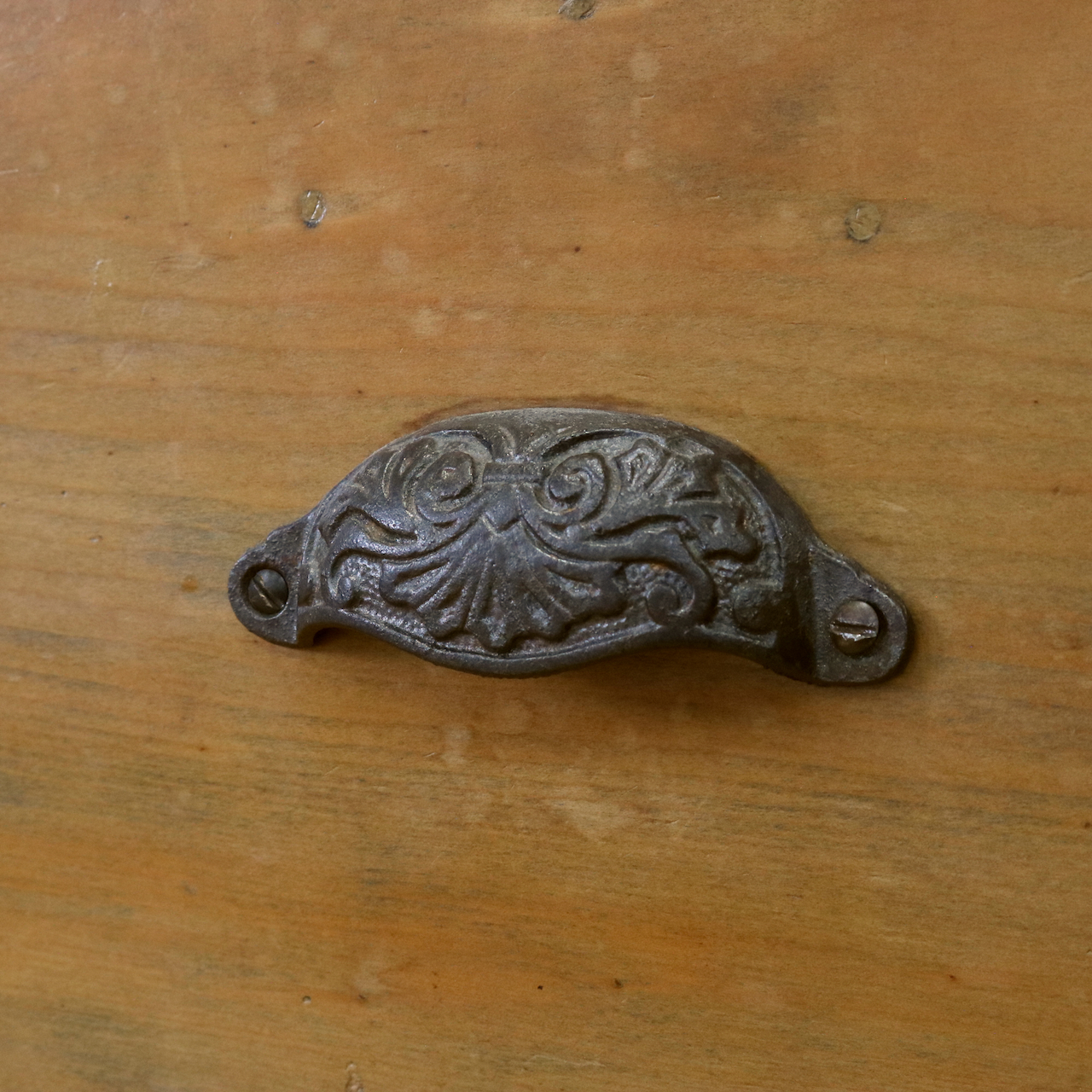 引き手金具もオリジナルのもの。シェルや植物を組み合わせたようなユニークなデザインです。