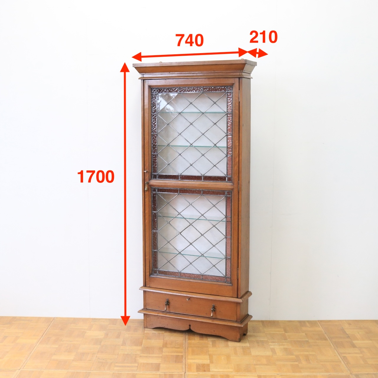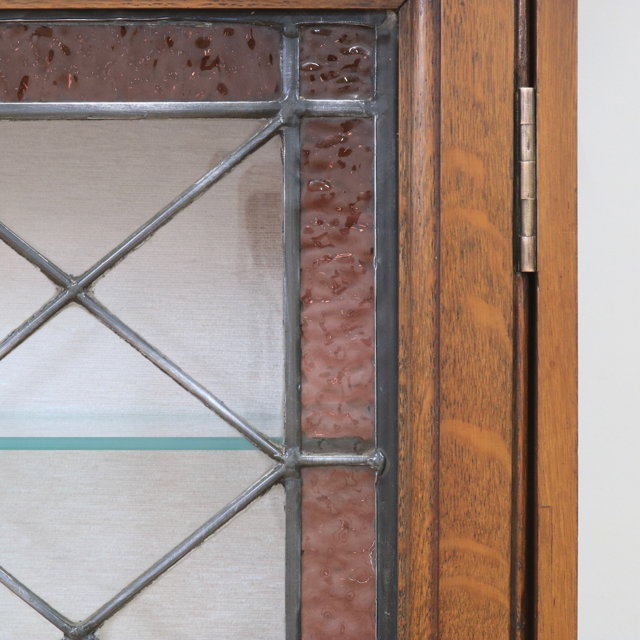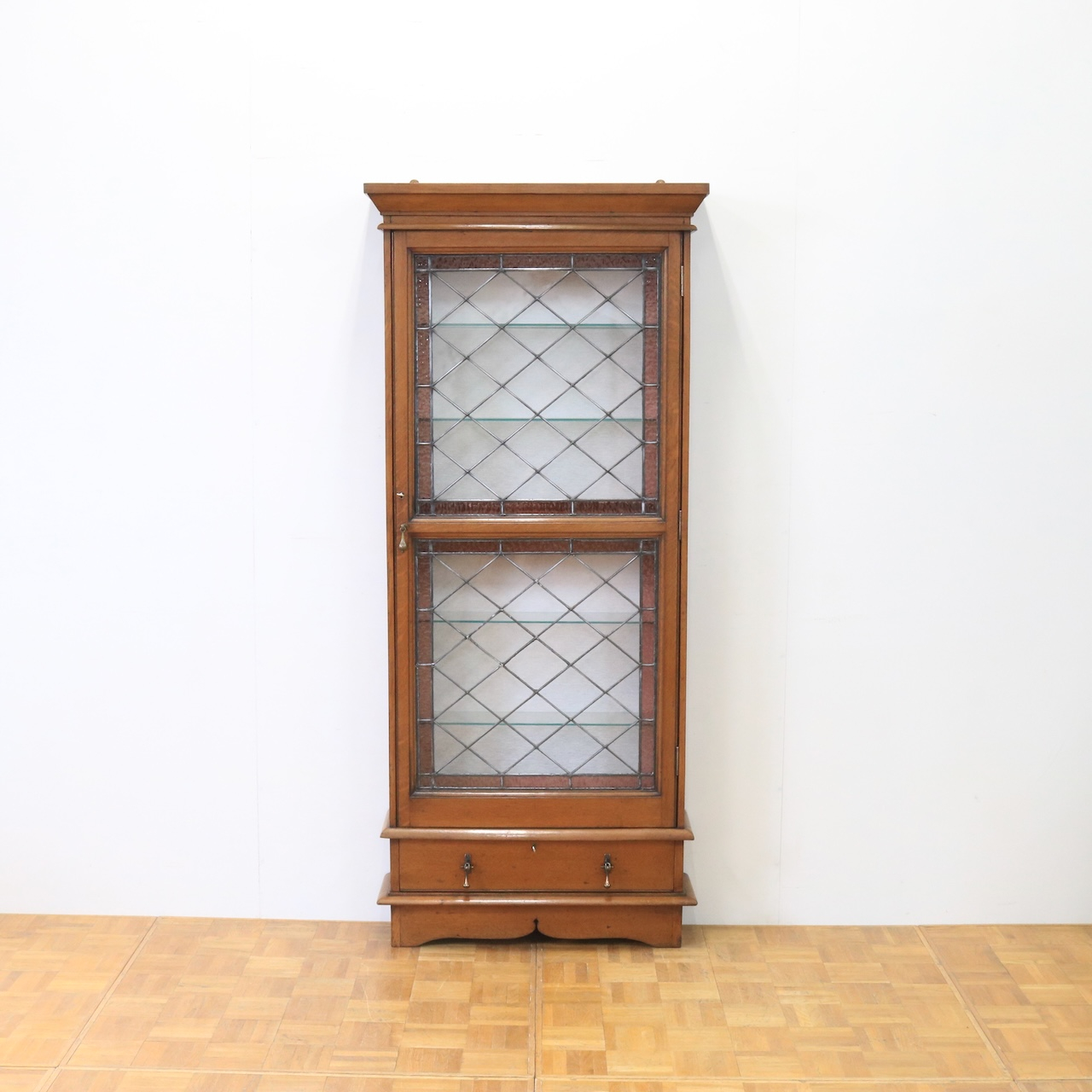 オーク材のグラスキャビネット。ステンドグラスの扉が一際美しく、リーディットに囲まれた透明と紫色が光により表情豊かに見えます。奥行き浅めで圧迫感がないのも嬉しいポイント。