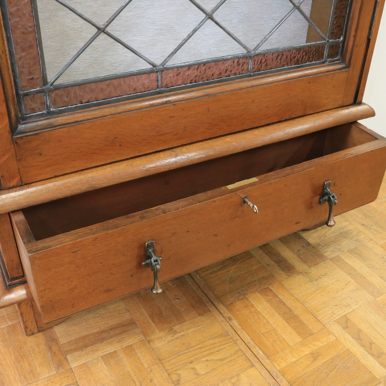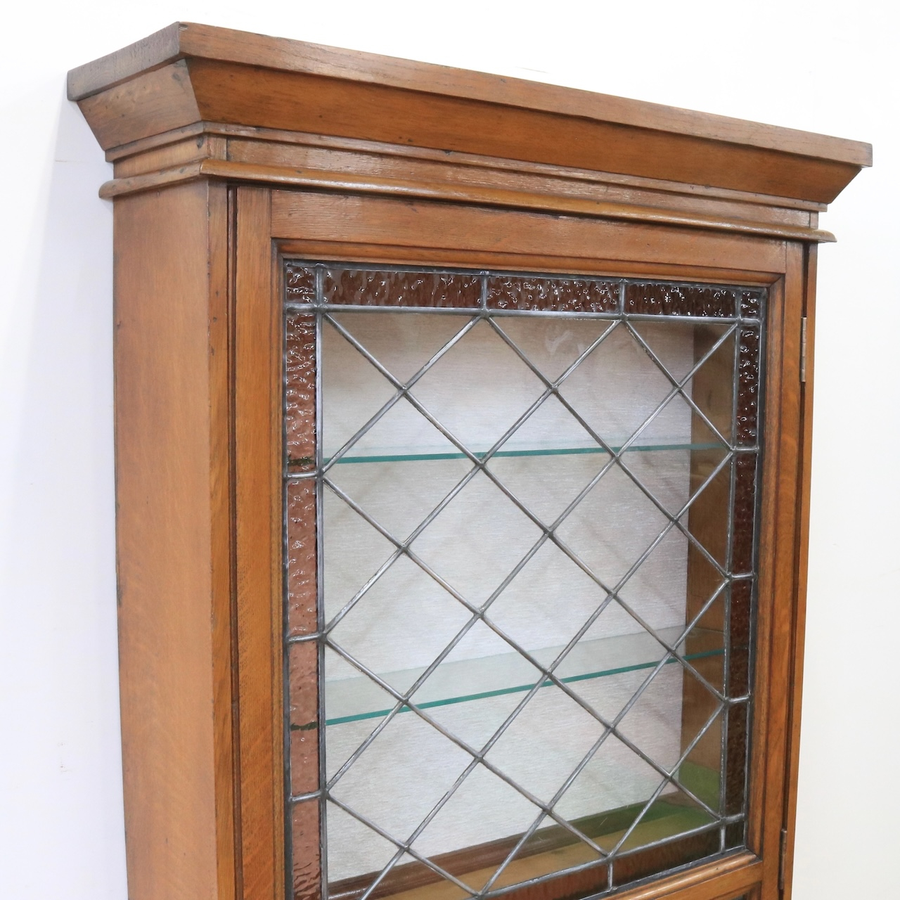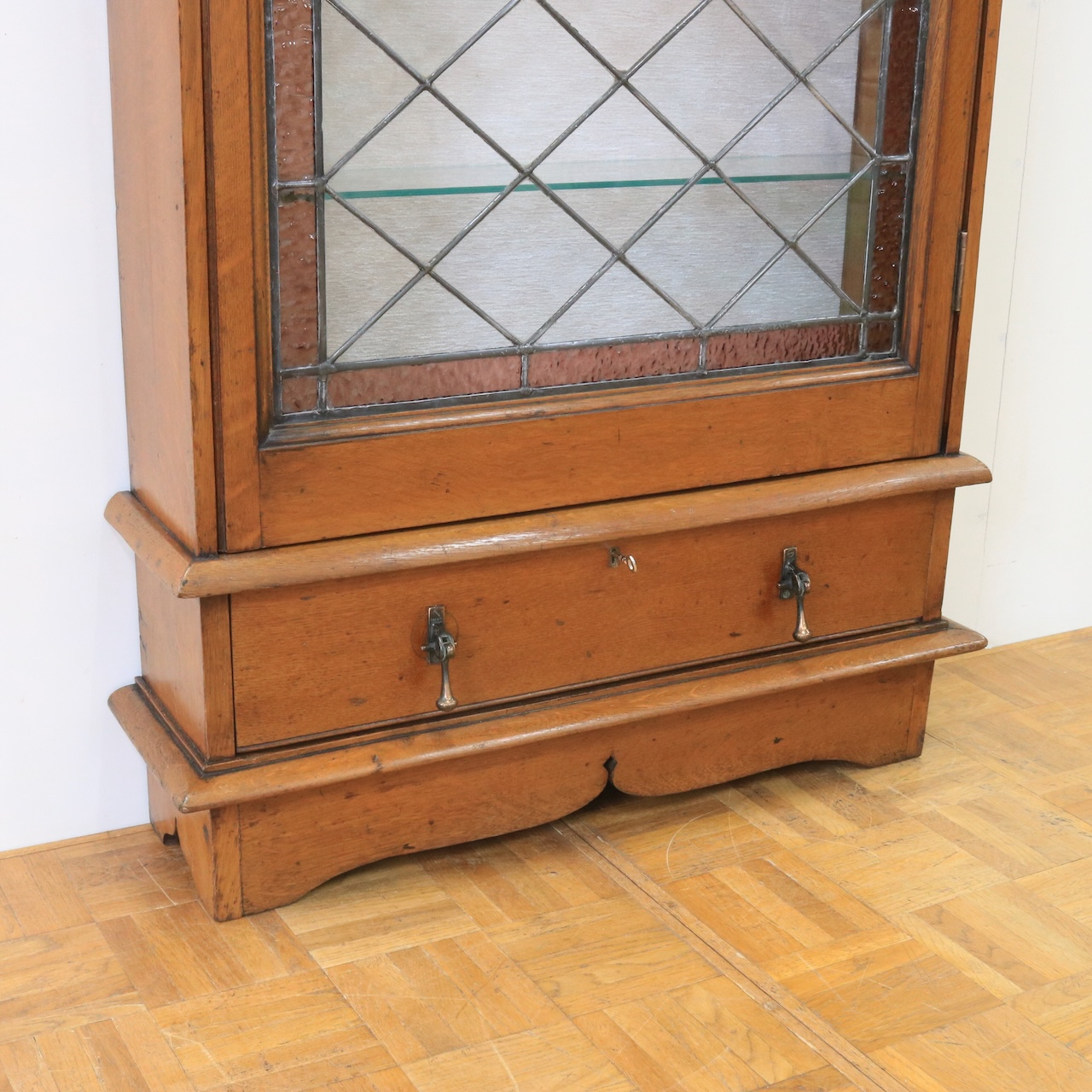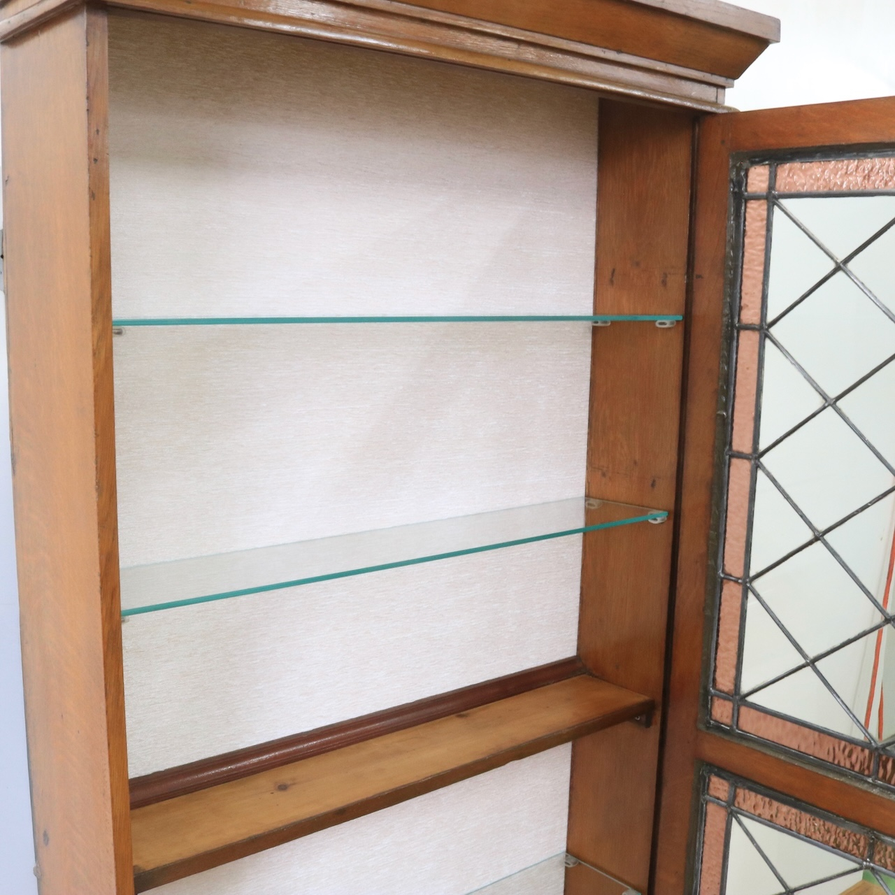 オーク材のグラスキャビネット。ステンドグラスの扉が一際美しく、リーディットに囲まれた透明と紫色が光により表情豊かに見えます。奥行き浅めで圧迫感がないのも嬉しいポイント。