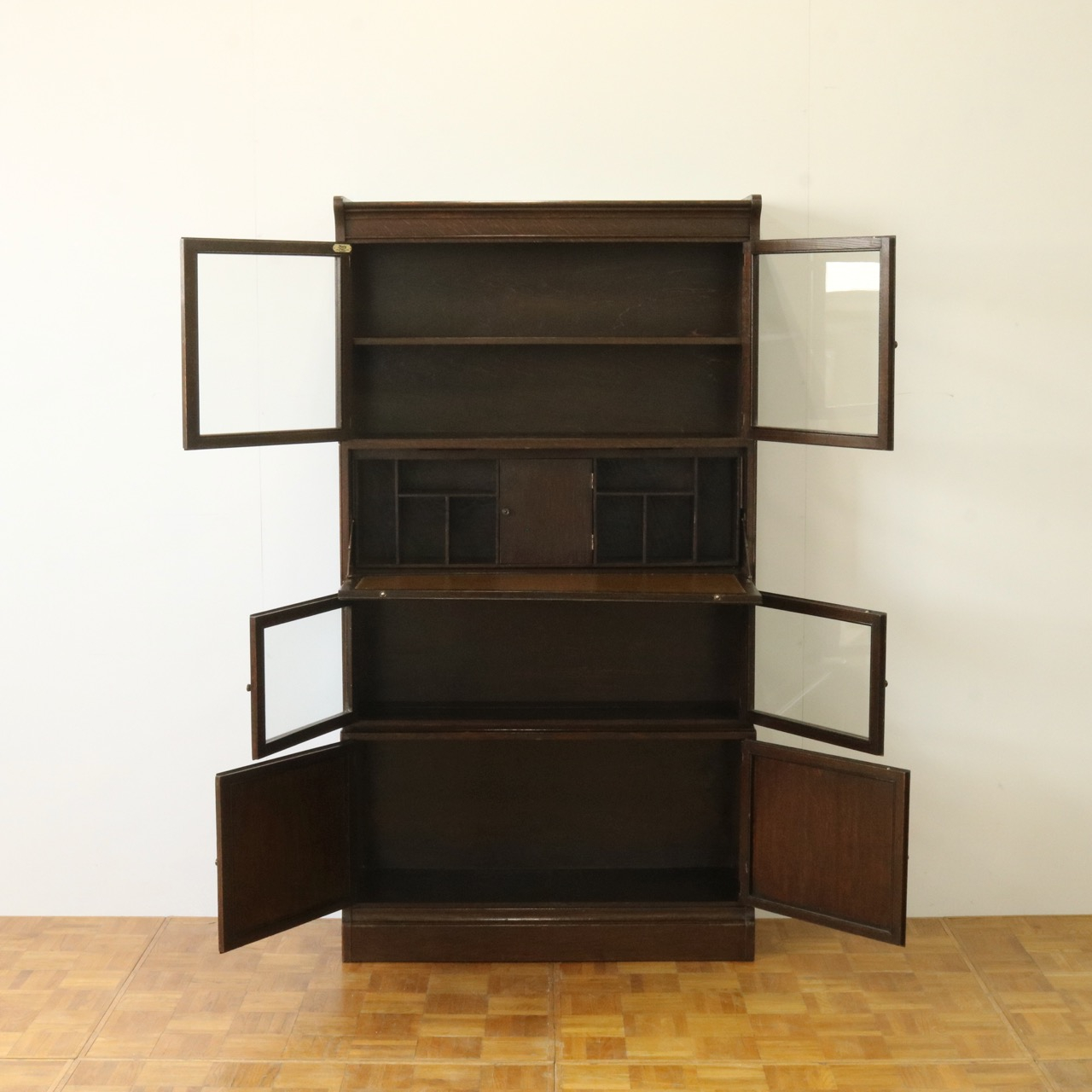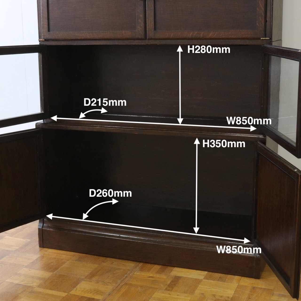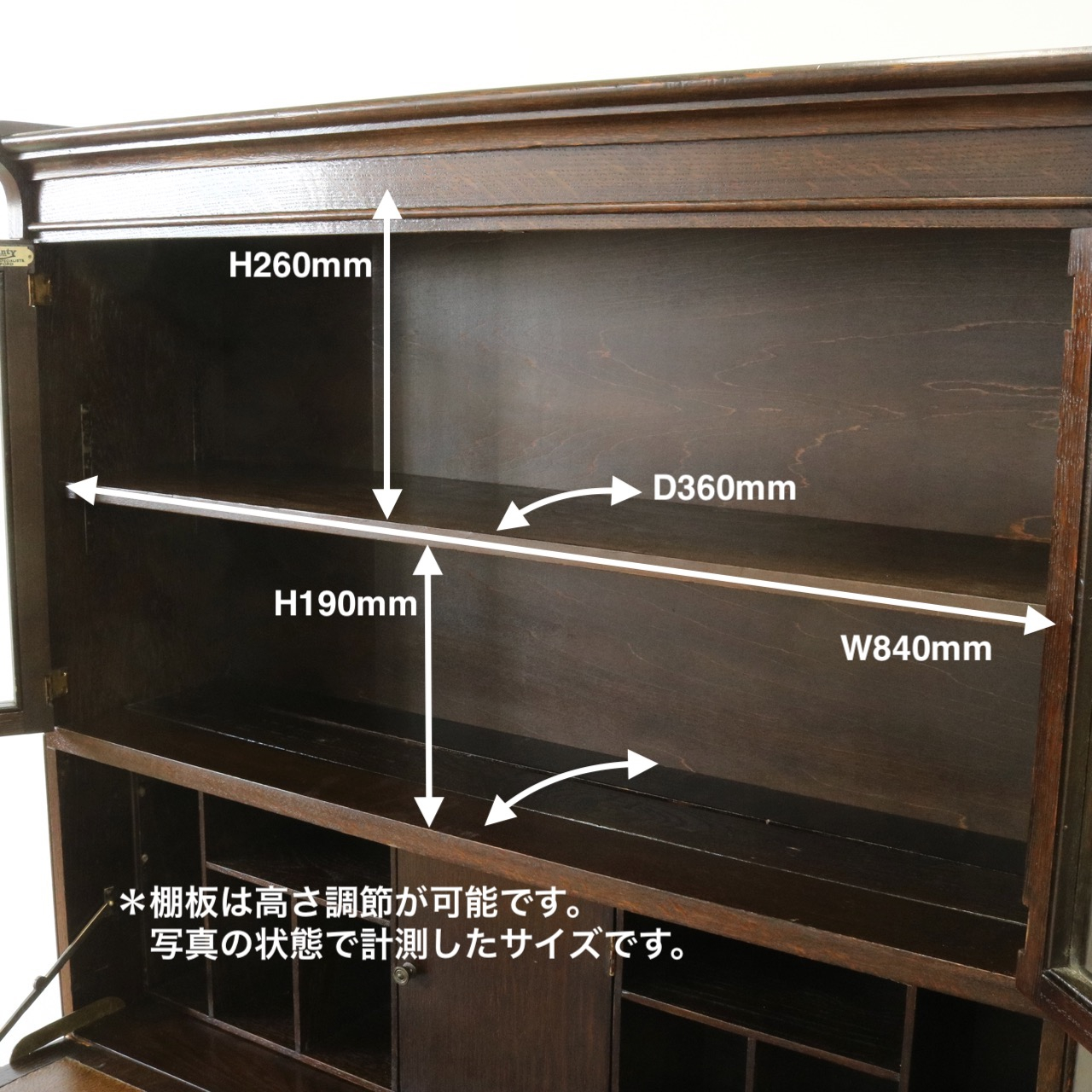 一番上の大きなガラス扉を開けると棚板で2段に分かれたブックケース収納。