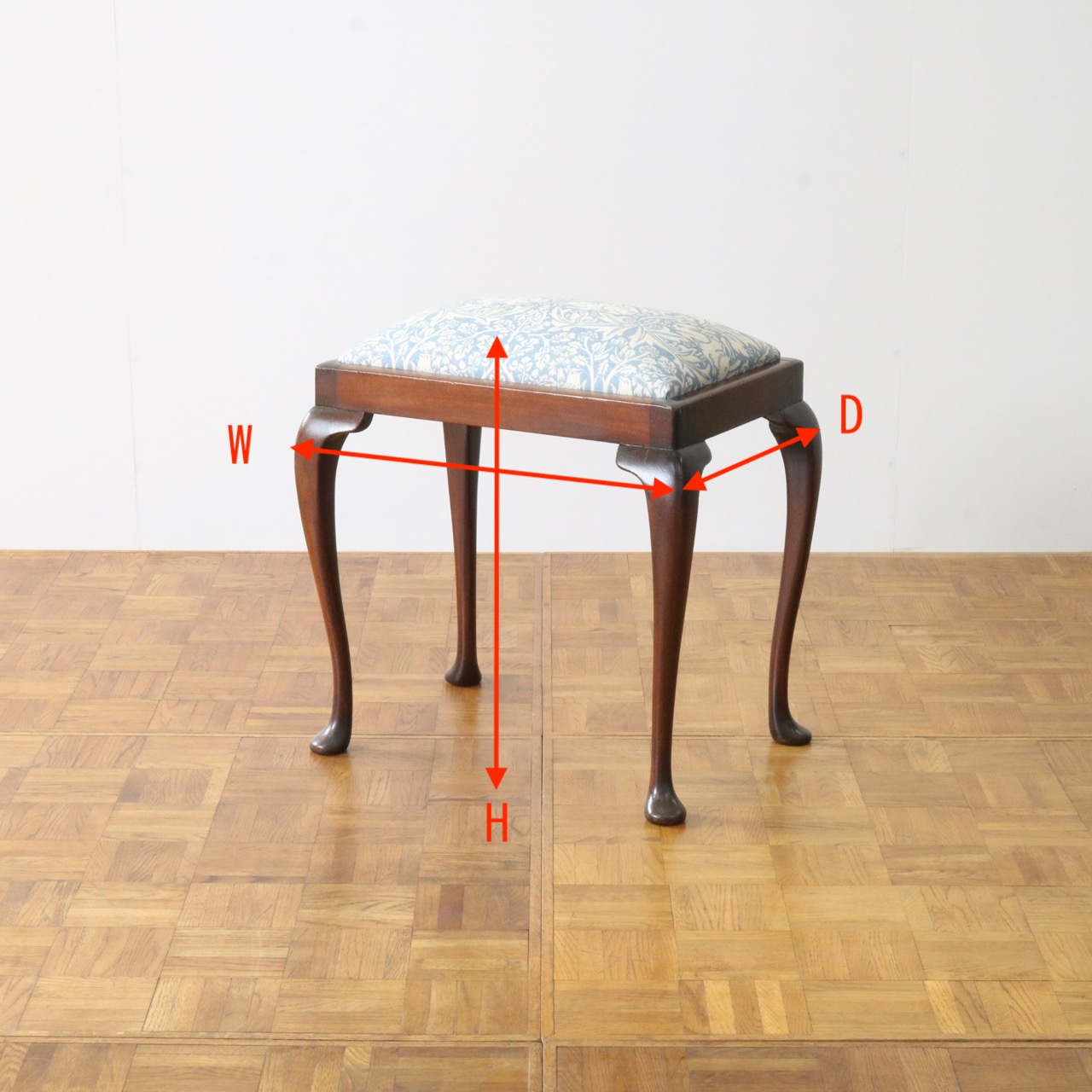 配送料の目安 ▶︎1930年代、マホガニーのスツール 。カブリオールレッグ の緩やかな曲線が美しいすらっとした佇まい。生地はウィリアム・モリスの"Brer Rabbit"で張り替えました。