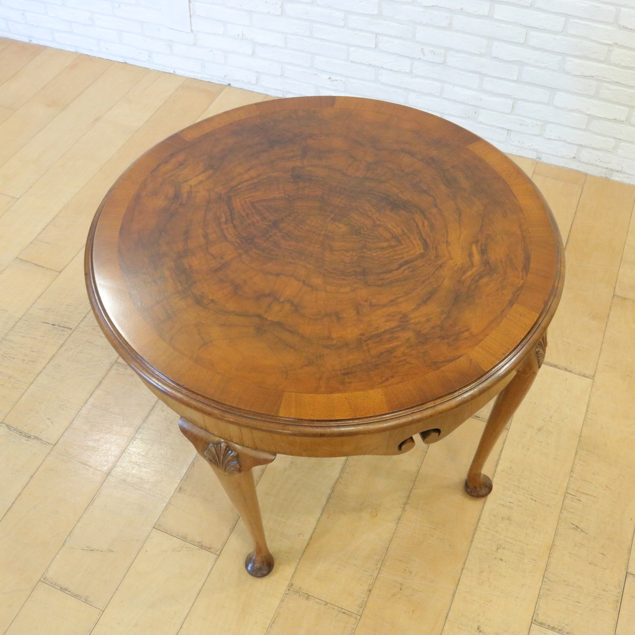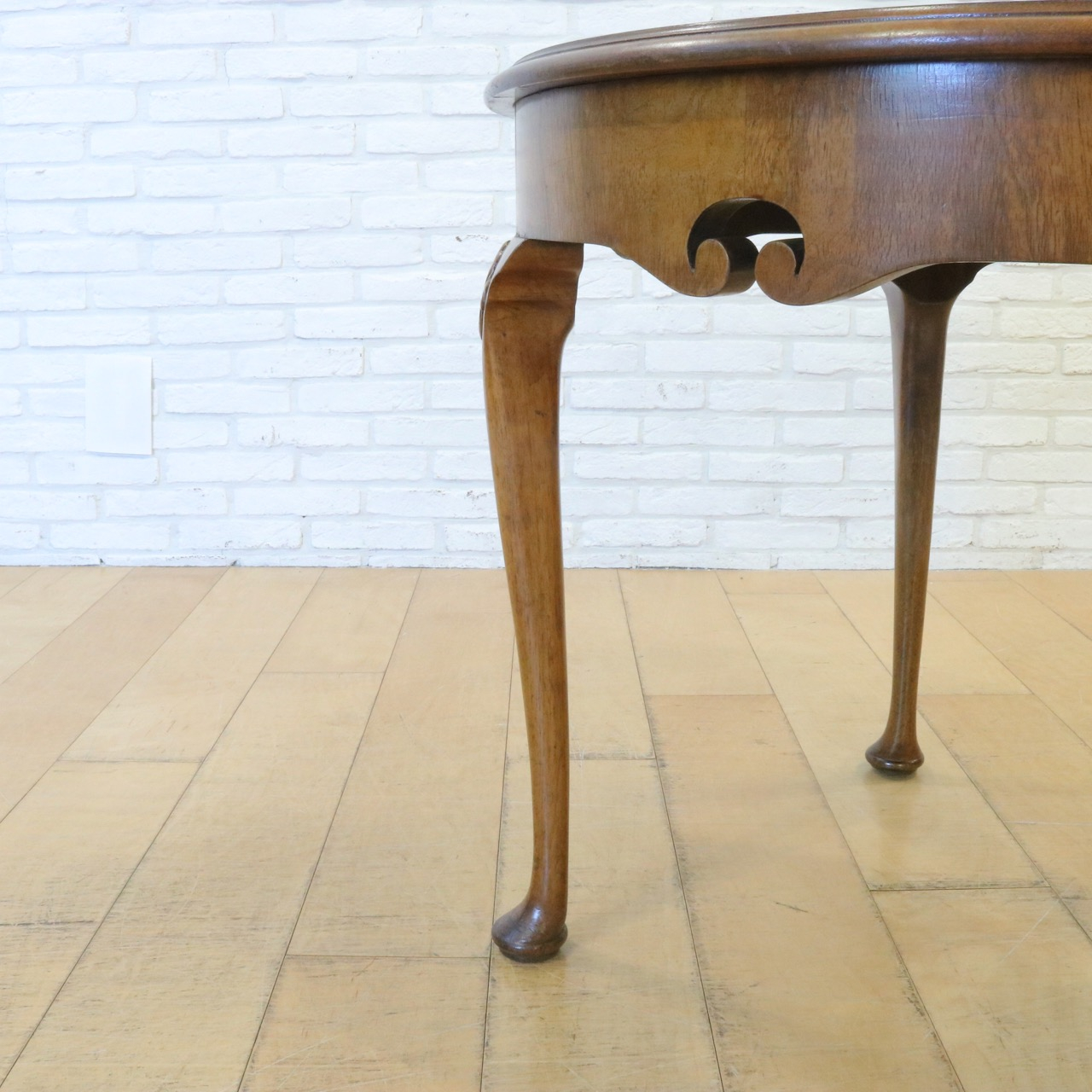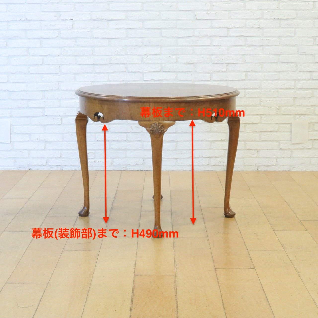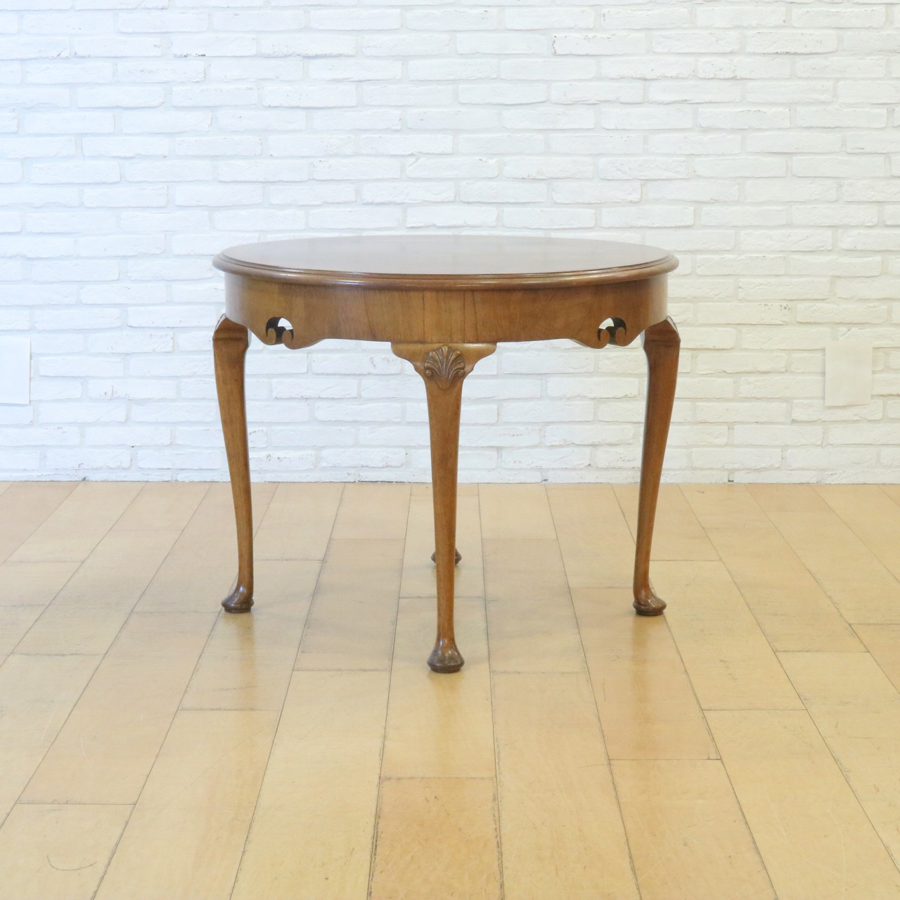 ラウンドの天板にウォールナット らしい美しい杢目を堪能できます。カブリオールレッグに貝殻の装飾が優雅なポイントです。