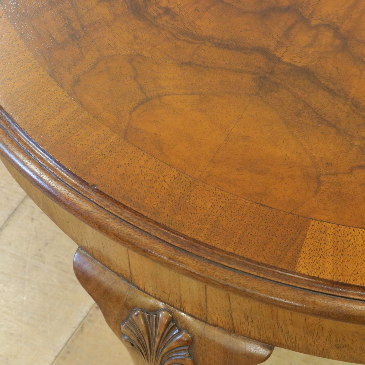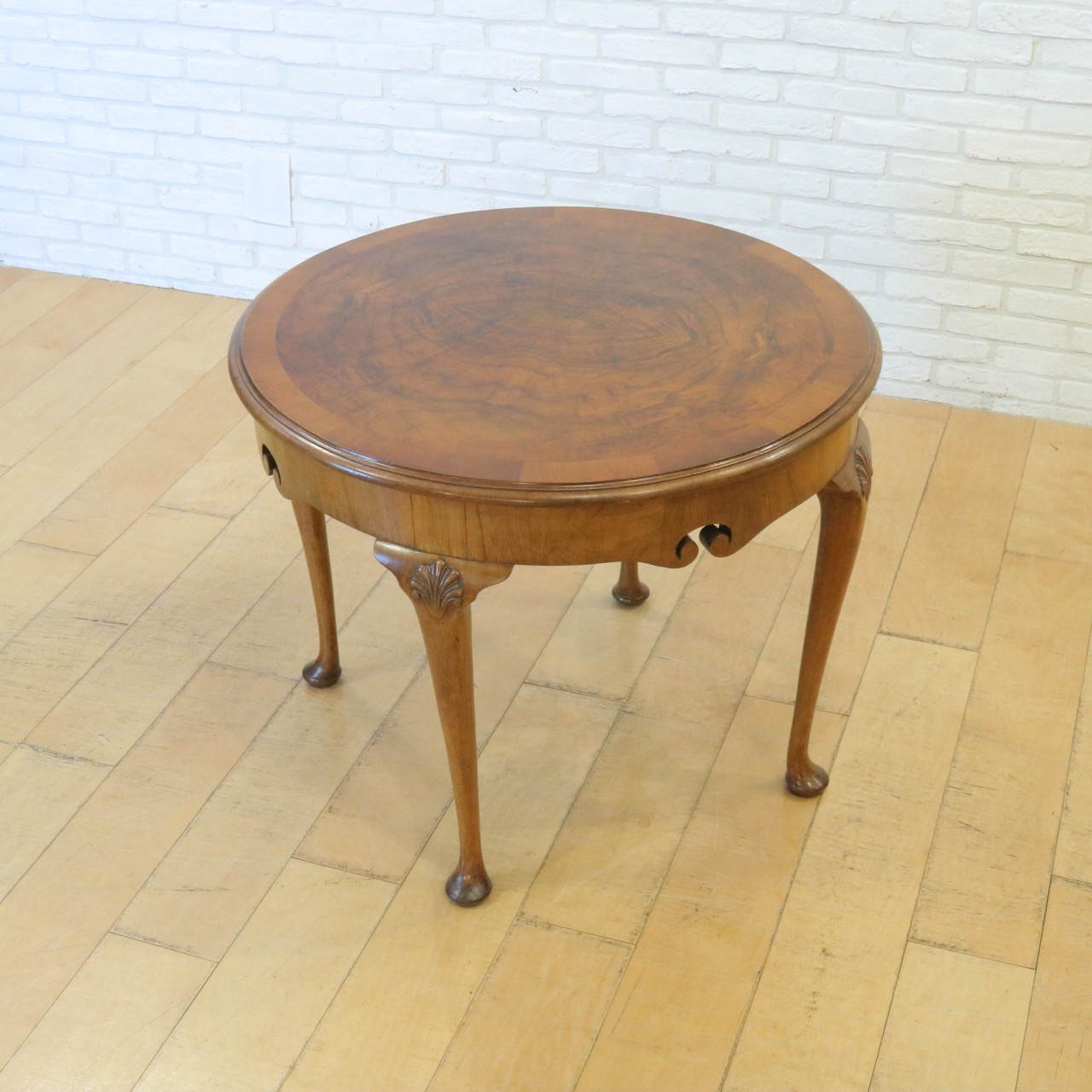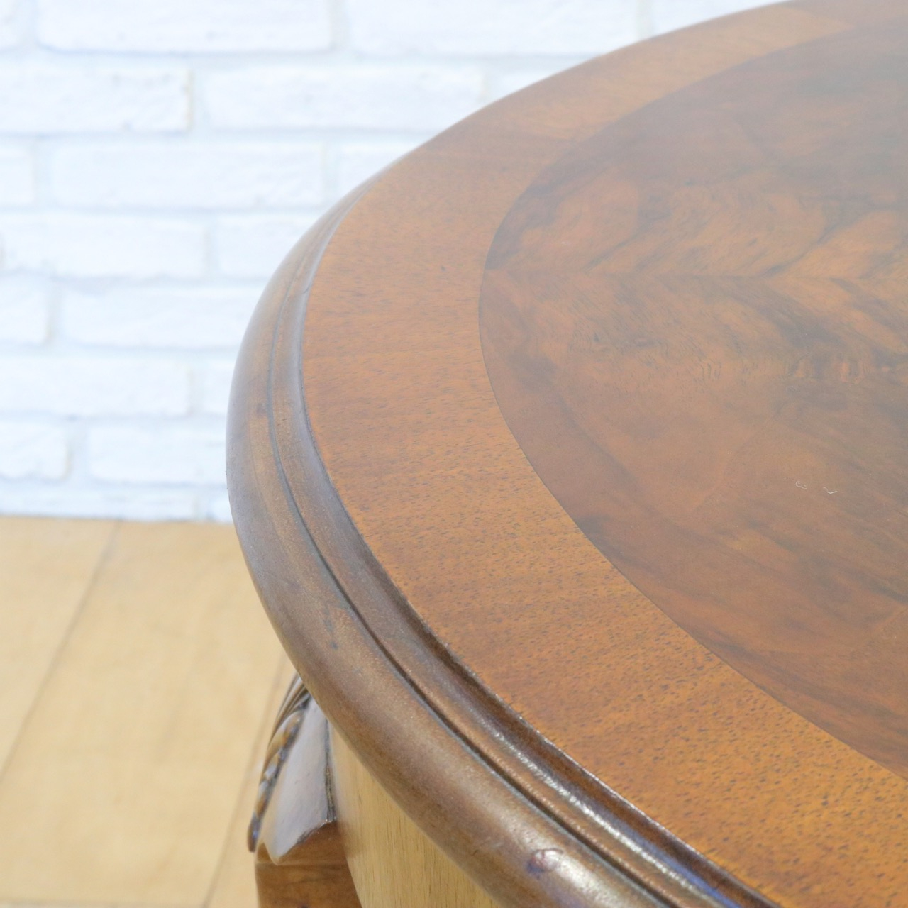 ラウンドの天板にウォールナット らしい美しい杢目を堪能できます。カブリオールレッグに貝殻の装飾が優雅なポイントです。