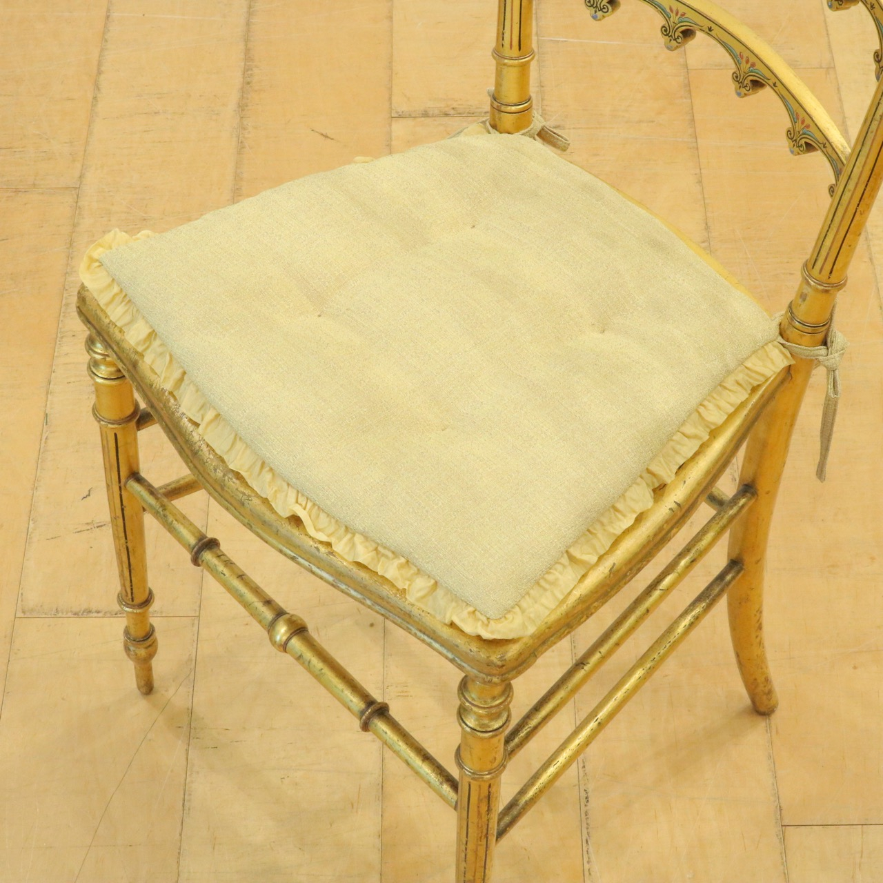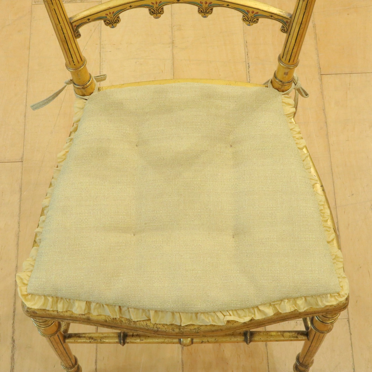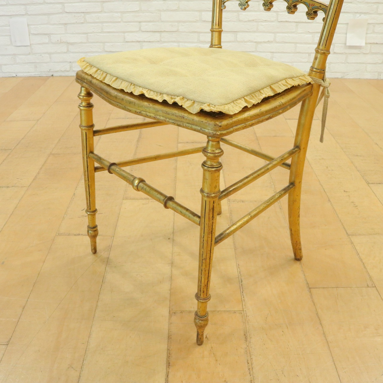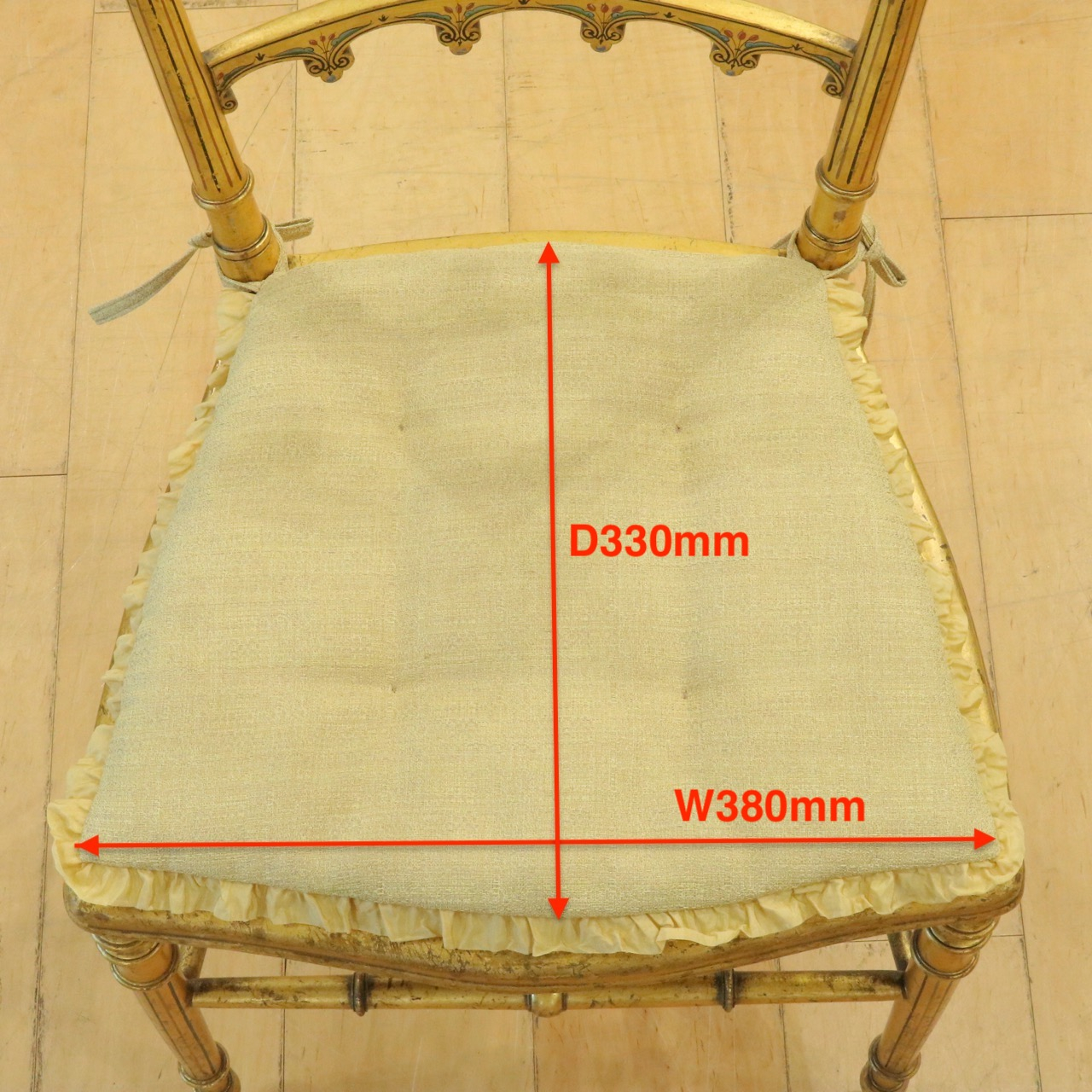 オリジナルはケーン張りの座面ですが、薄手のクッションを製作し、よりクラシカルで可憐な佇まいに。