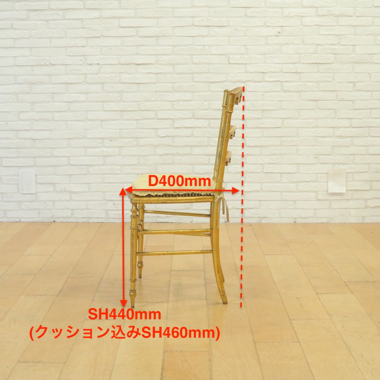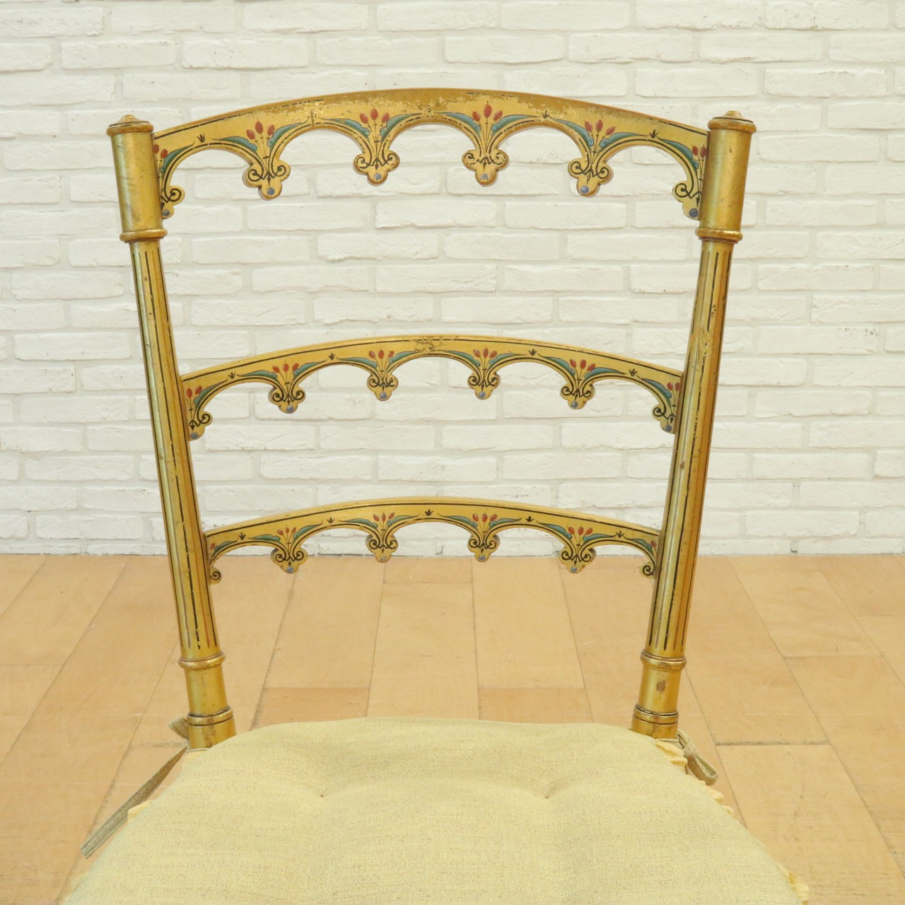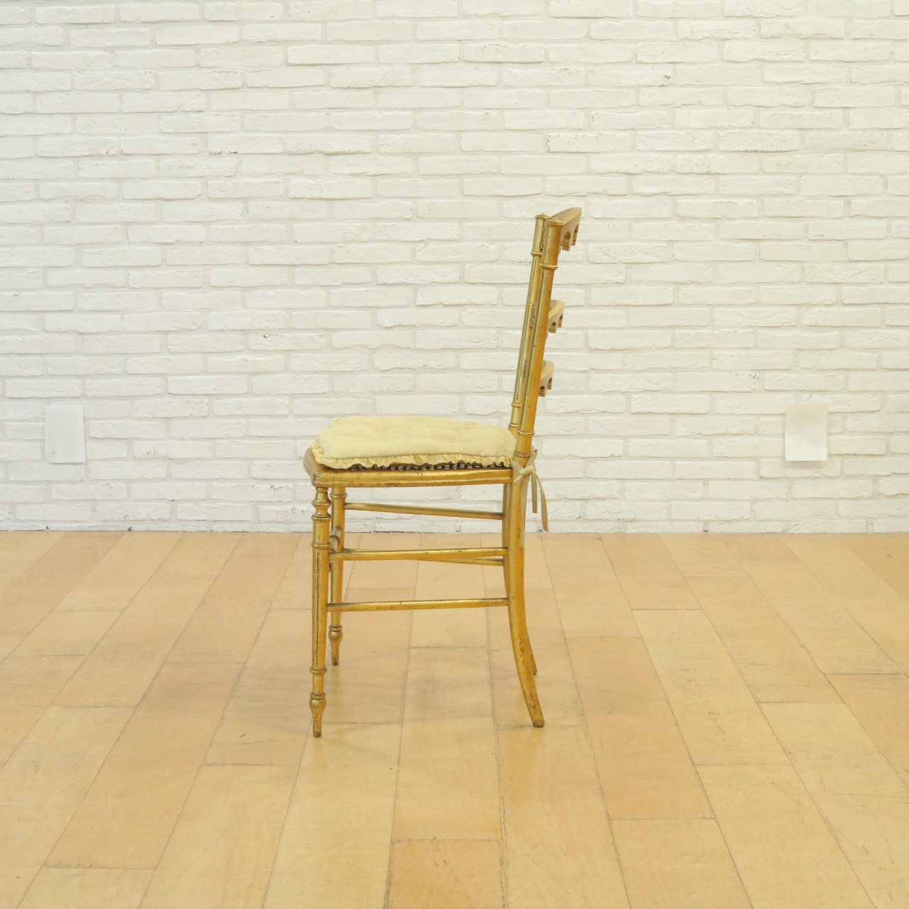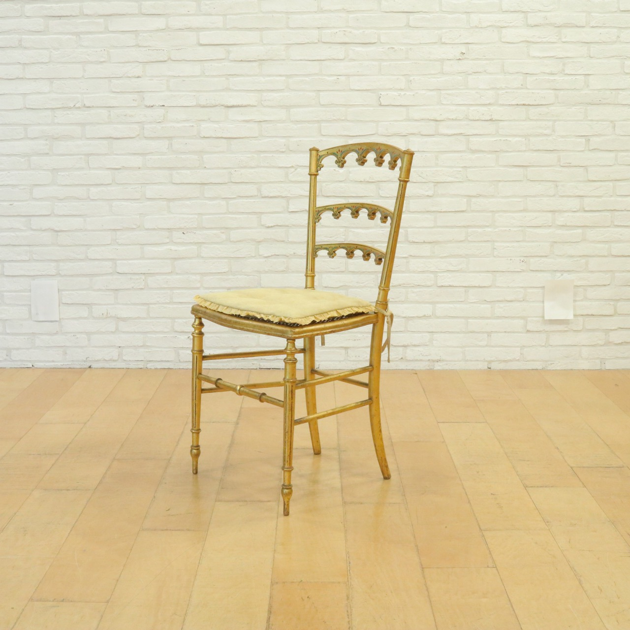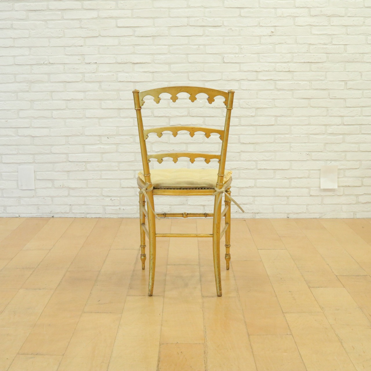 オリジナルはケーン張りの座面ですが、薄手のクッションを製作し、よりクラシカルで可憐な佇まいに。