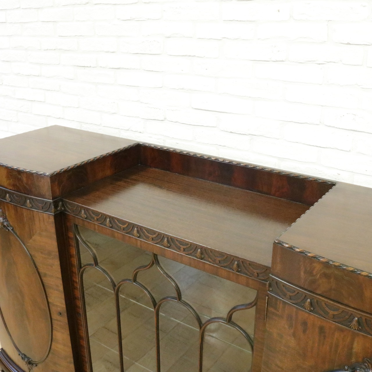 天板の縁からパネル、脚部に至るまで豊かな装飾が施され優美。
