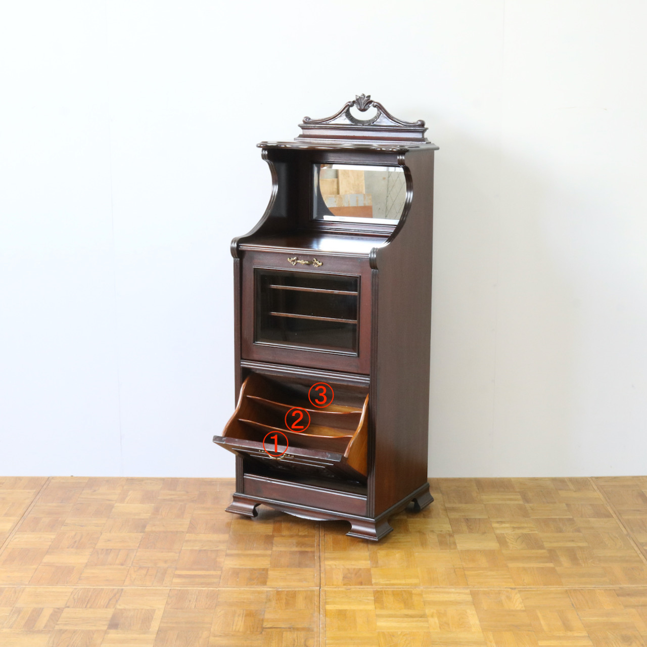 配送料の目安 ▶︎1930年代、マホガニーのミュージックキャビネット。楽譜を収納するためのキャビネットだったので、内部が細かく仕切られています。楽器のそばに置いて楽しみたいお品です。