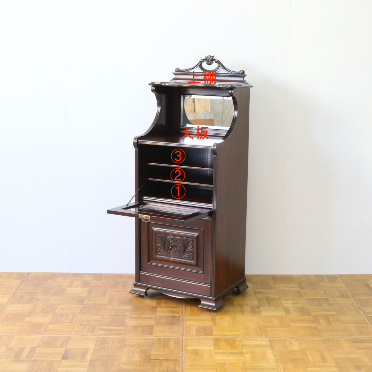 下の扉はアカンサスの彫刻が施されています。立体感のある美しい意匠。