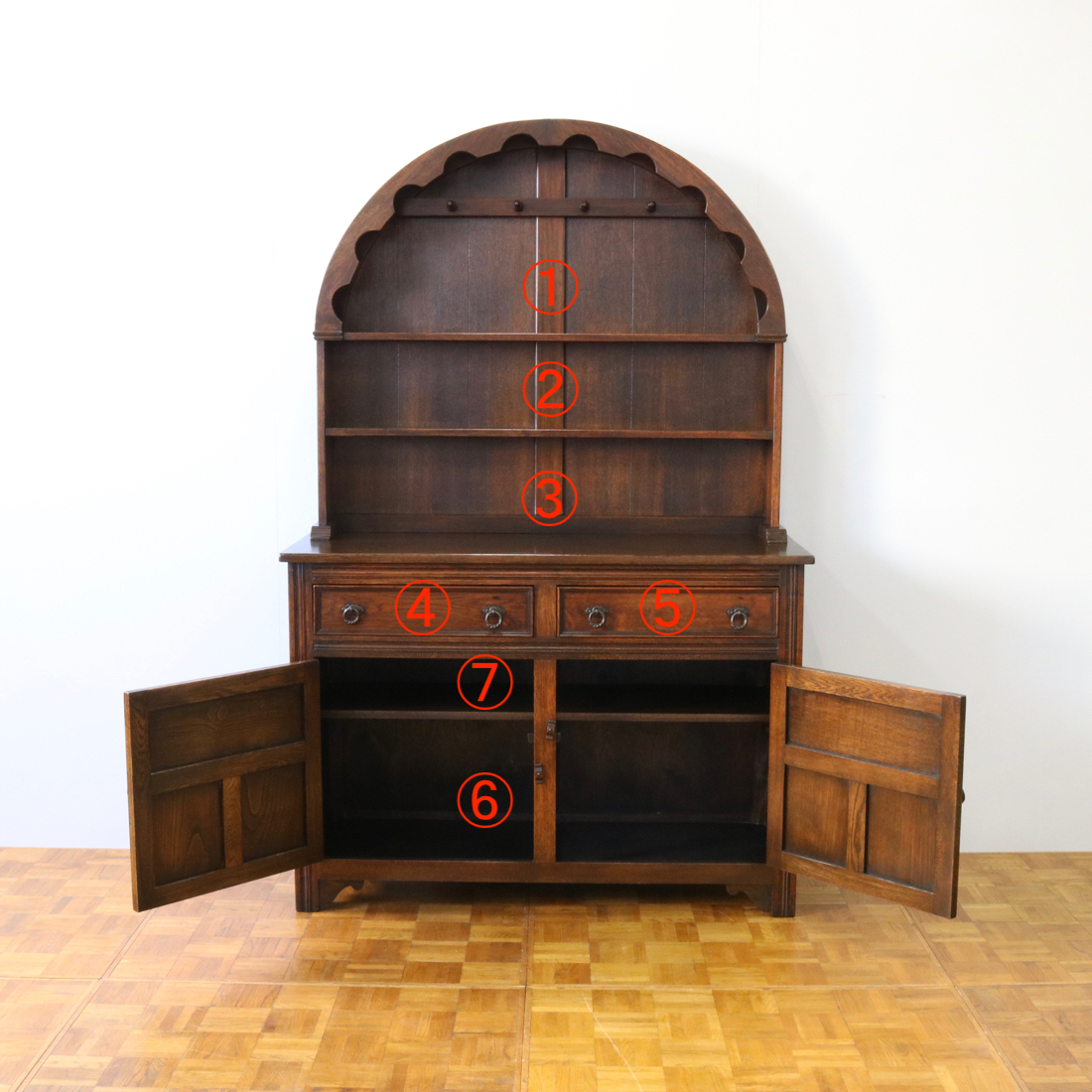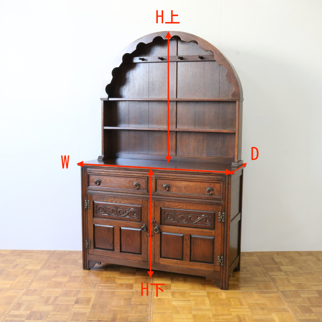 配送料の目安 ▶︎オーク材のウェルシュドレッサー。アーチ型のトップが可愛らしく飾るプレートなどの食器類が美しく見えます。下は引き出しと隠せる扉収納で実用性の高い仕様です。
