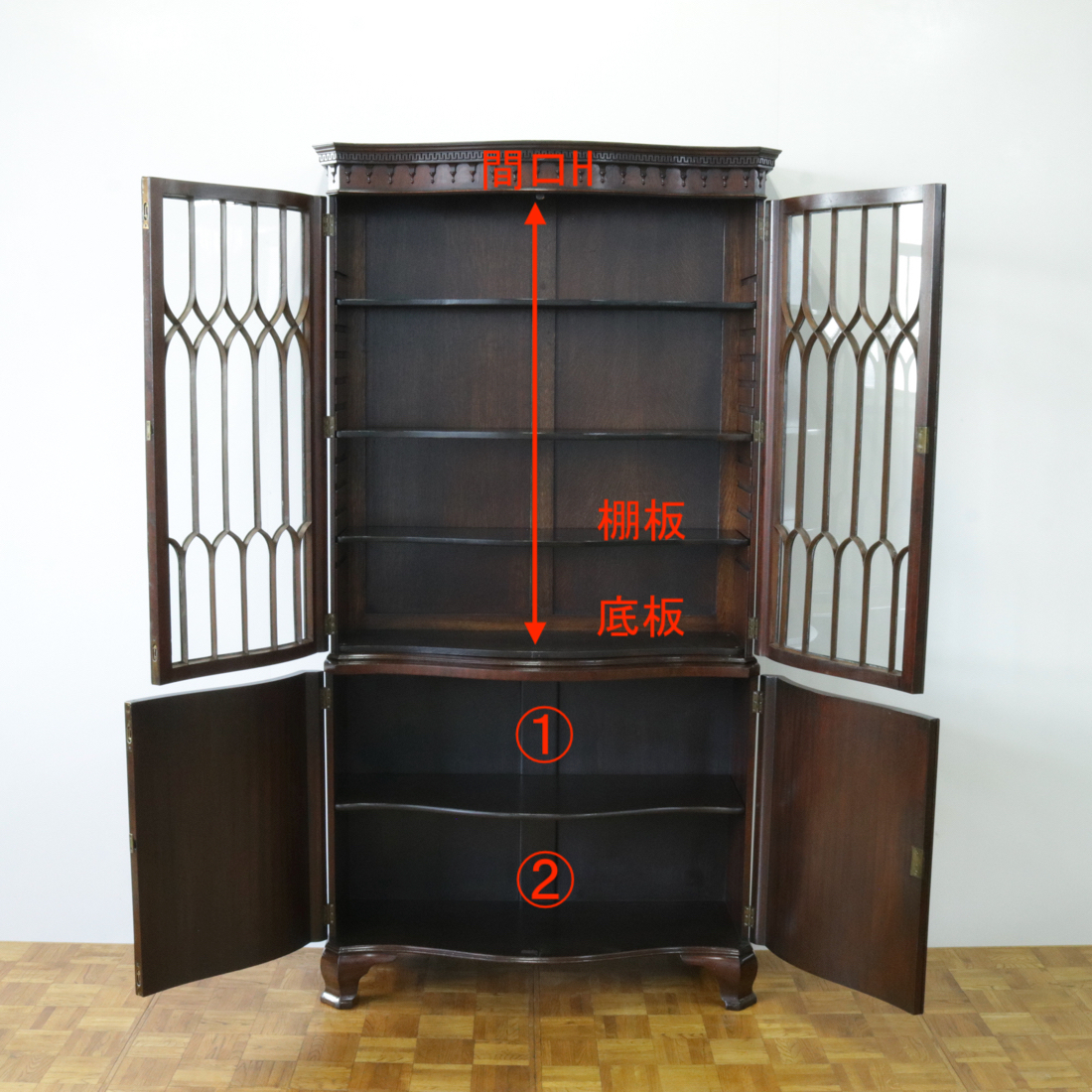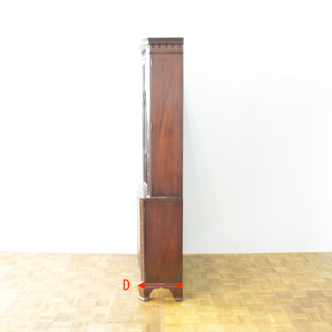 配送料の目安 ▶︎1930年代、マホガニー のブックケース 。前面の緩やかな曲線ラインが優雅な佇まい。ガラス扉と木の扉で、見せる収納と隠す収納の2パターンが可能な使い勝手の良さも魅力的です。