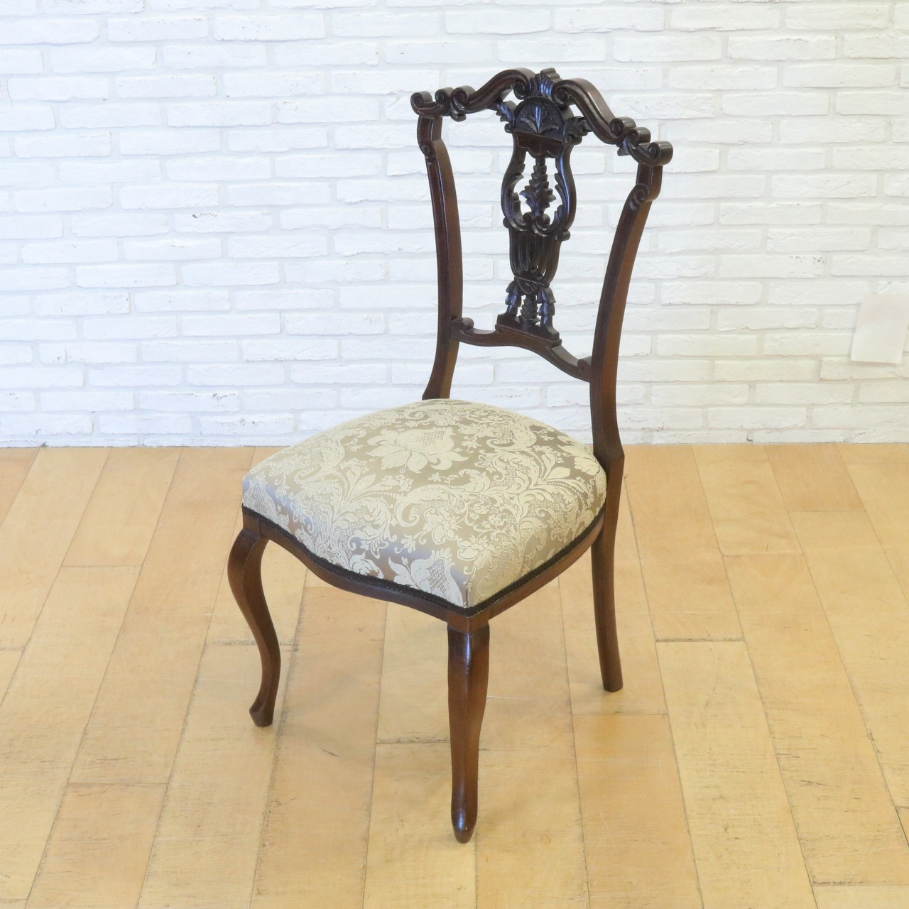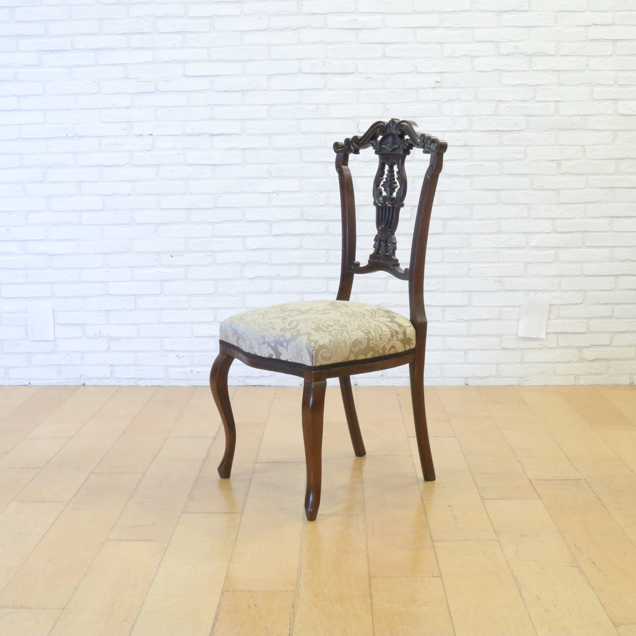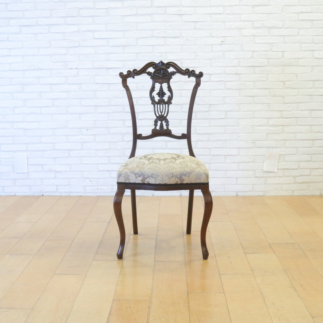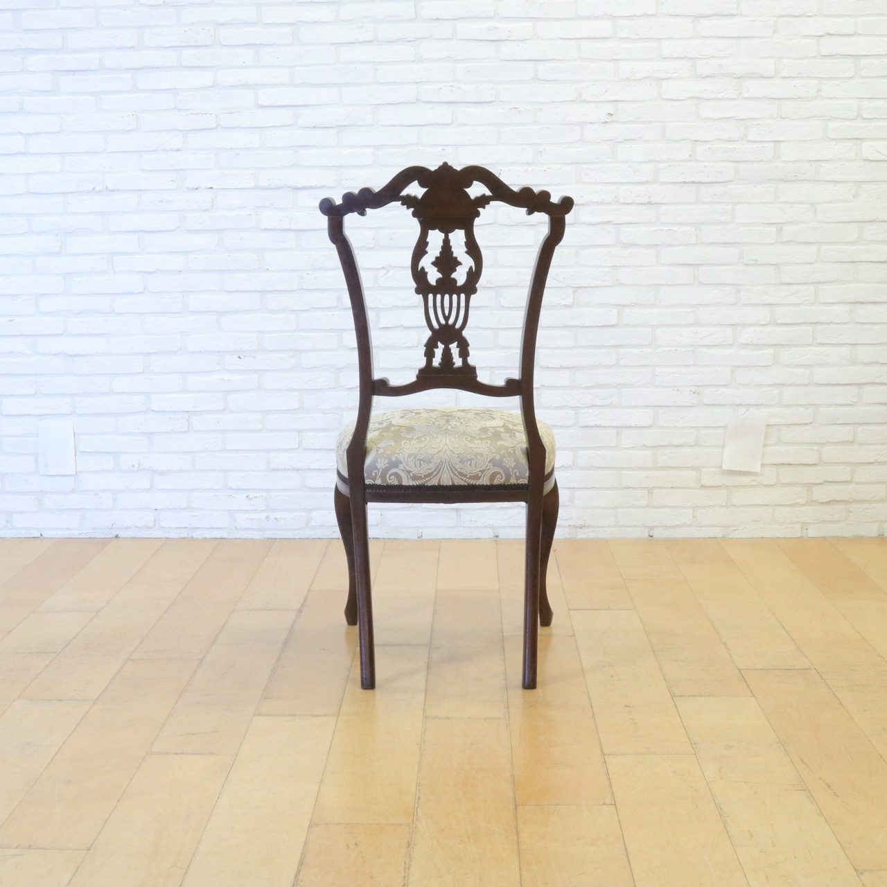 背もたれの彫刻が華やかで、アンティークらしい佇まいです。