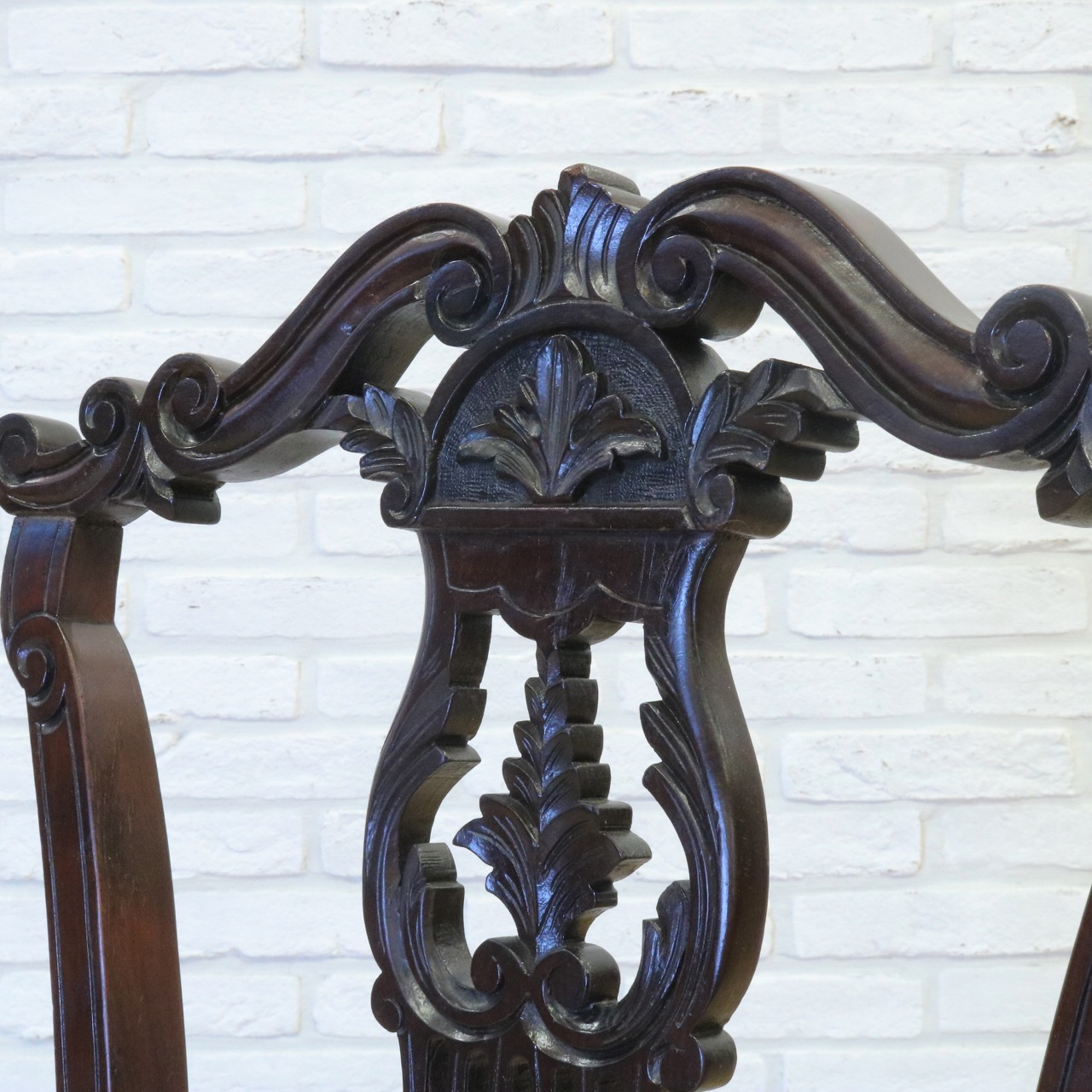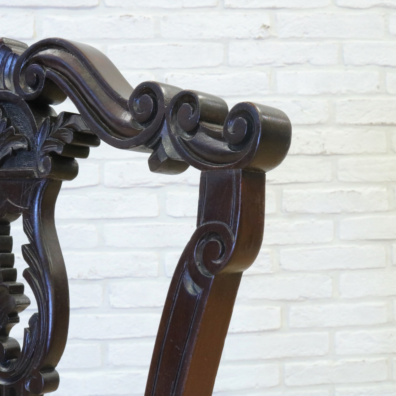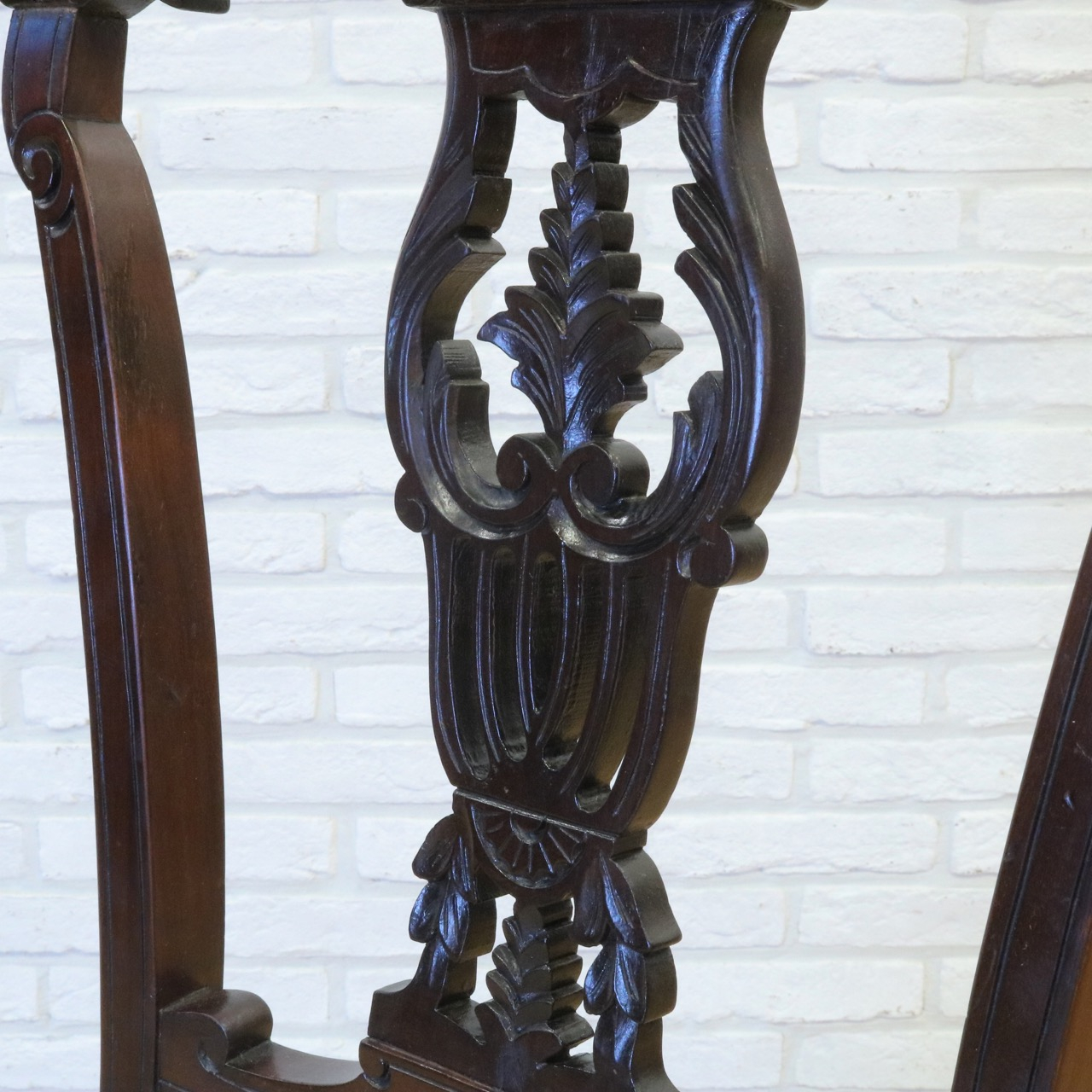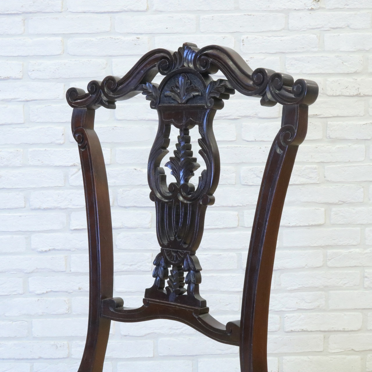背もたれの彫刻が華やかで、アンティークらしい佇まいです。