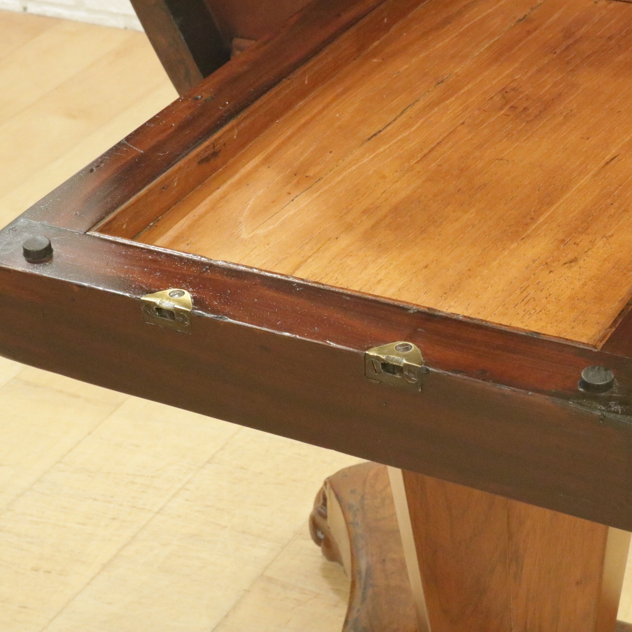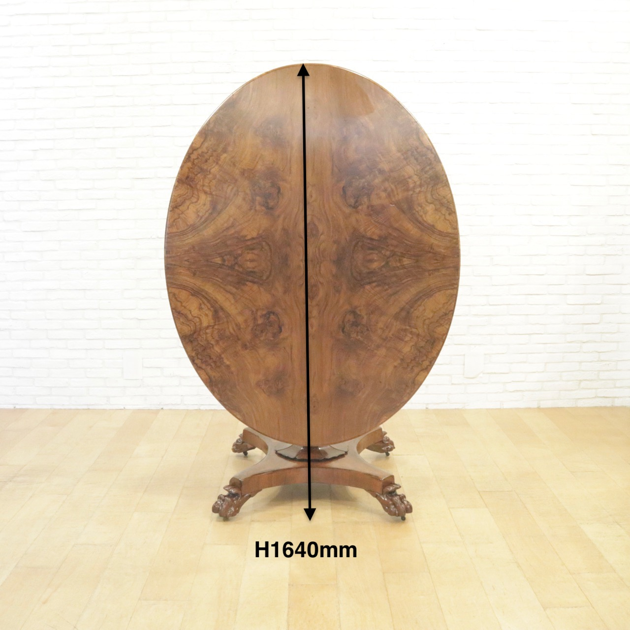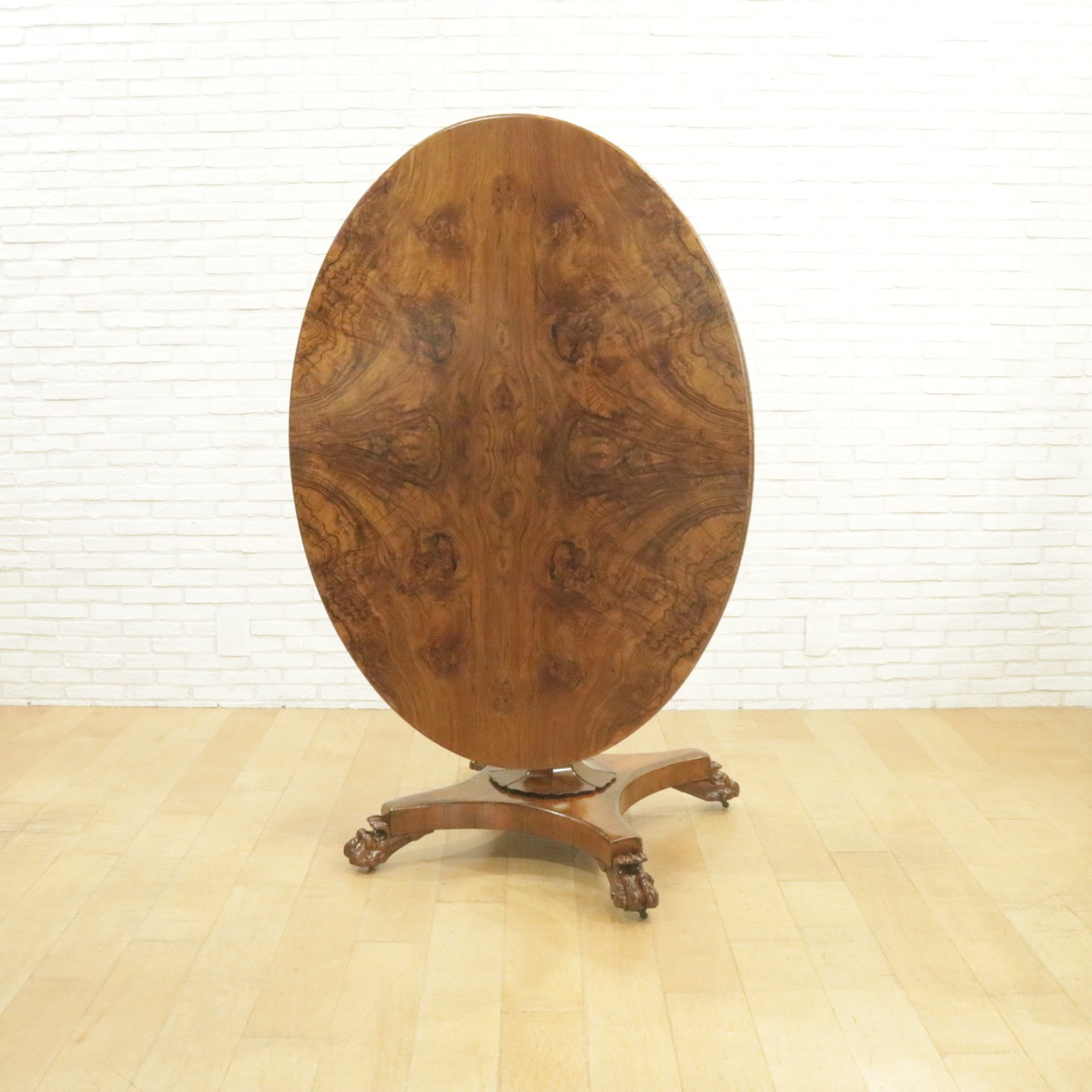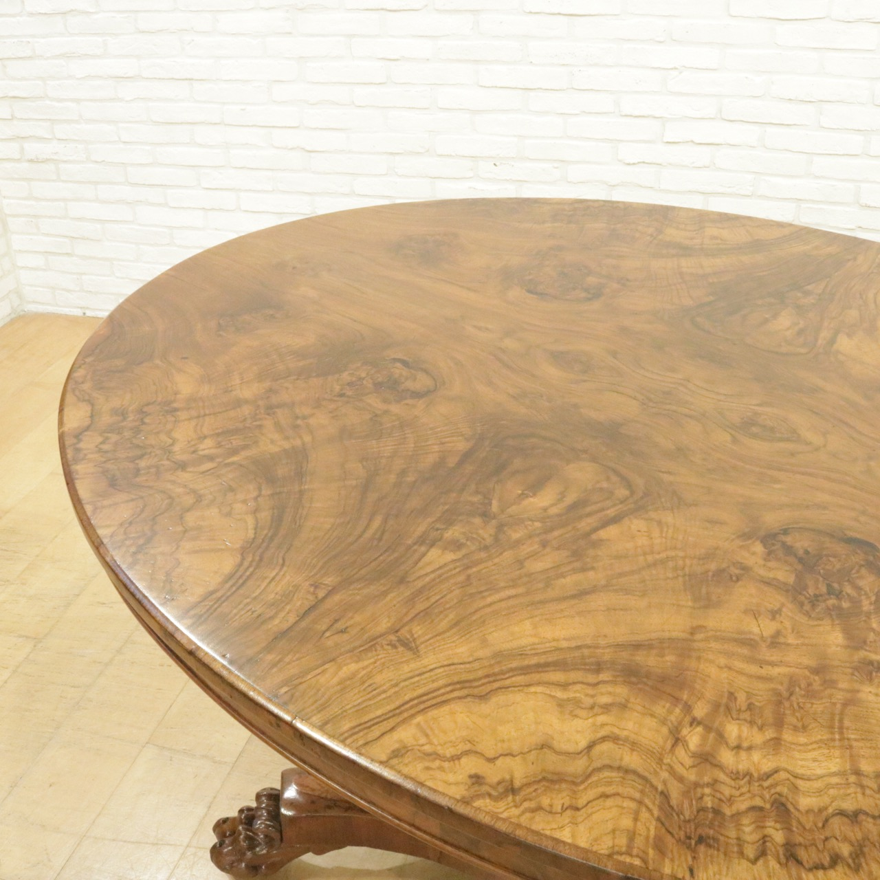 ウォールナットの美しい木目が楽しめる分厚い天板、毛並みを感じさせる技術の高さが現れている獣足と、アンティークらしい重厚感にあふれたテーブルです。