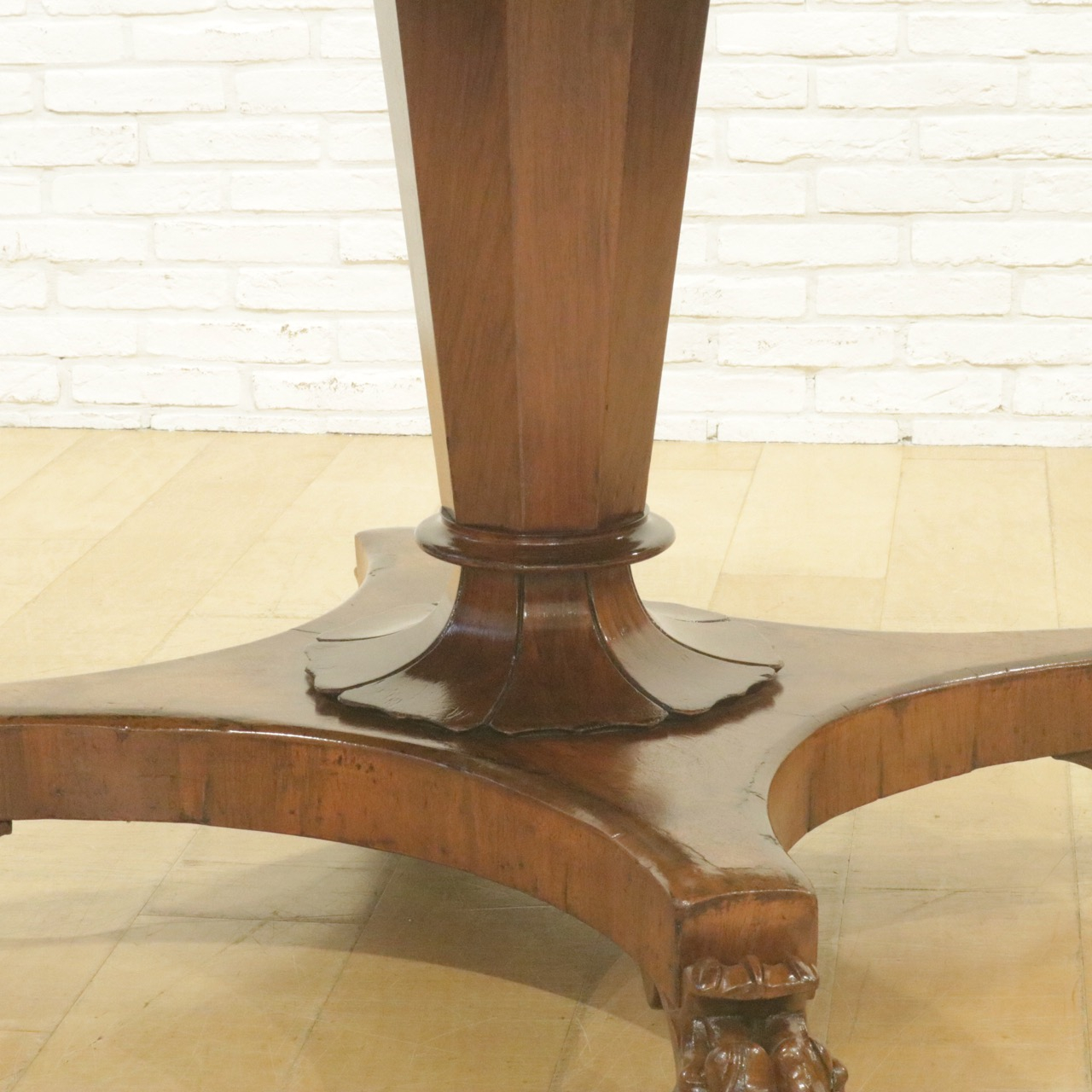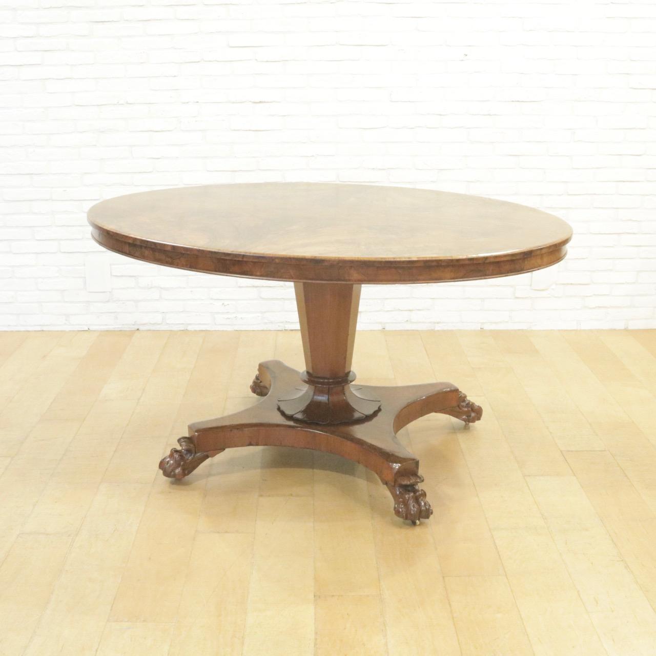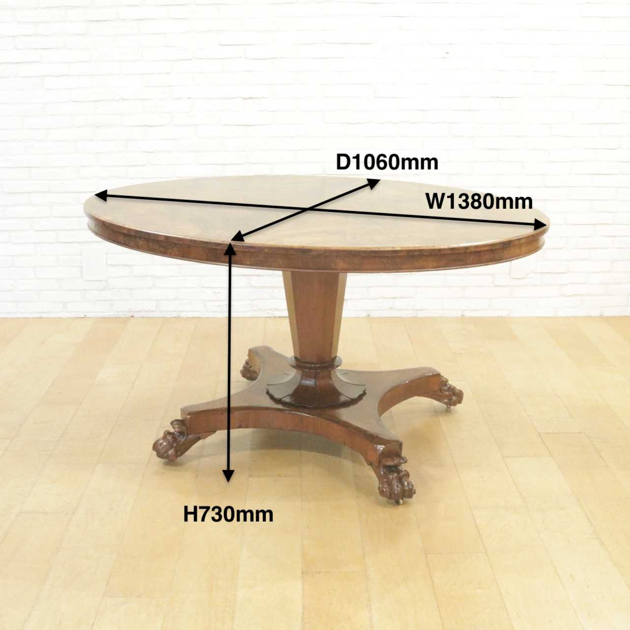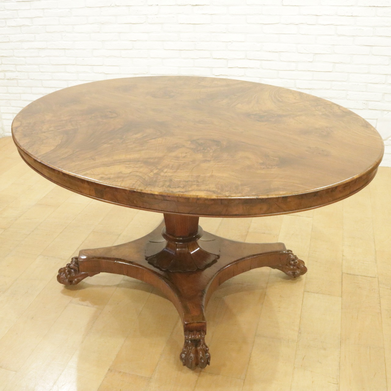ウォールナットの美しい木目が楽しめる分厚い天板、毛並みを感じさせる技術の高さが現れている獣足と、アンティークらしい重厚感にあふれたテーブルです。