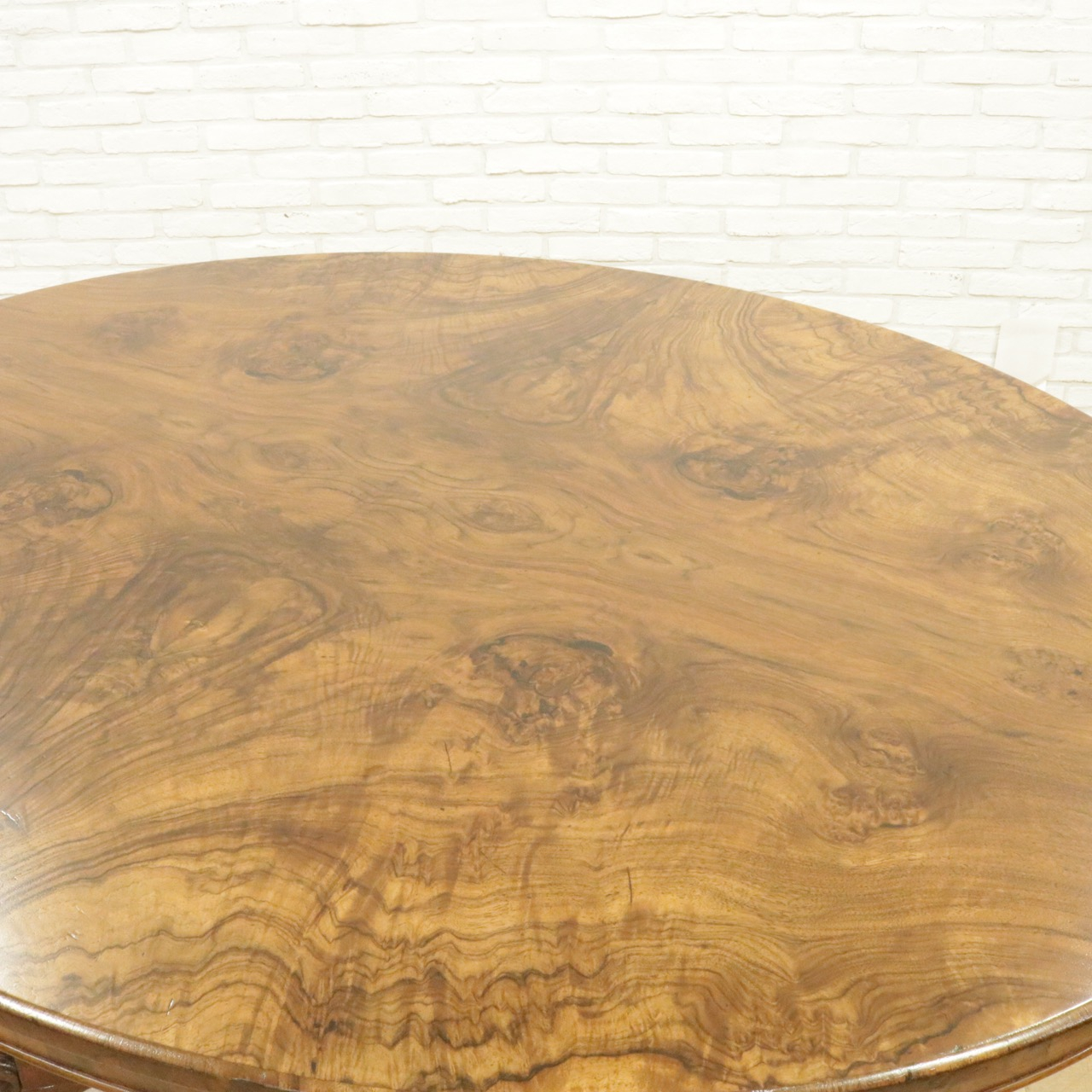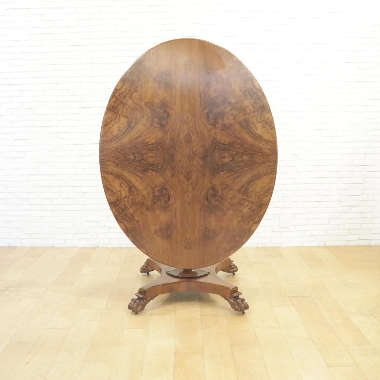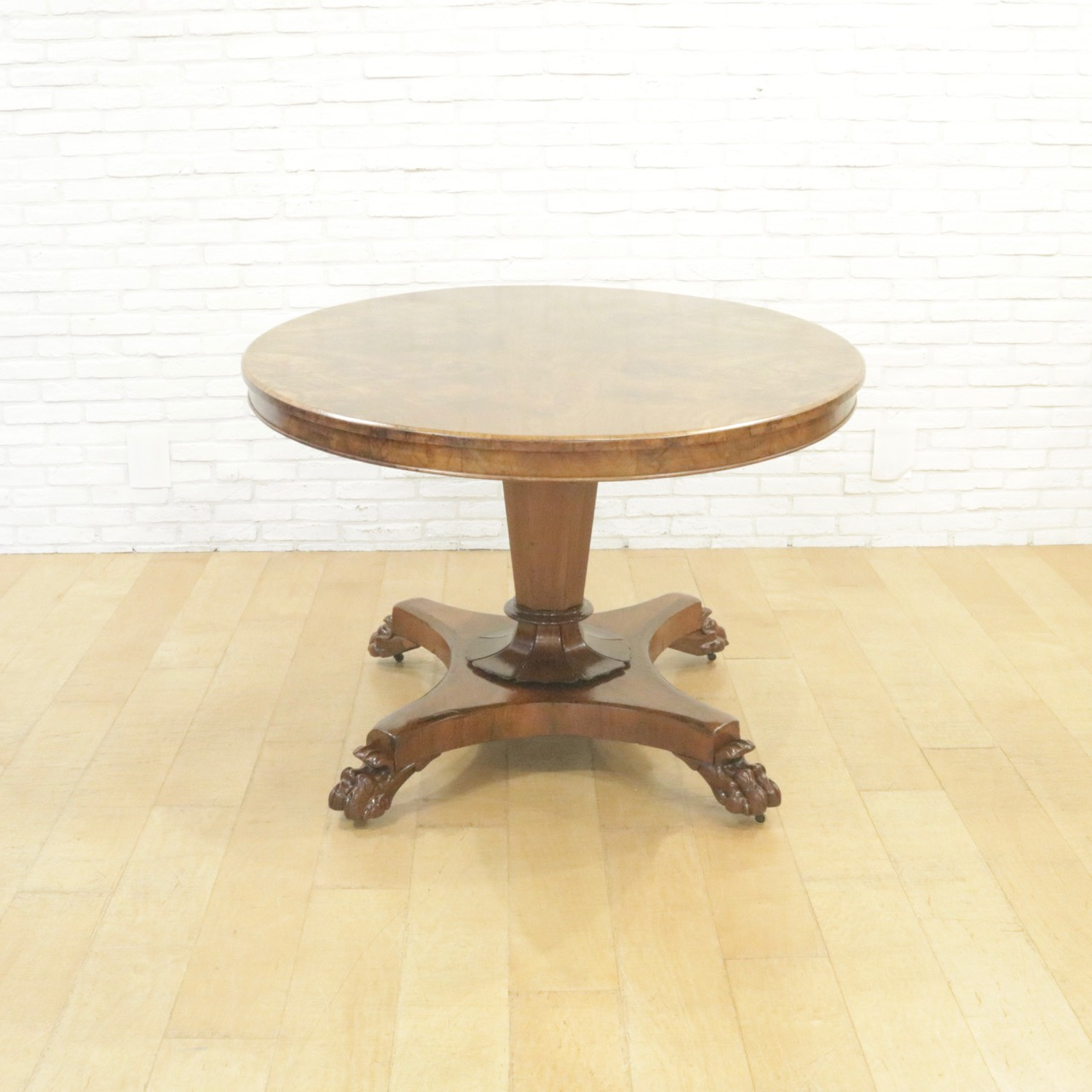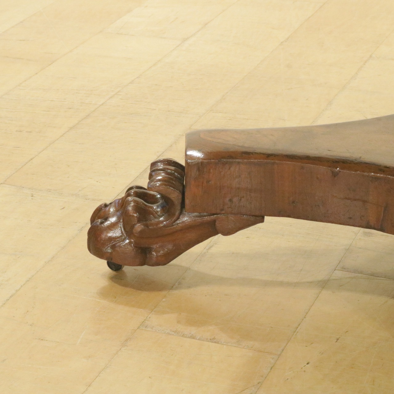 ウォールナットの美しい木目が楽しめる分厚い天板、毛並みを感じさせる技術の高さが現れている獣足と、アンティークらしい重厚感にあふれたテーブルです。