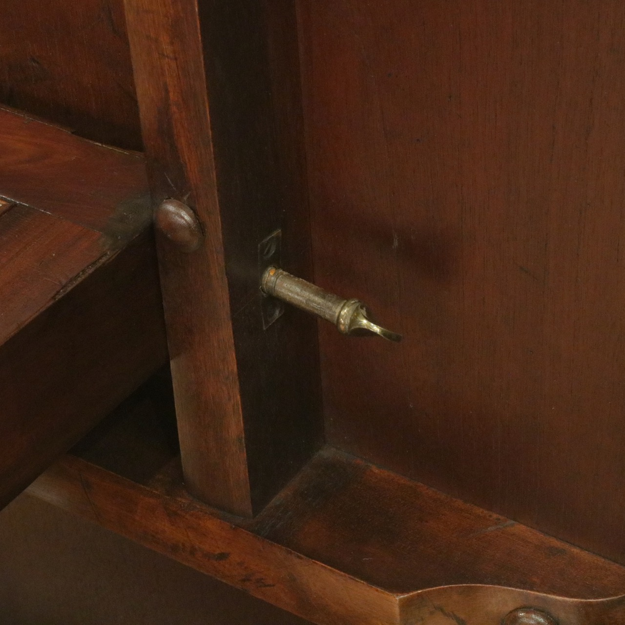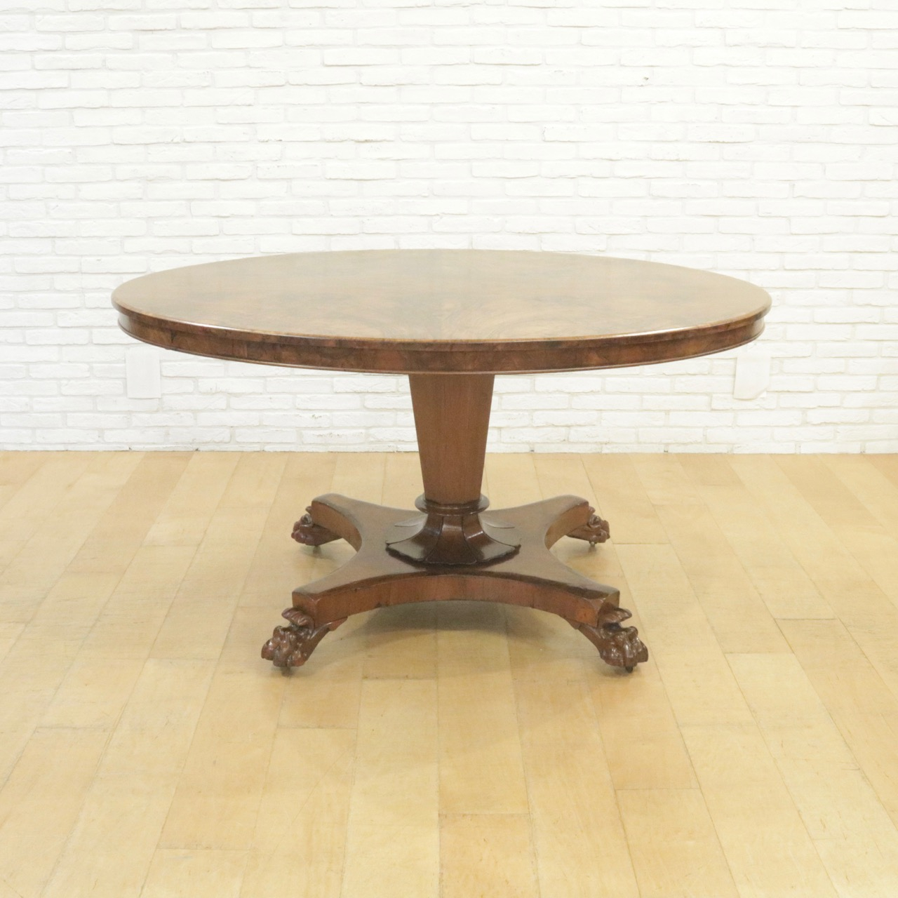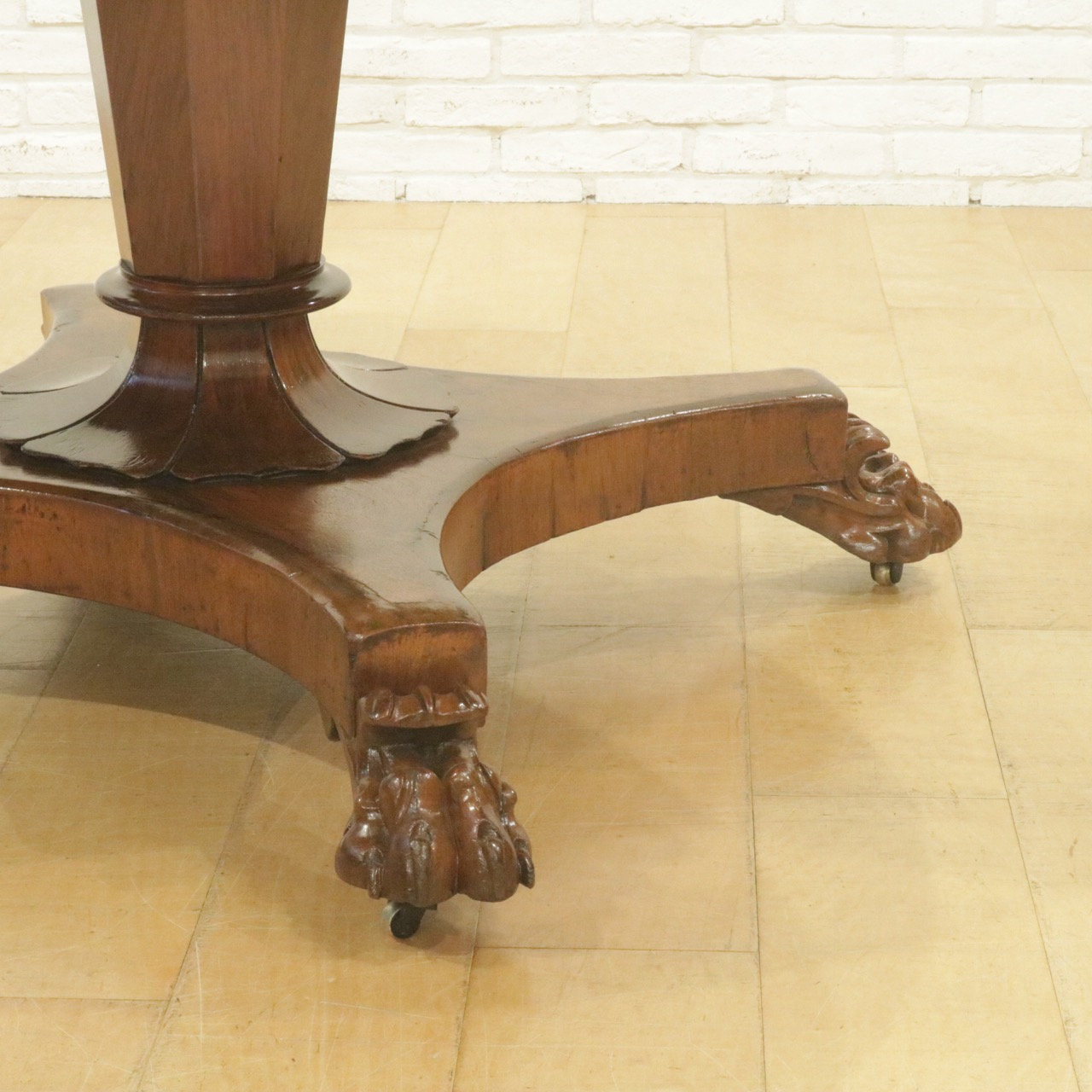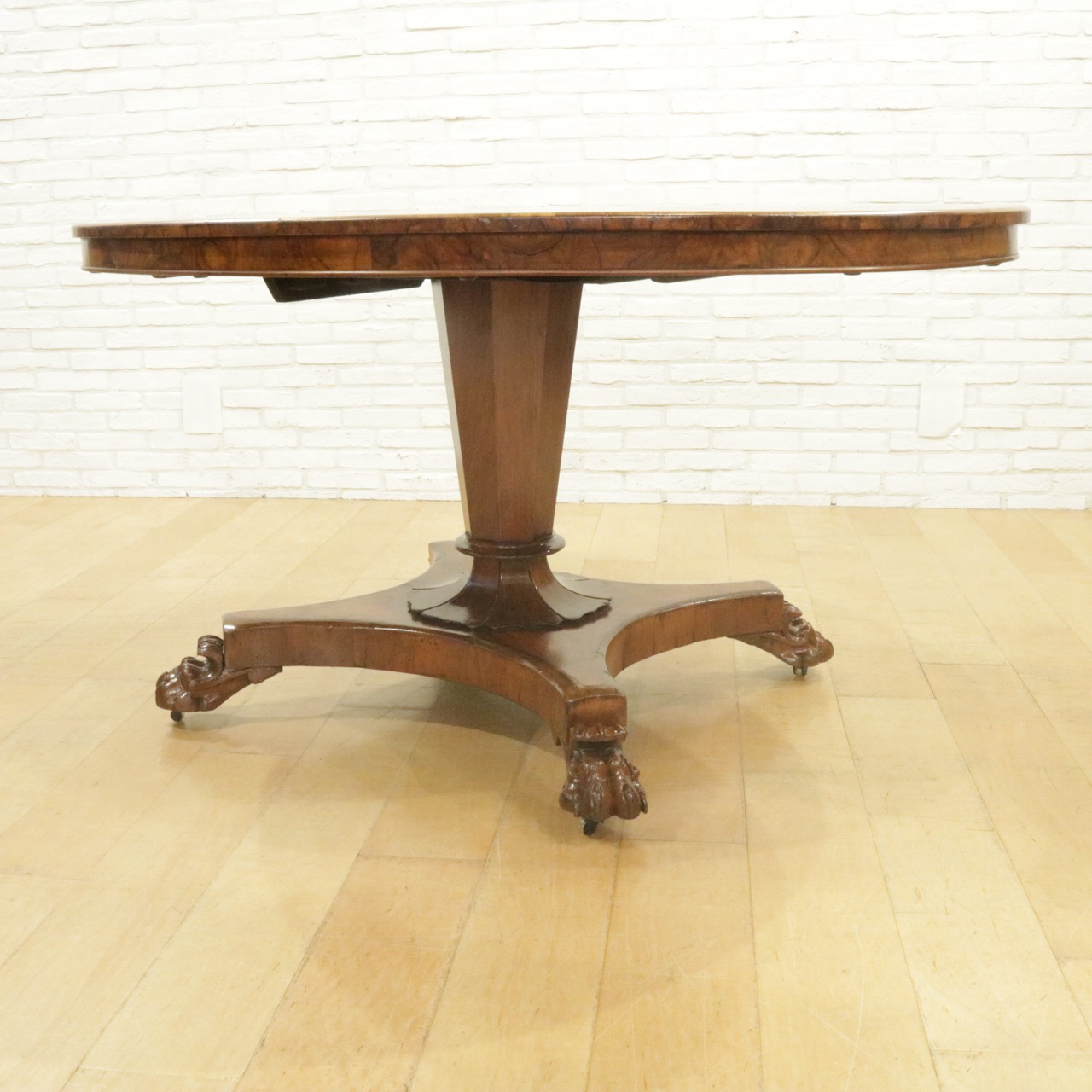 ウォールナットの美しい木目が楽しめる分厚い天板、毛並みを感じさせる技術の高さが現れている獣足と、アンティークらしい重厚感にあふれたテーブルです。