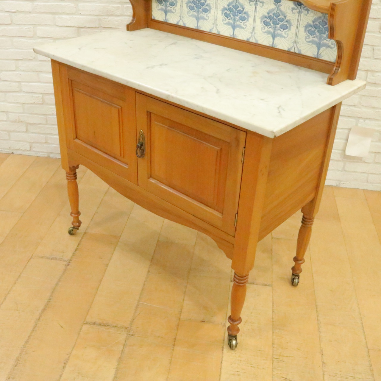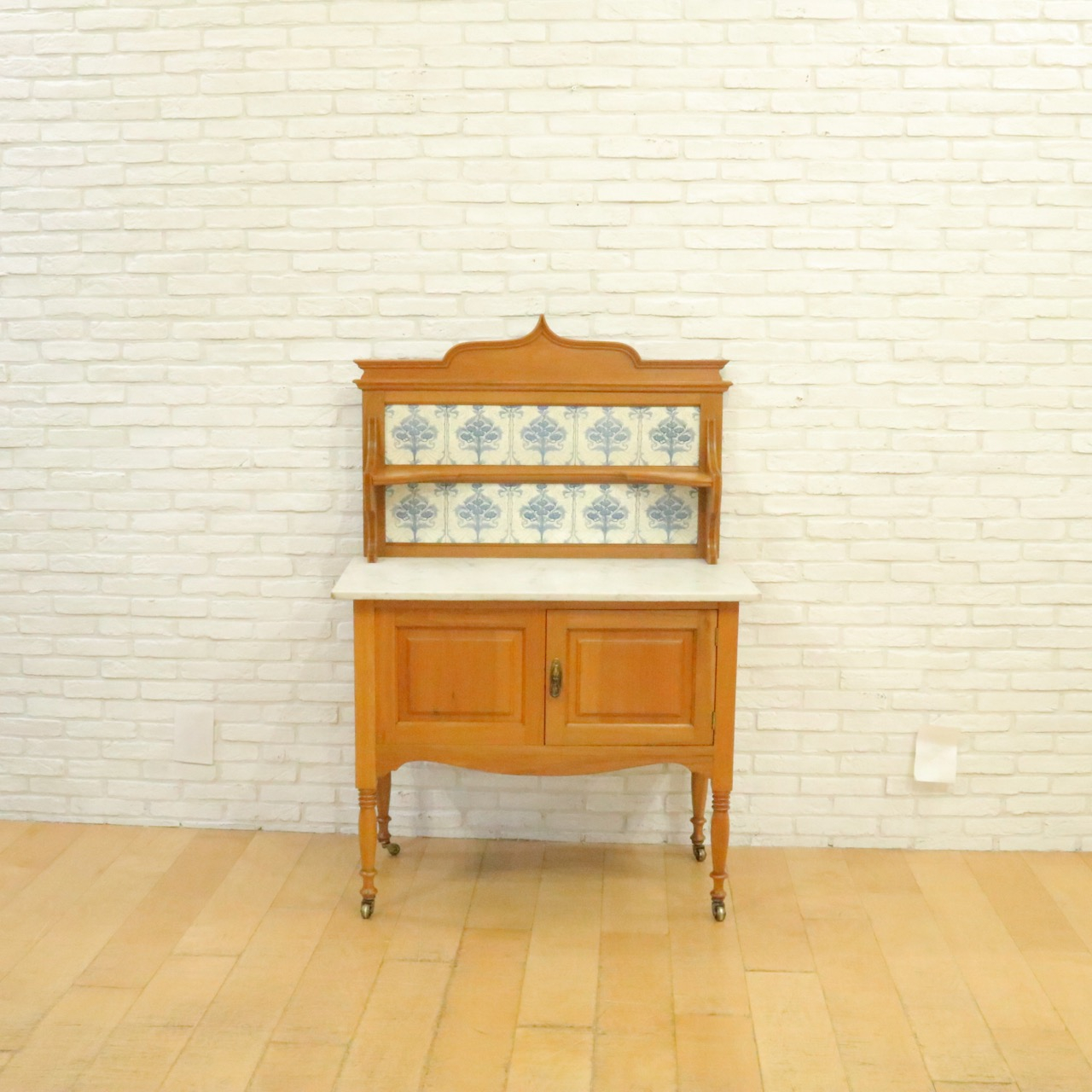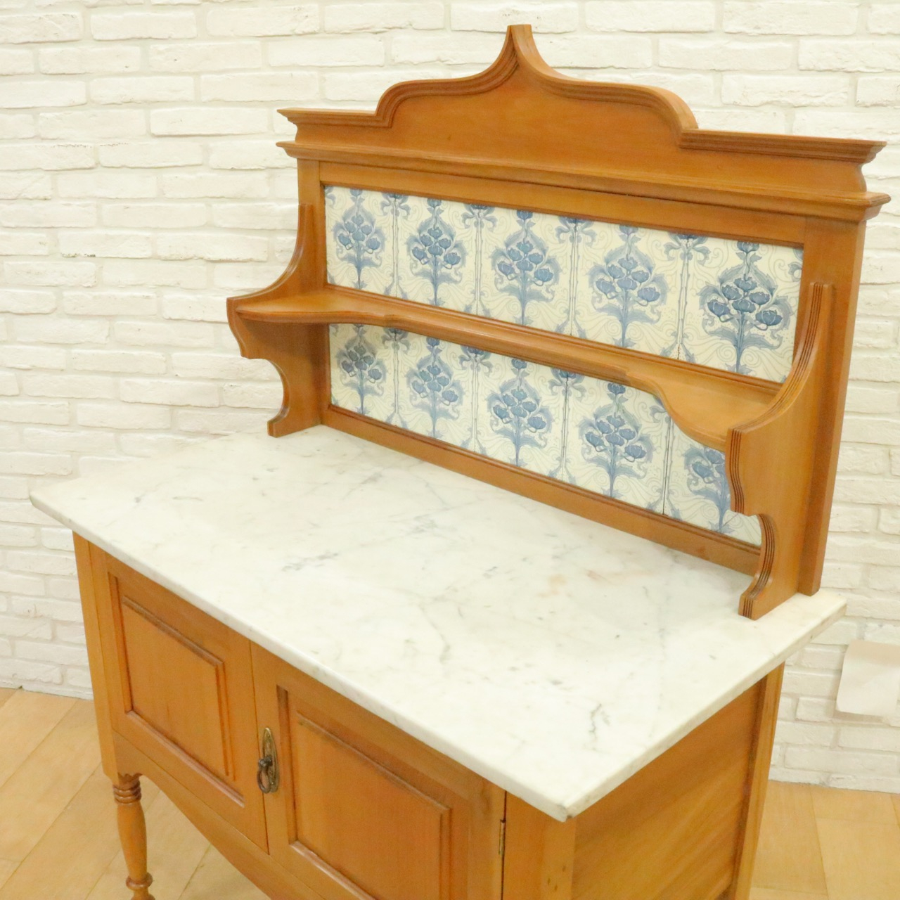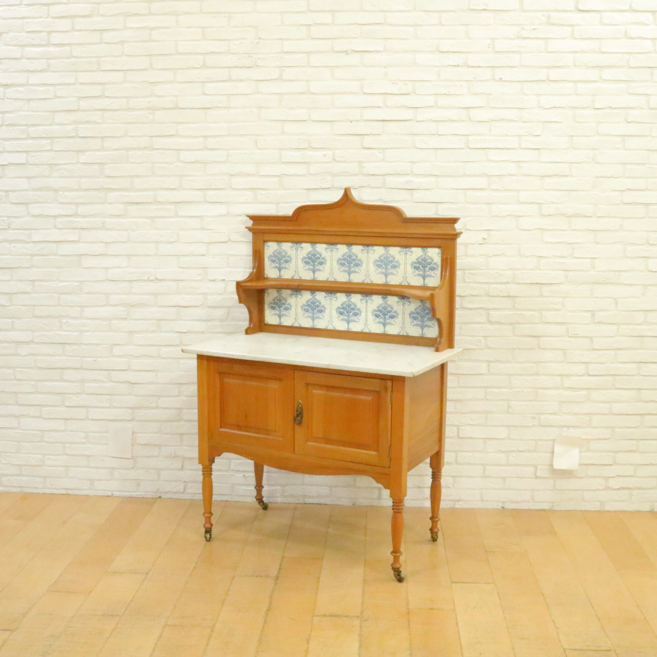 白地にライトブルーの爽やかなタイルが一際目を引くウォッシュハンドスタンドです。