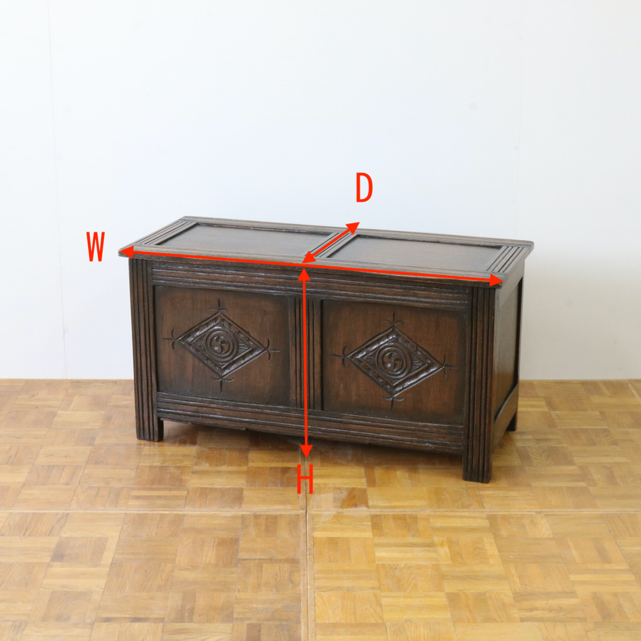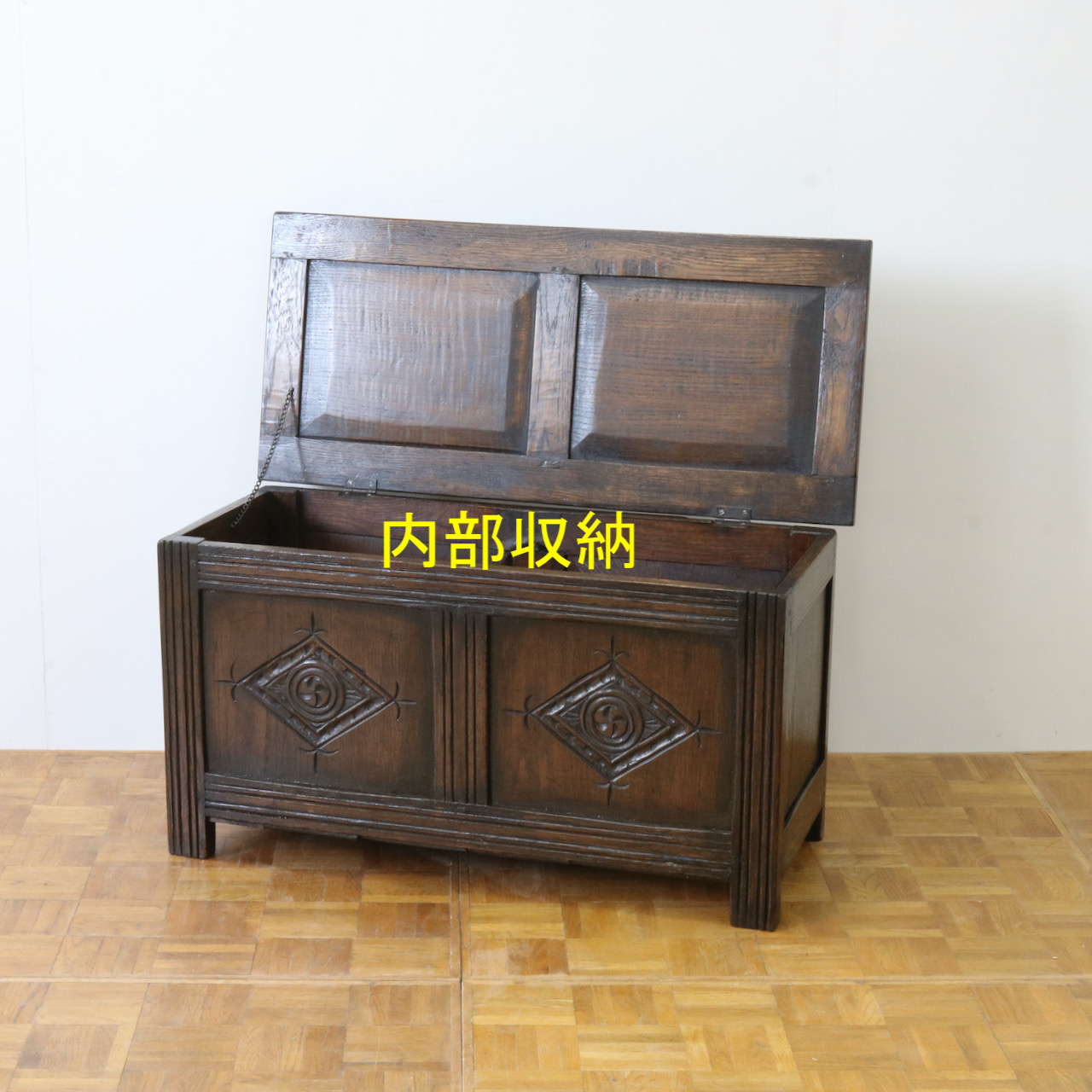 配送料の目安 ▶︎1930年代、オーク材のブランケットチェスト。本来は季節ごとの寝具や衣類をしまうための家具ですが、かさばるものを何でも収納できる、便利なアイテムです。