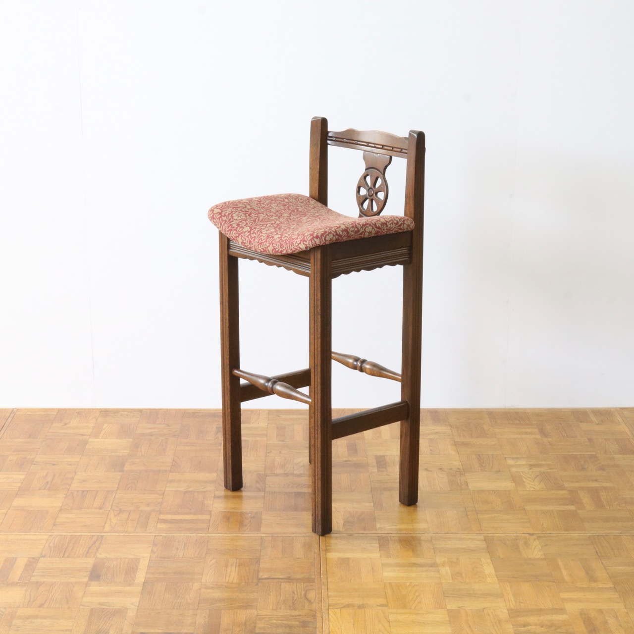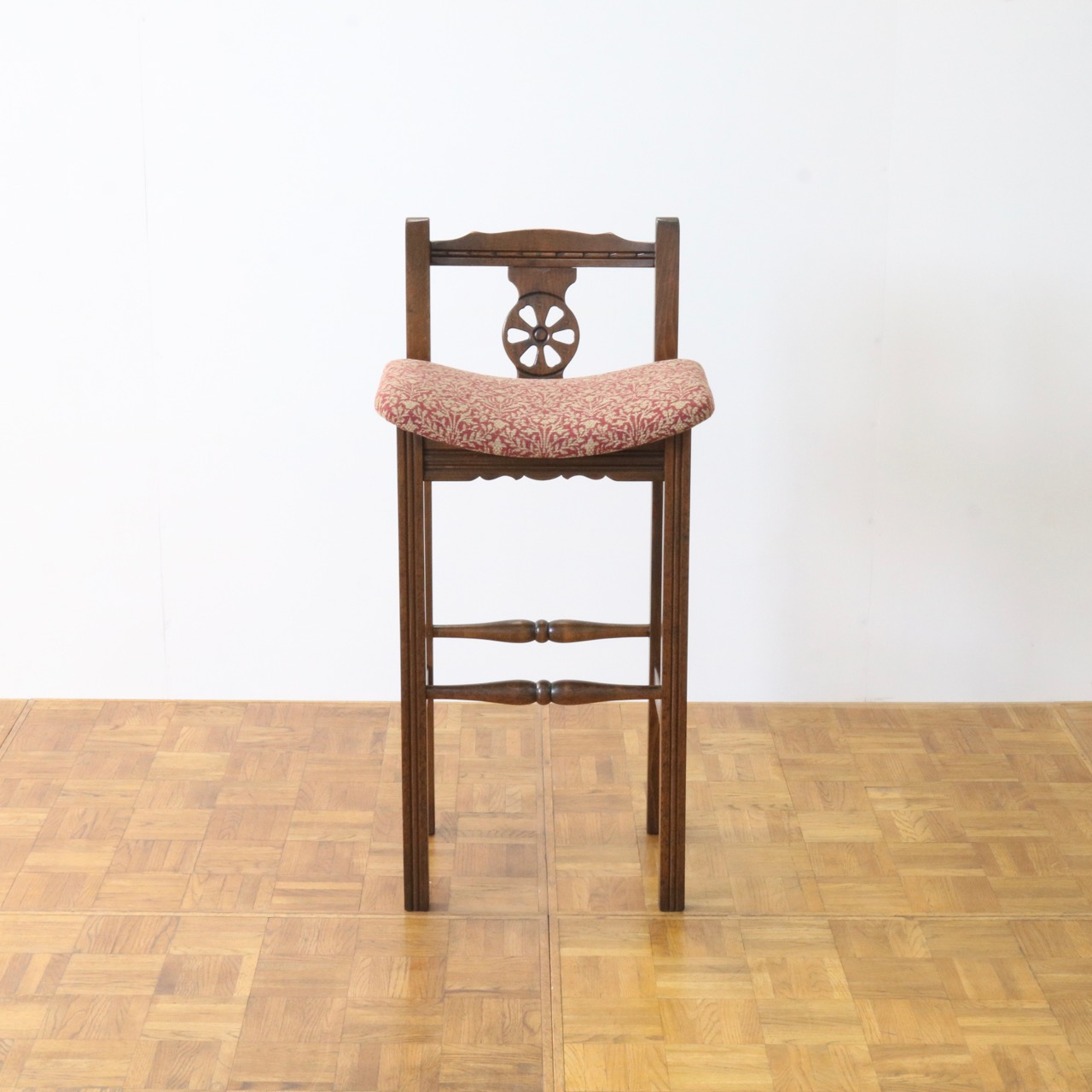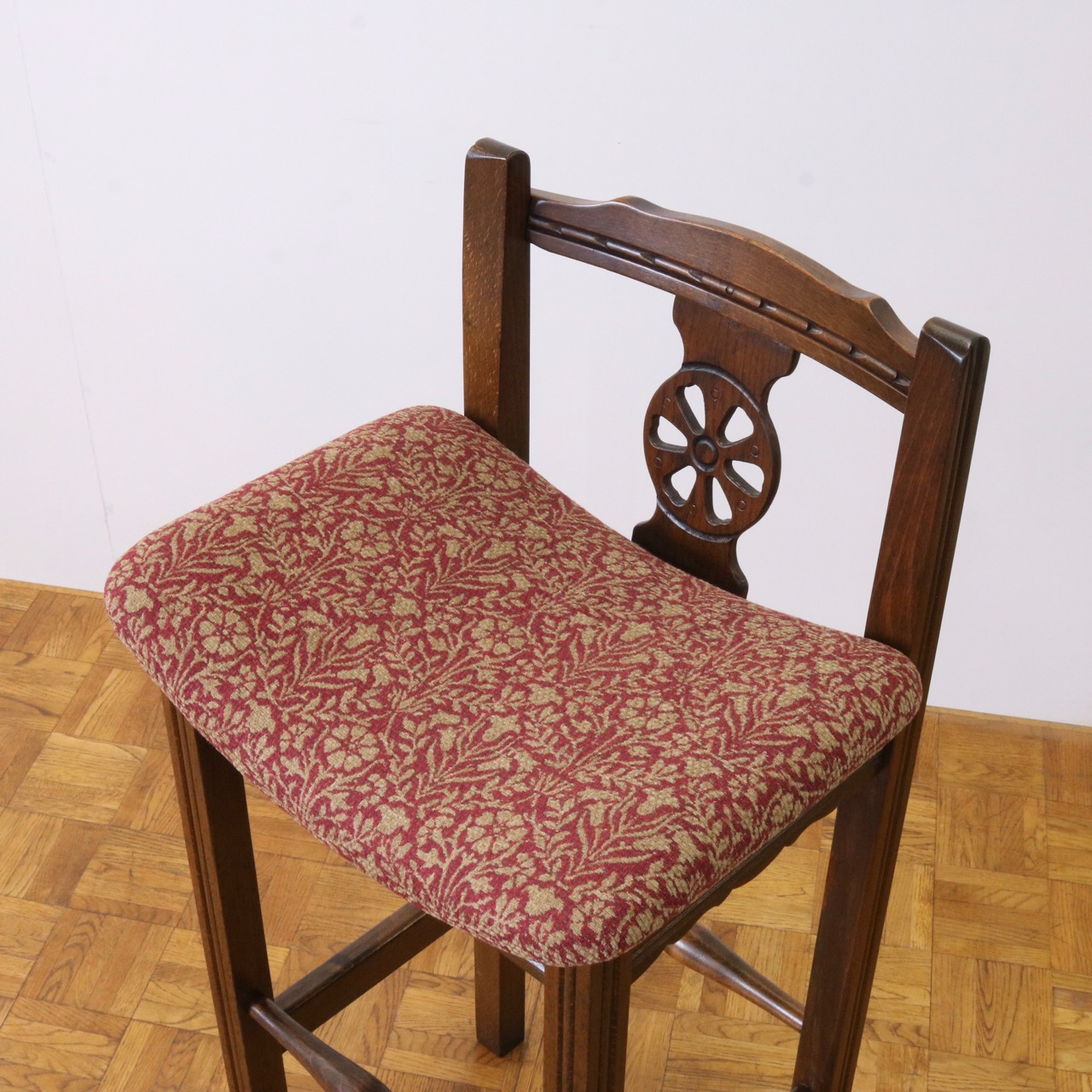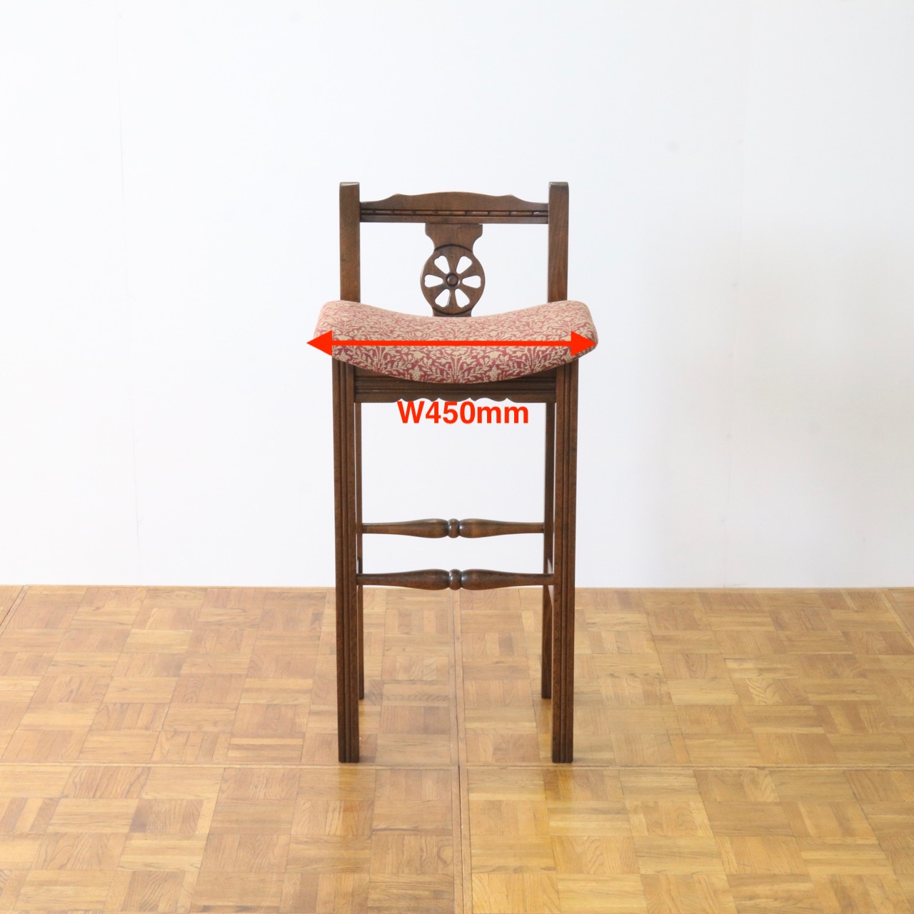 配送料の目安 ▶︎オーク材のスツール 。背にはクラシックな車輪のデザインがアクセント。ハイスツールなのでカウンターなどにお使いいただくのにおすすめです。座面の生地はウィリアム・モリスの"Bellflowers"で張り替えました。