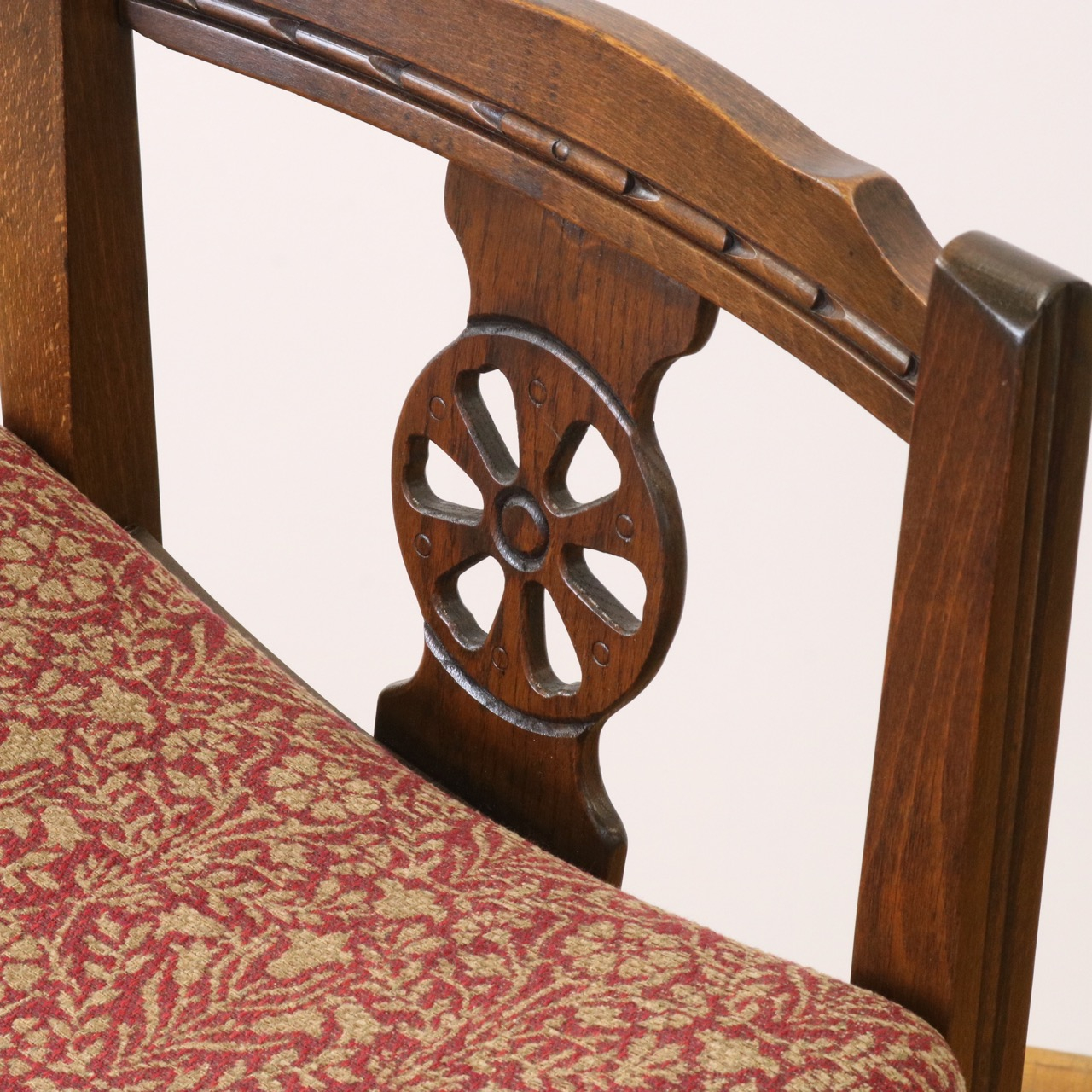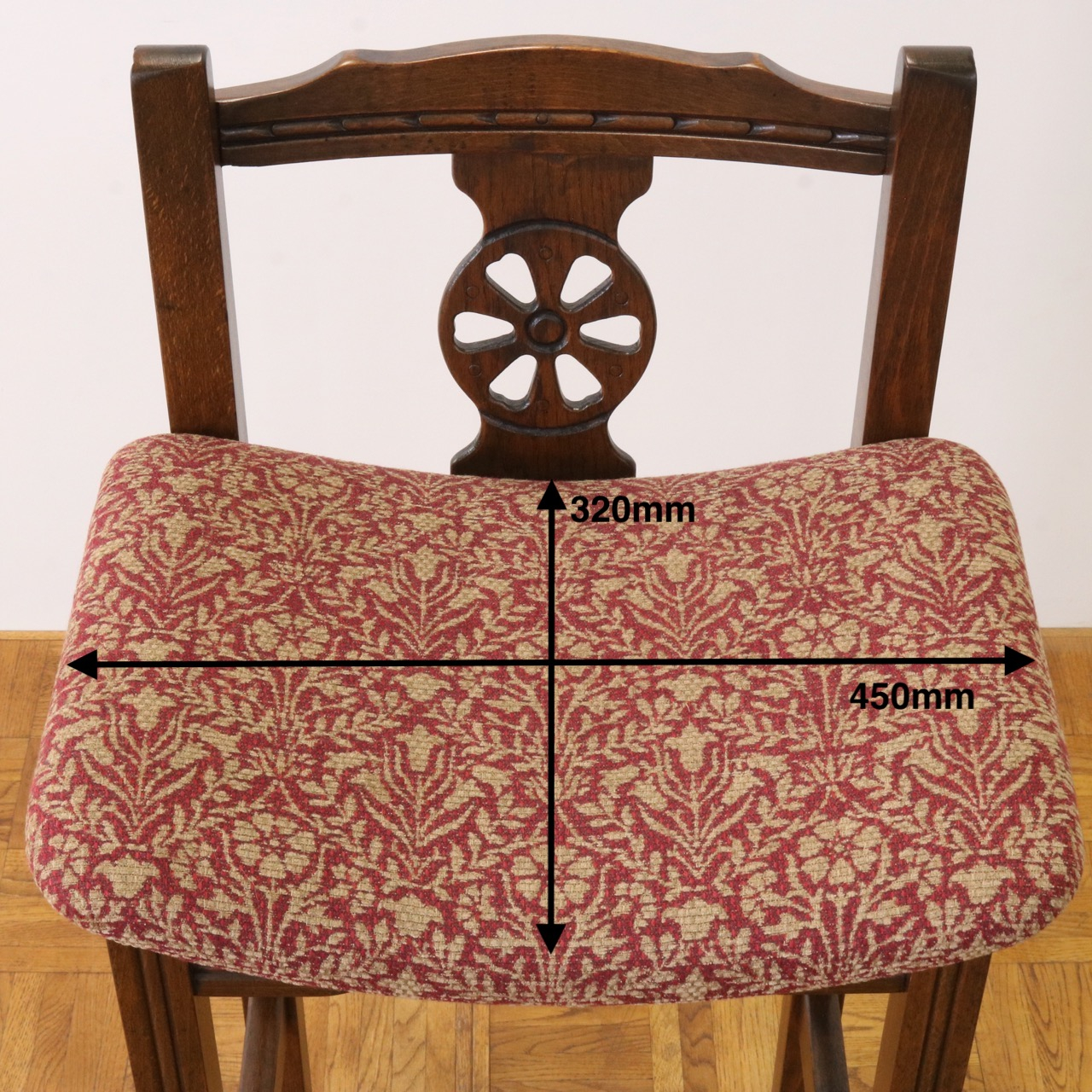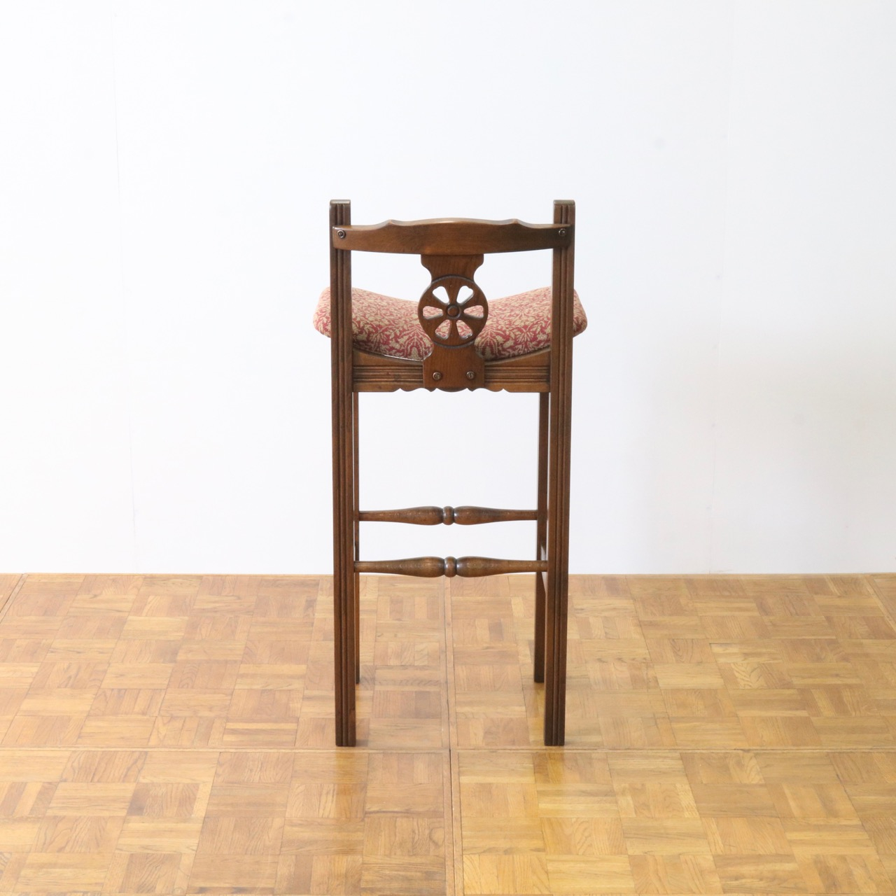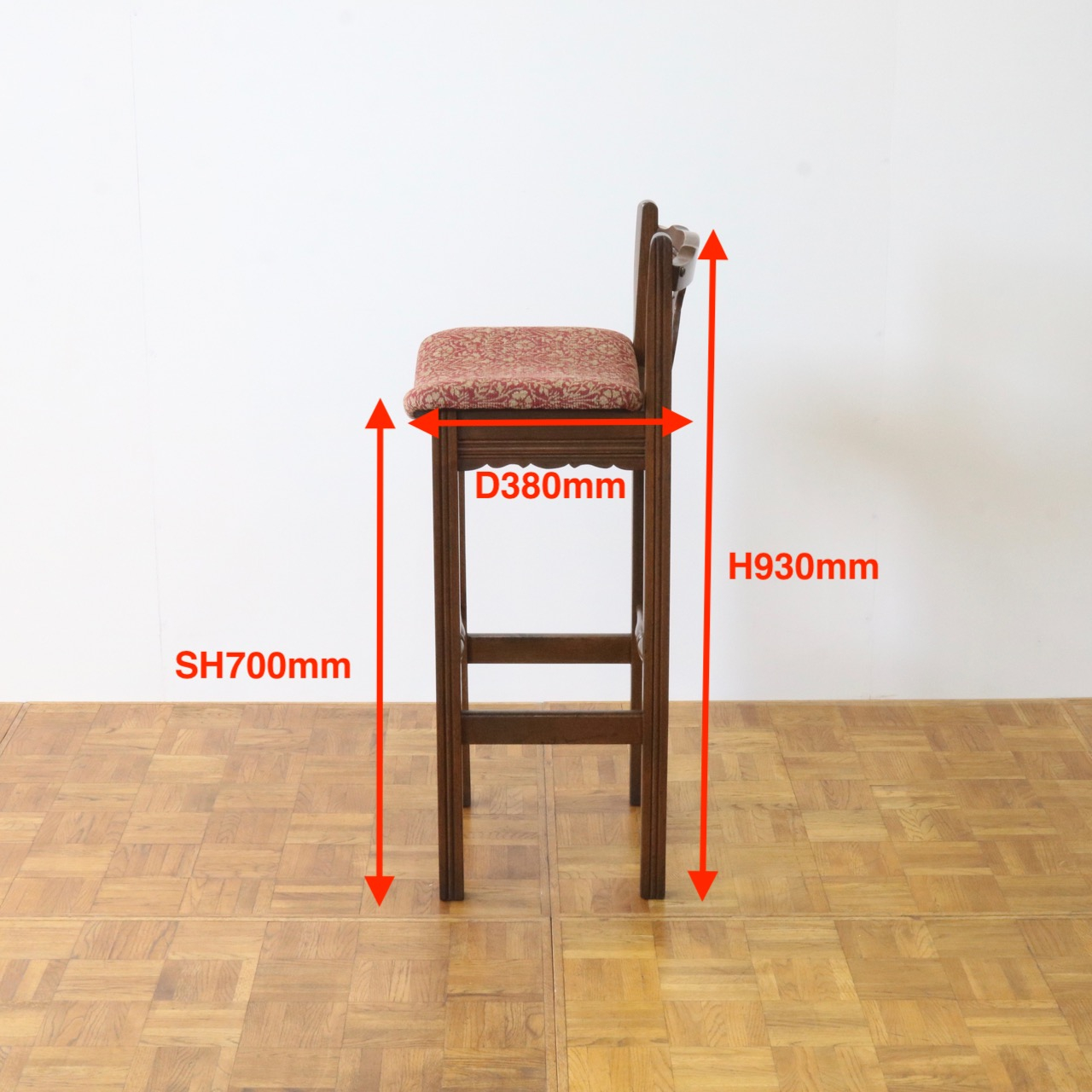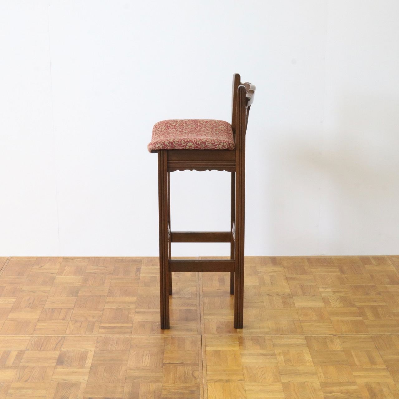 配送料の目安 ▶︎オーク材のスツール 。背にはクラシックな車輪のデザインがアクセント。ハイスツールなのでカウンターなどにお使いいただくのにおすすめです。座面の生地はウィリアム・モリスの"Bellflowers"で張り替えました。