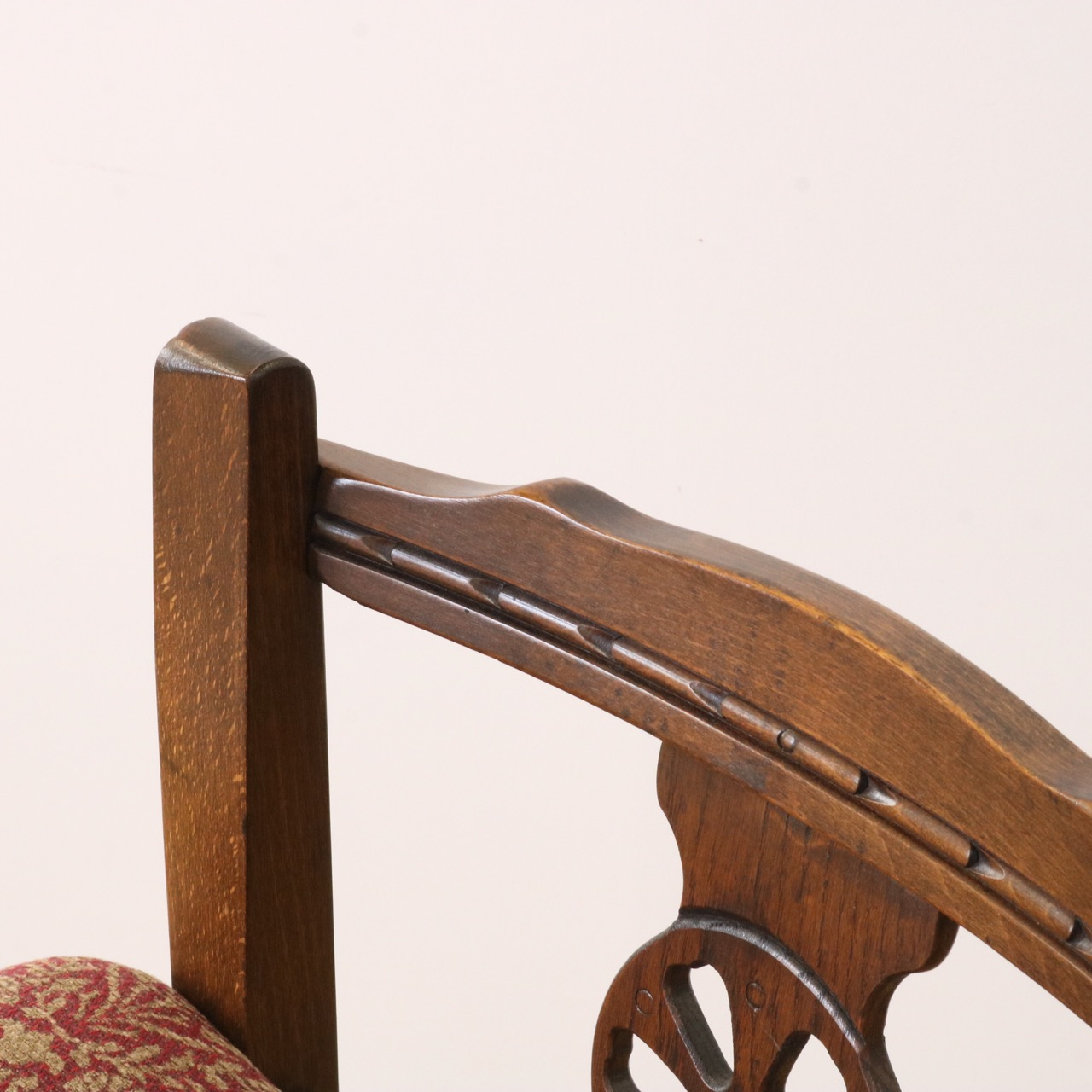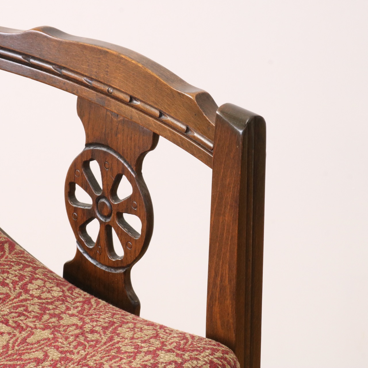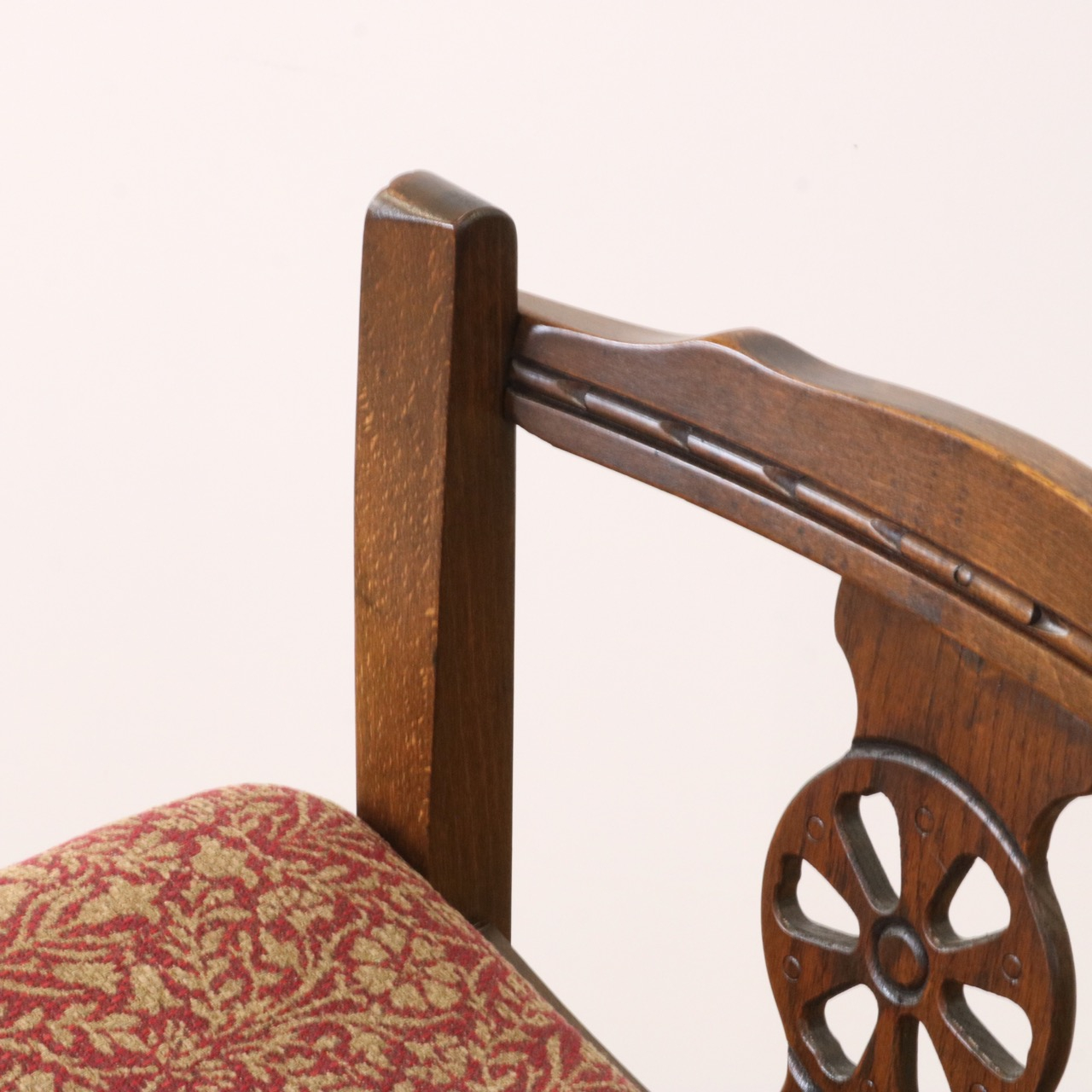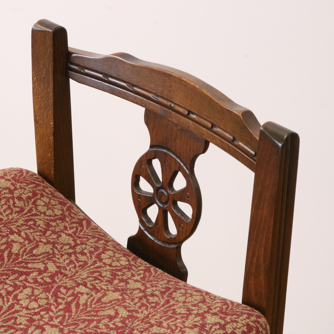 配送料の目安 ▶︎オーク材のスツール 。背にはクラシックな車輪のデザインがアクセント。ハイスツールなのでカウンターなどにお使いいただくのにおすすめです。座面の生地はウィリアム・モリスの"Bellflowers"で張り替えました。