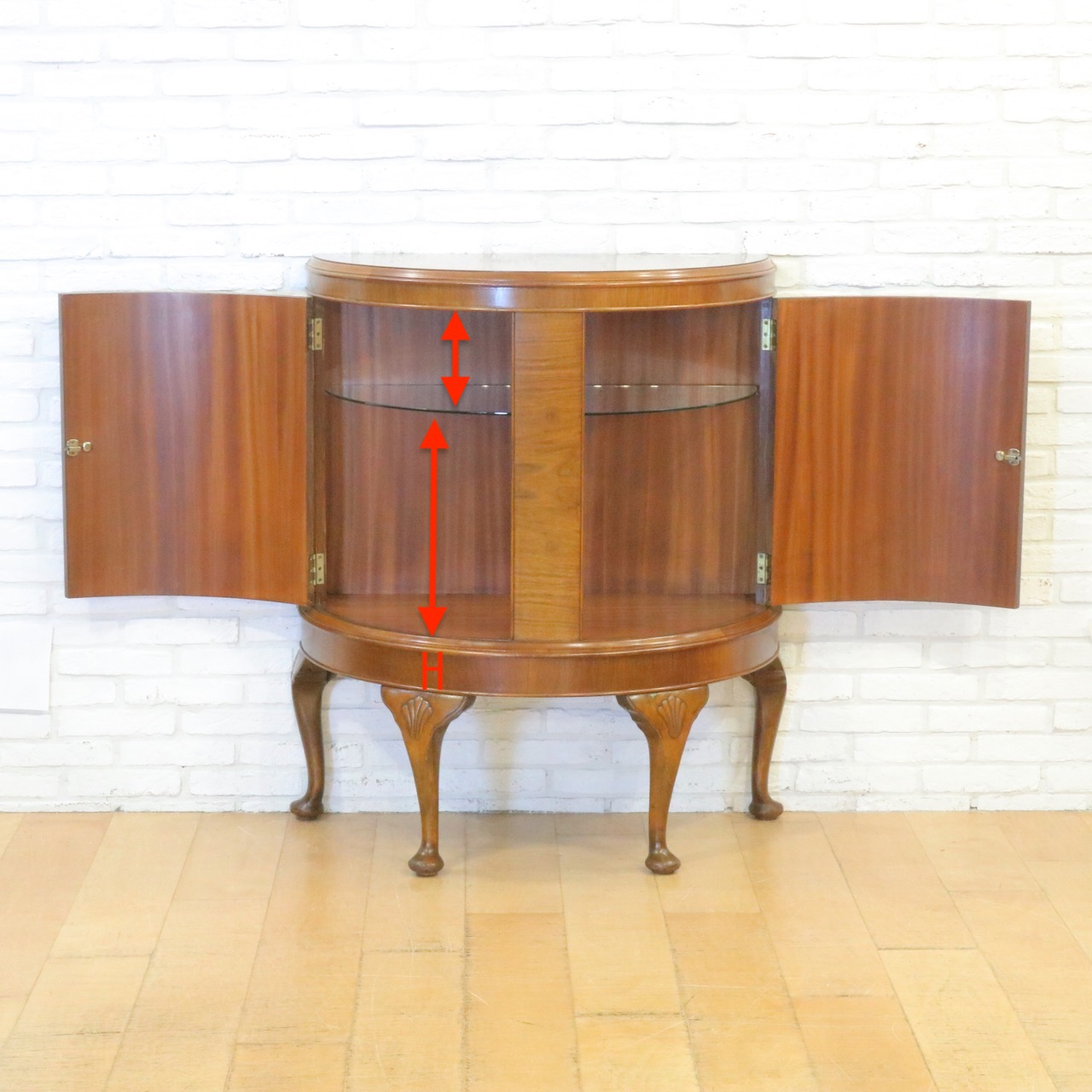 ウォールナット らしい特徴的な杢目があらわれた扉が美しく、カブリオールレッグ に貝殻のアクセントが優雅な佇まい。
