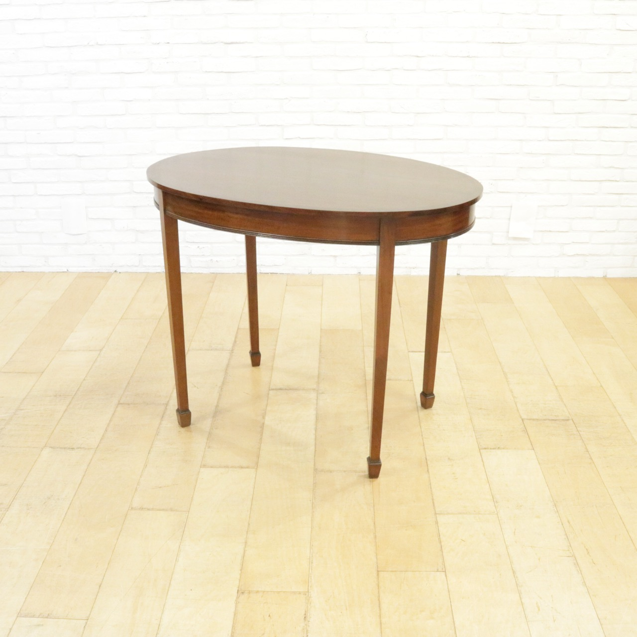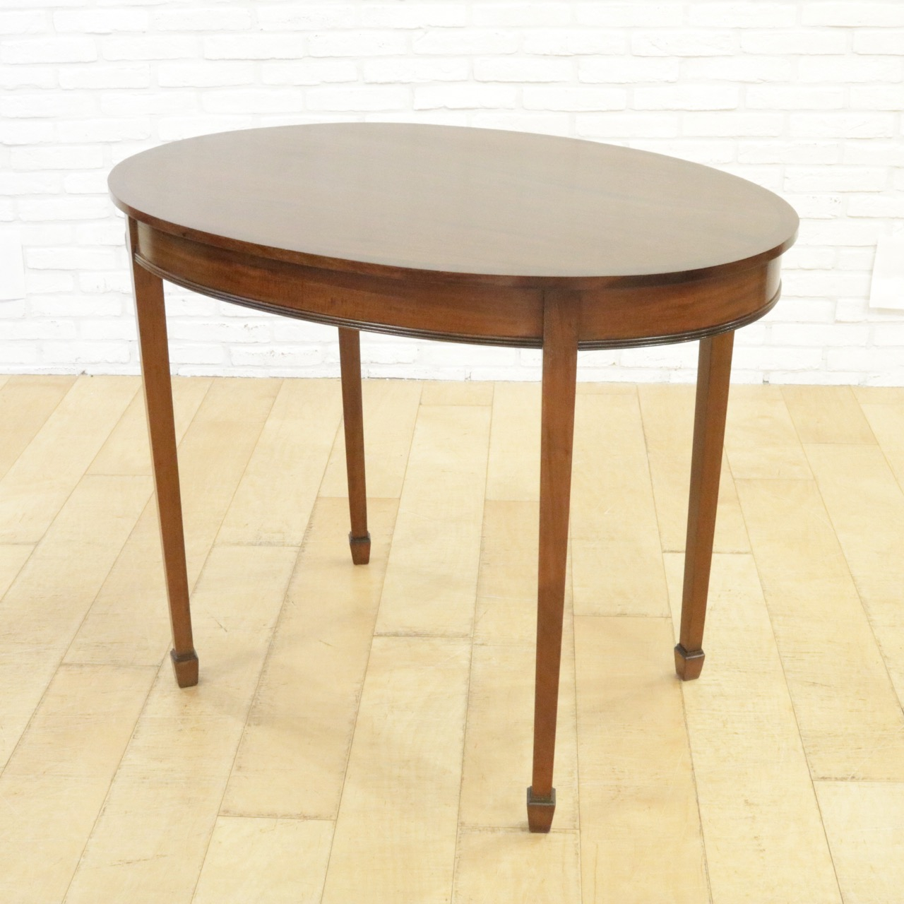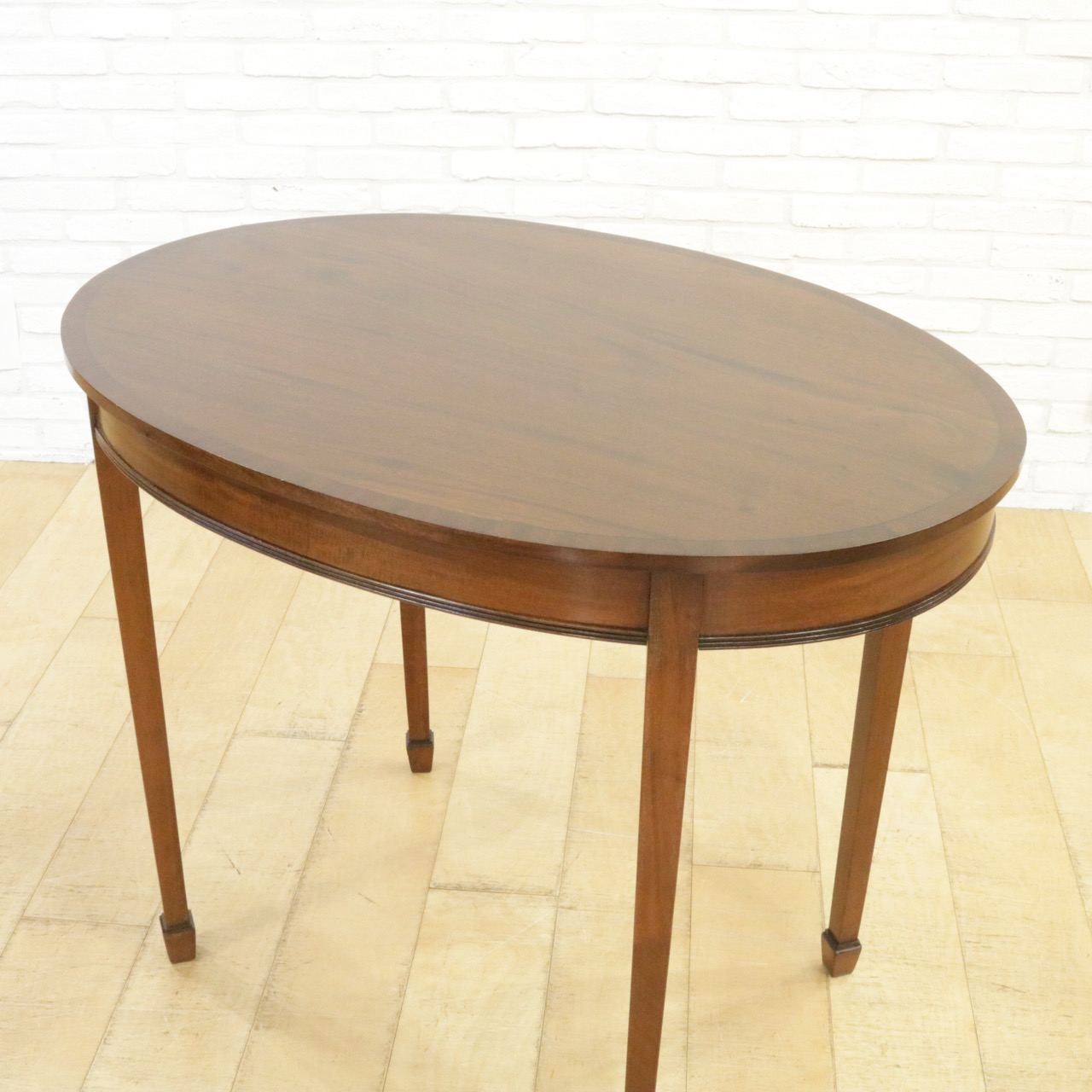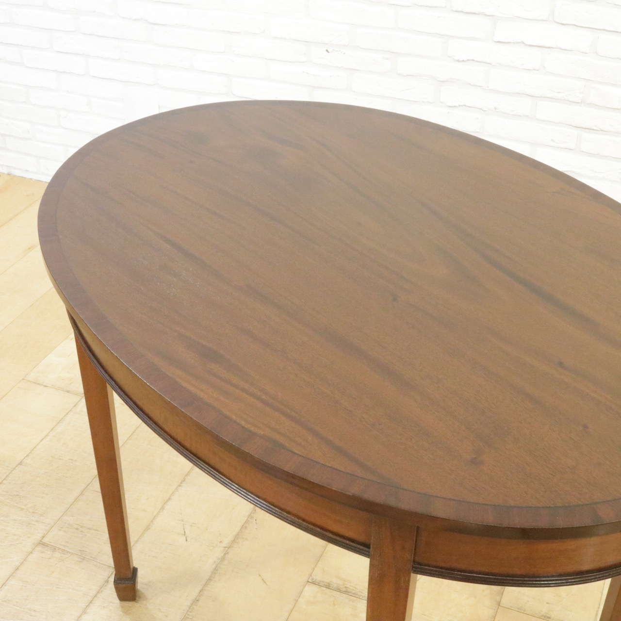 配送料の目安 ▶︎1930年代、マホガニーのオケージョナルテーブル。優雅なオーバル型に、縁を囲まれた天板はマホガニーらしい滑らかで深みのある杢目が美しく引き立ちます。